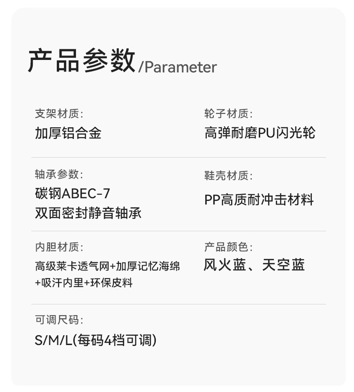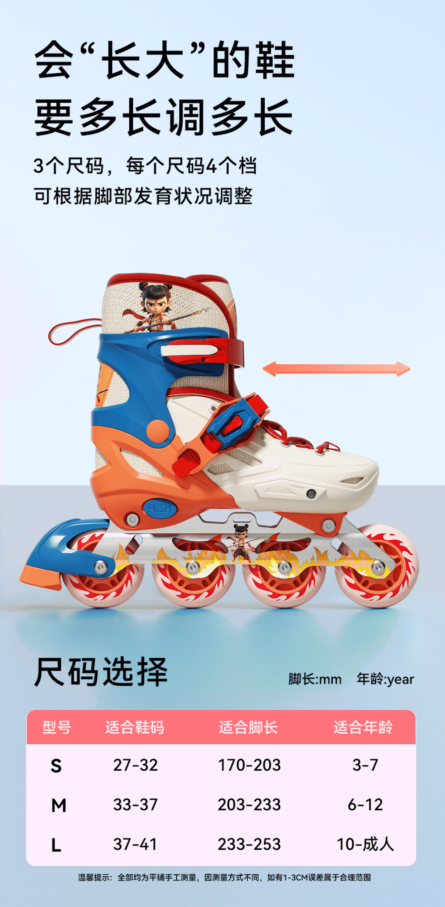 鞋码 S码【4档可调】【适合3-7岁】平时鞋码27-30,M码【4档可调】【适合6-12岁】平时鞋码31-34,L码【4档可调】【适合10岁-成人】平时鞋码35-39