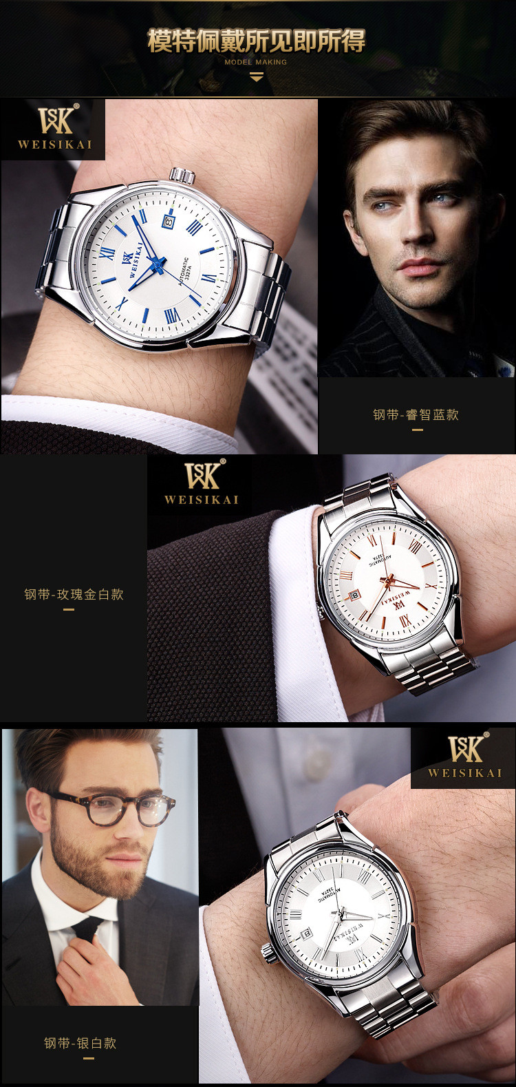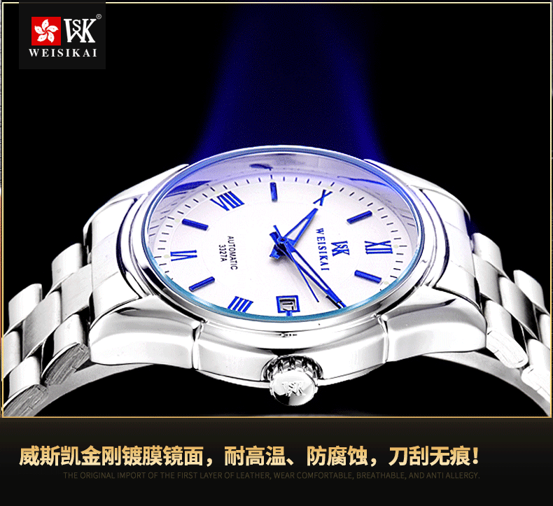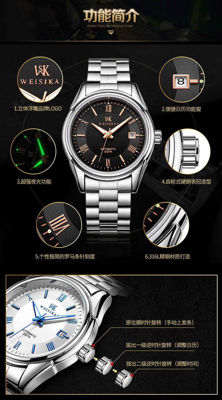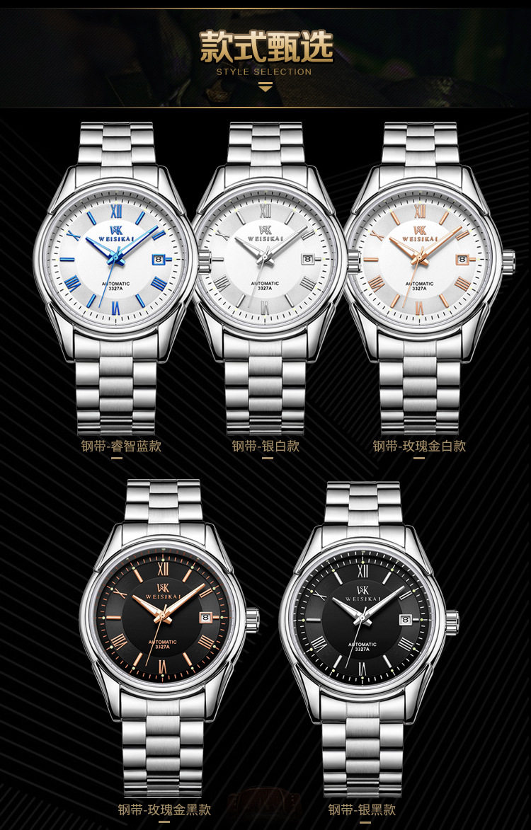 颜色分类 精钢 黑面 银丁(瑞士进口),精钢 黑面 玫丁(瑞士进口),精钢 白面 银丁(瑞士进口),精钢 白面 玫丁(瑞士进口),精钢 白面 蓝丁(瑞士进口)