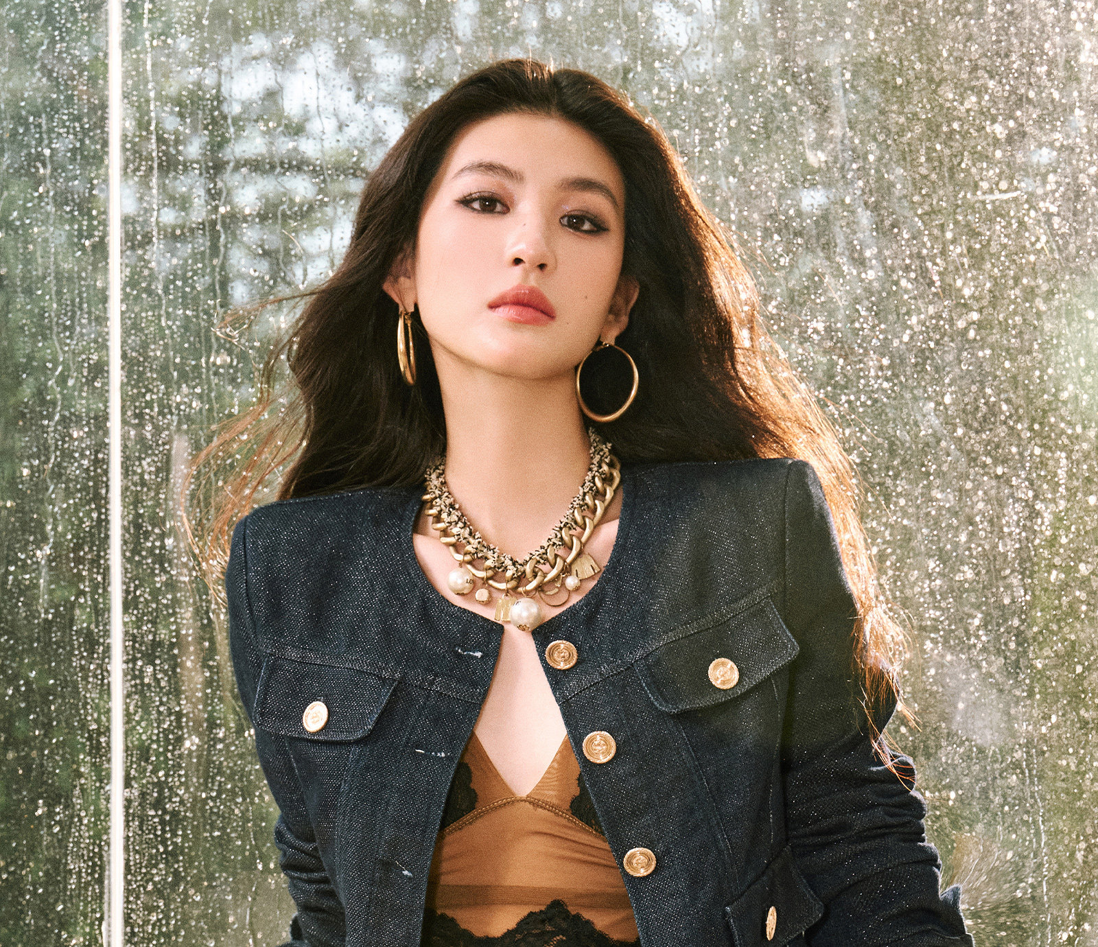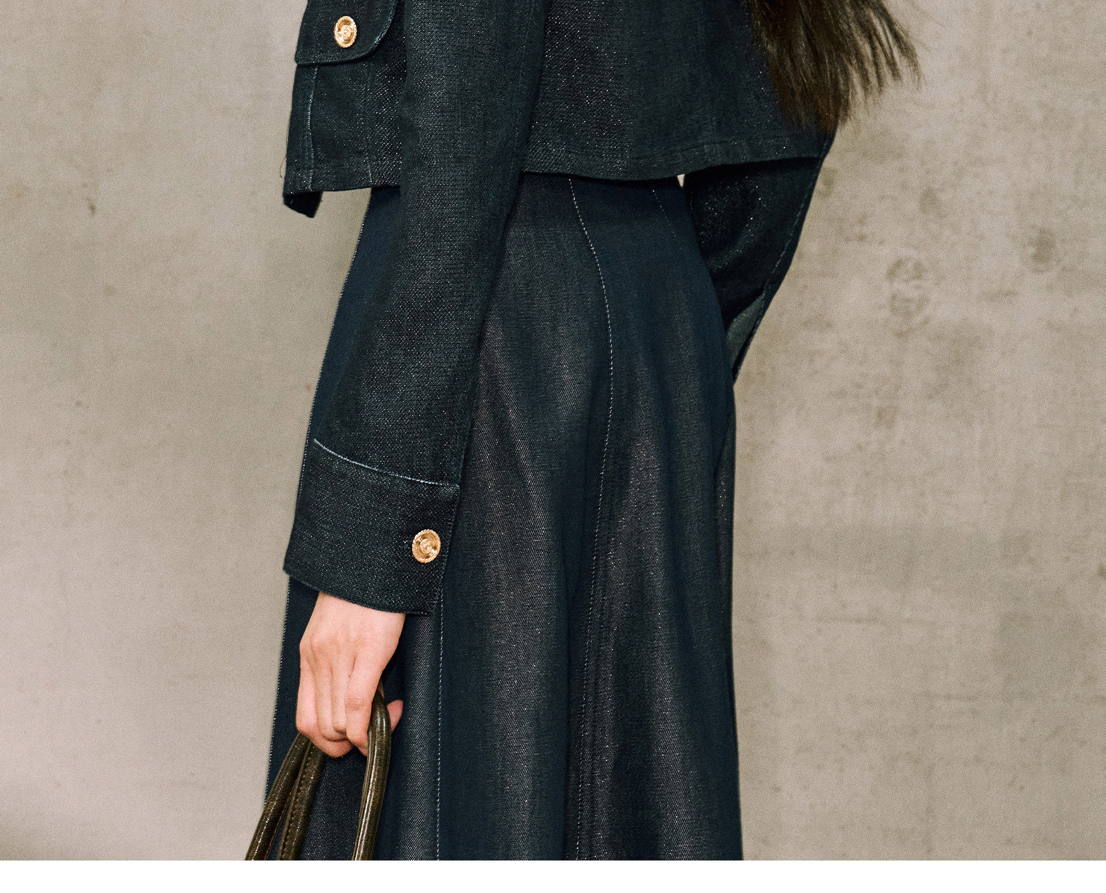 WANGXO|Изысканный блестящий шелковый твил, классическая натуральная кожа|Трехмерные накладные карманы, укороченный жакет до плеч и расклешенная юбка