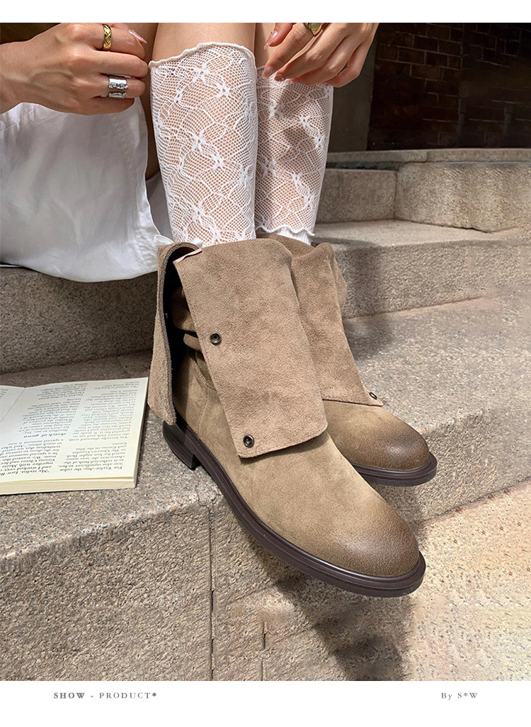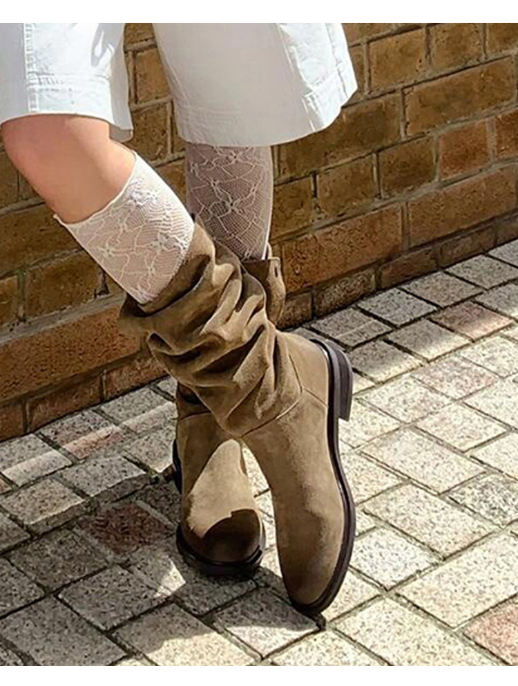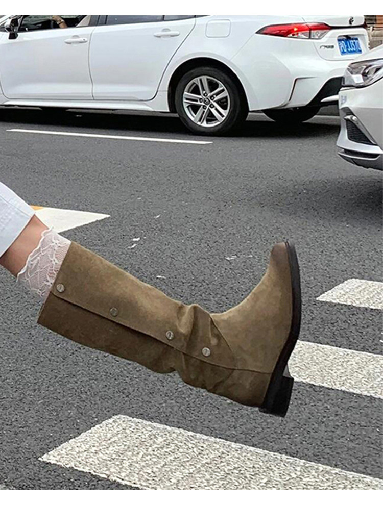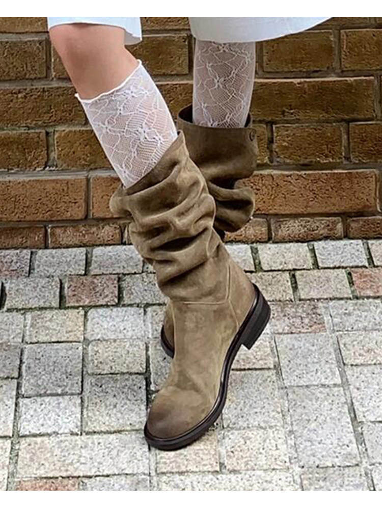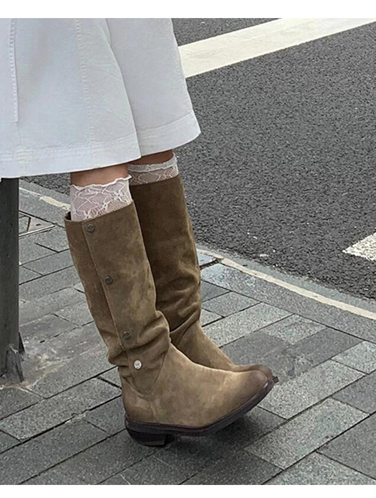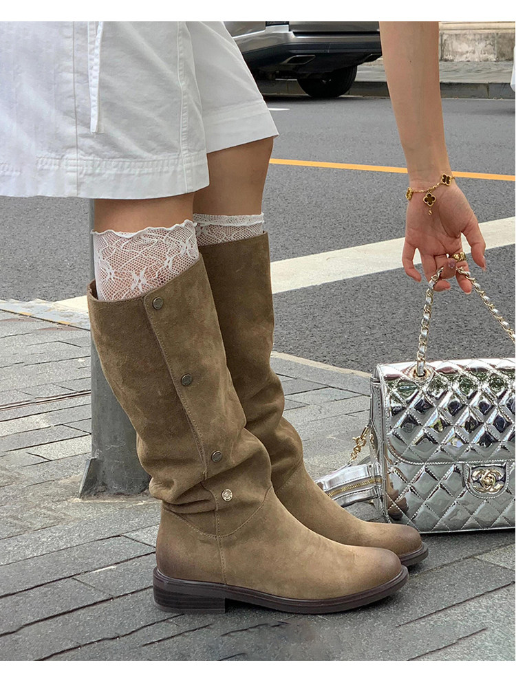 Версия из воловьей кожи~Женские высокие сапоги до колена в стиле У Цяньюй с ретро-пряжкой, двусторонние, с эффектом похудения, с драпировкой и эффектом многослойности.