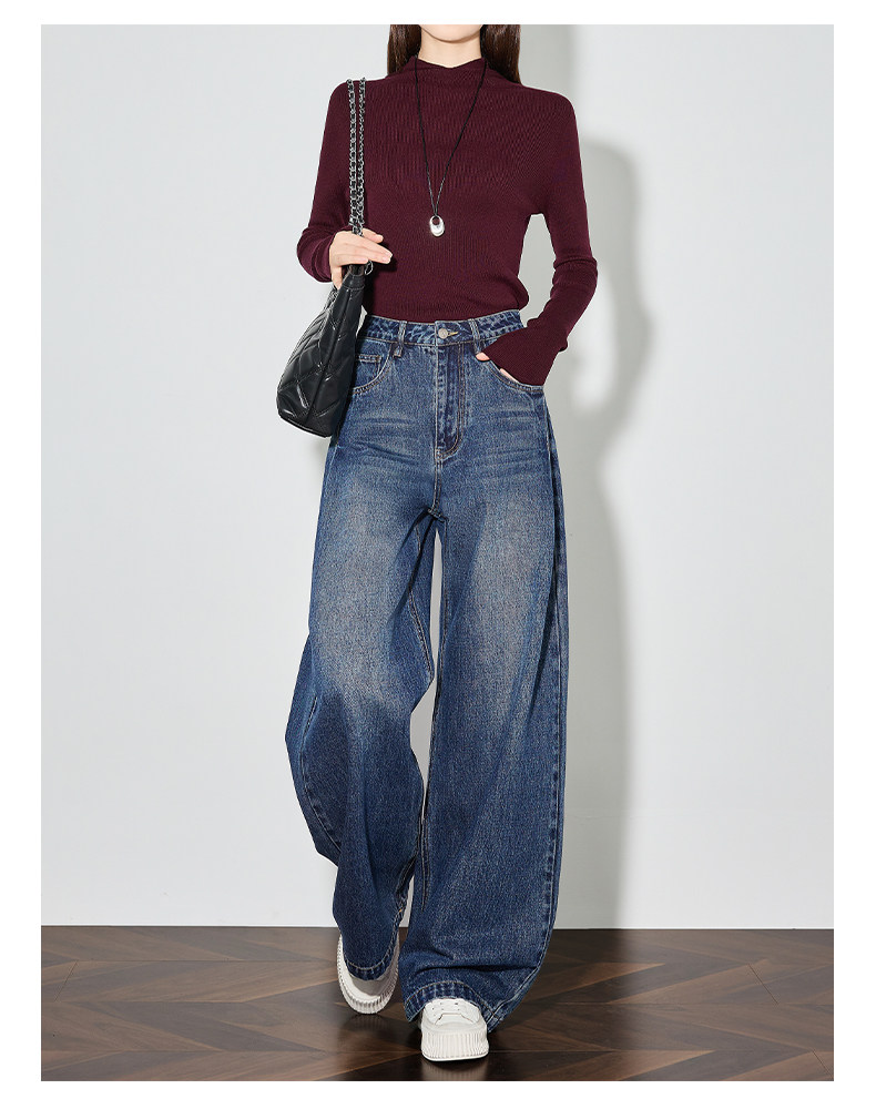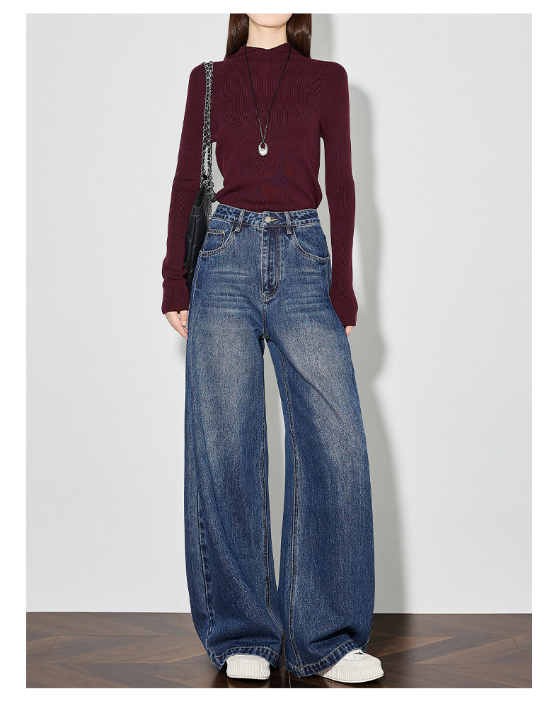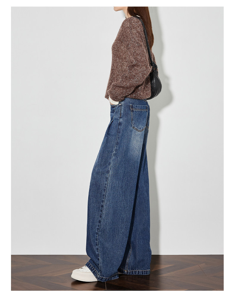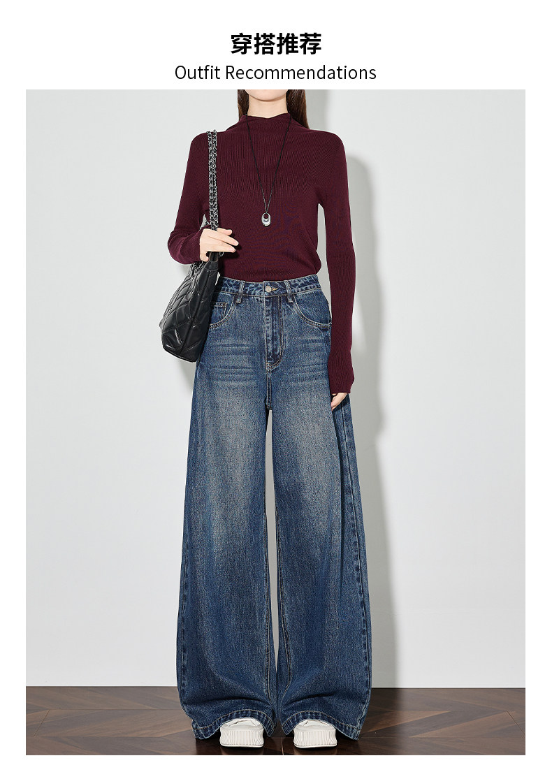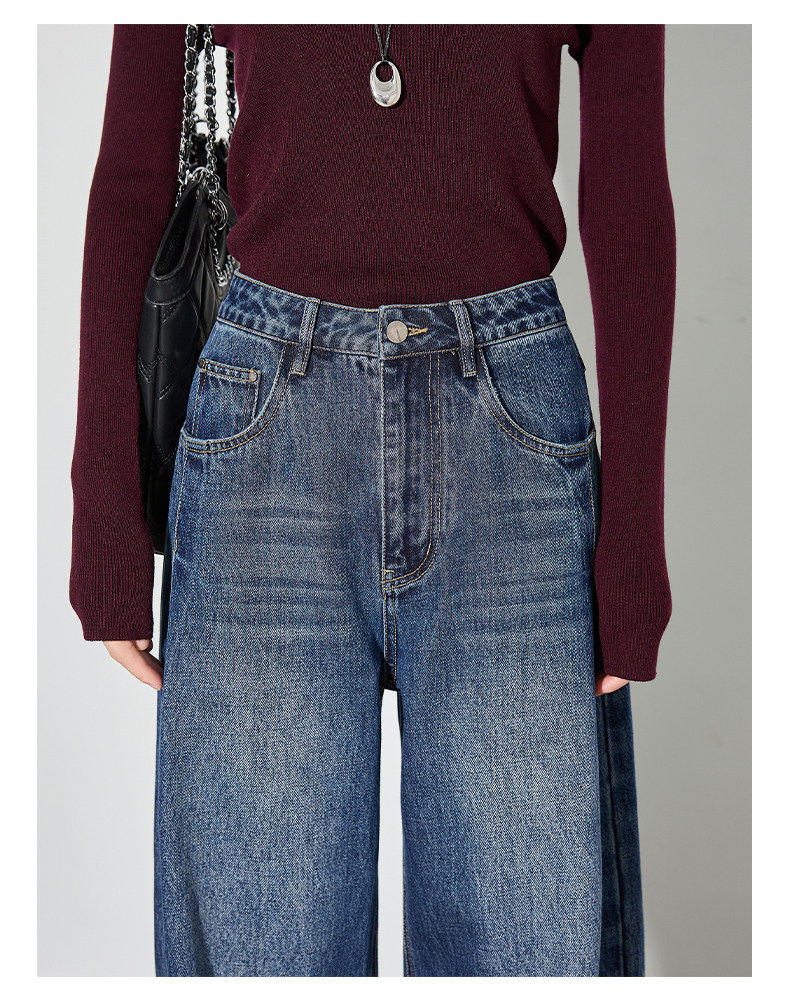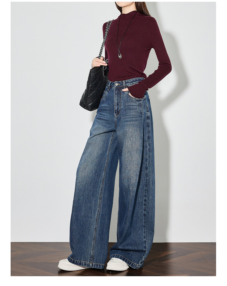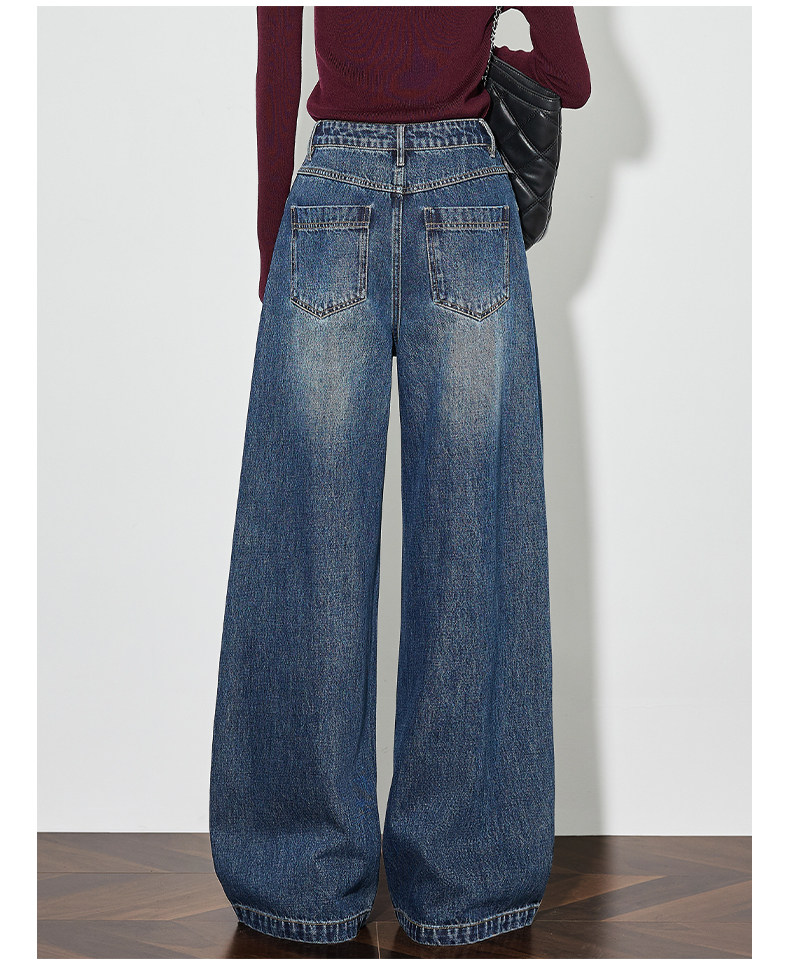Faesslin Blue Retro Jeans for Women, New Autumn Style, Tall and Long, High-Waisted, Loose Straight-Leg Wide-Leg Pants