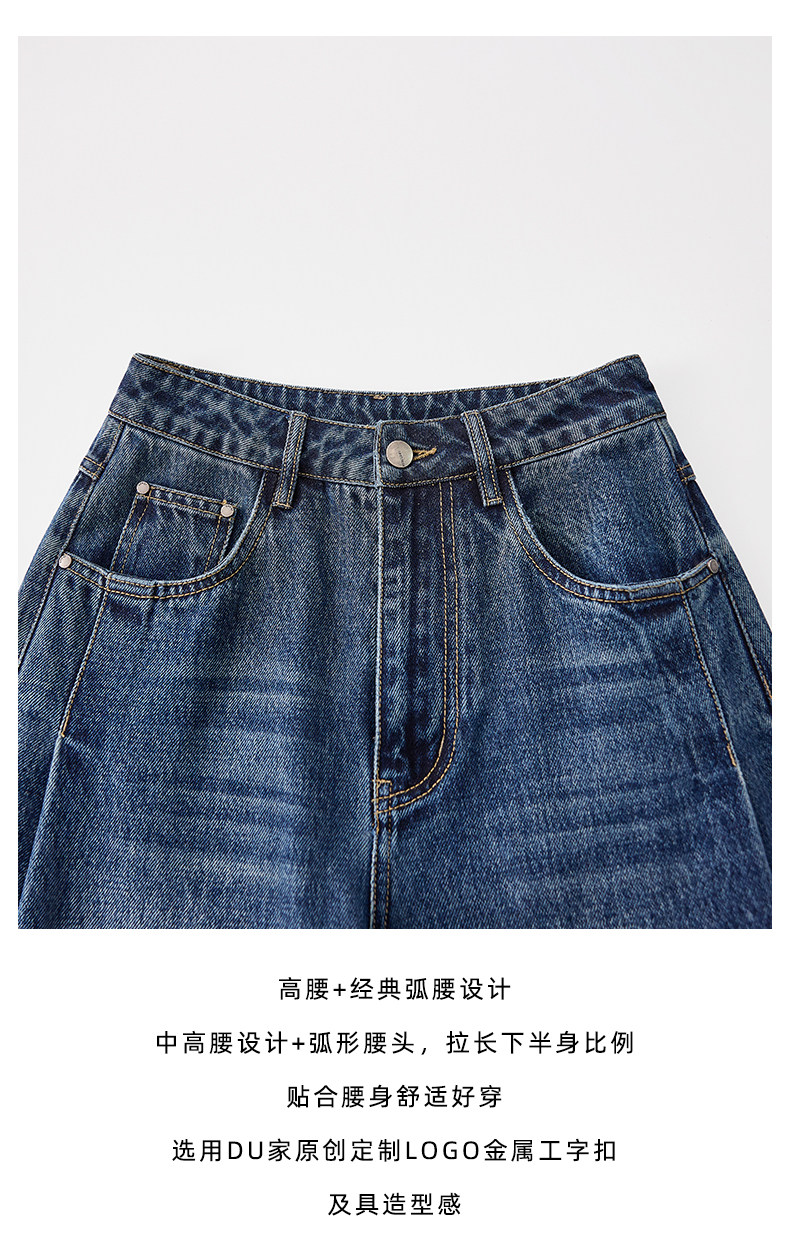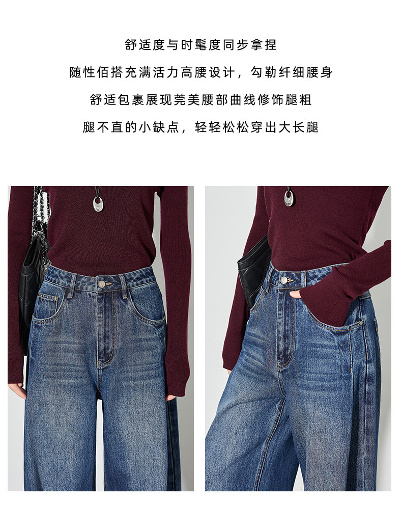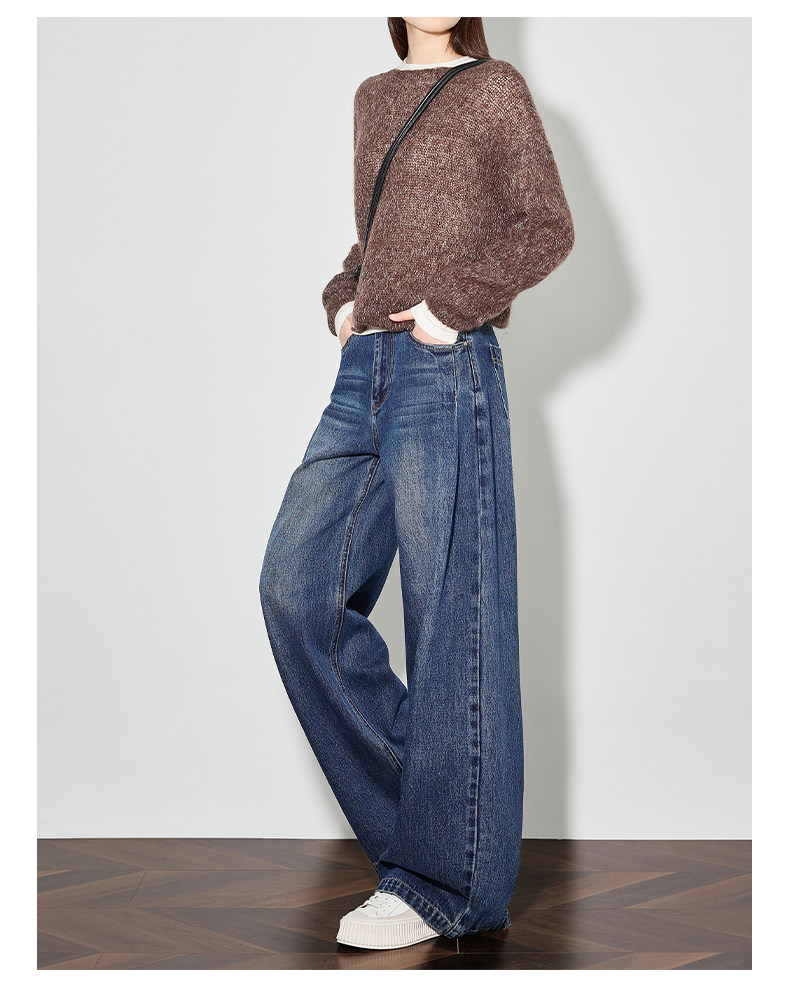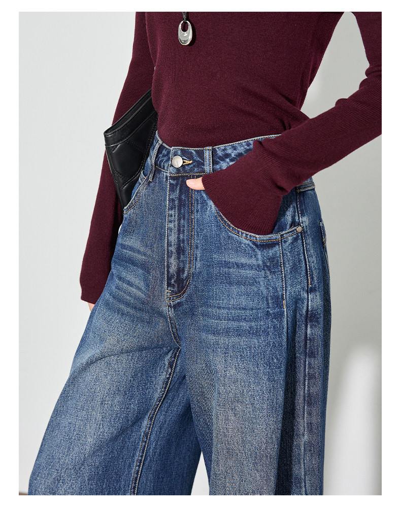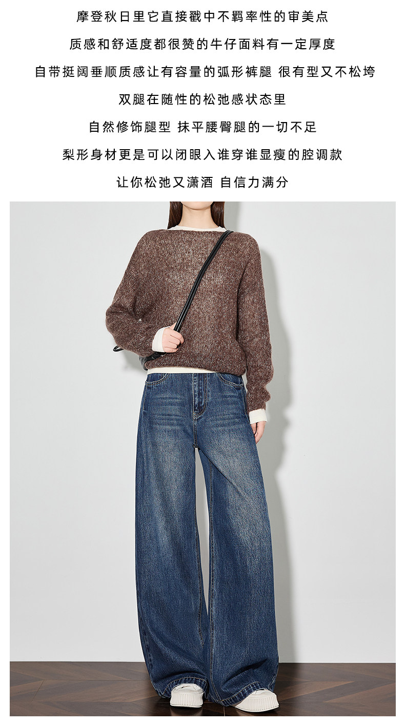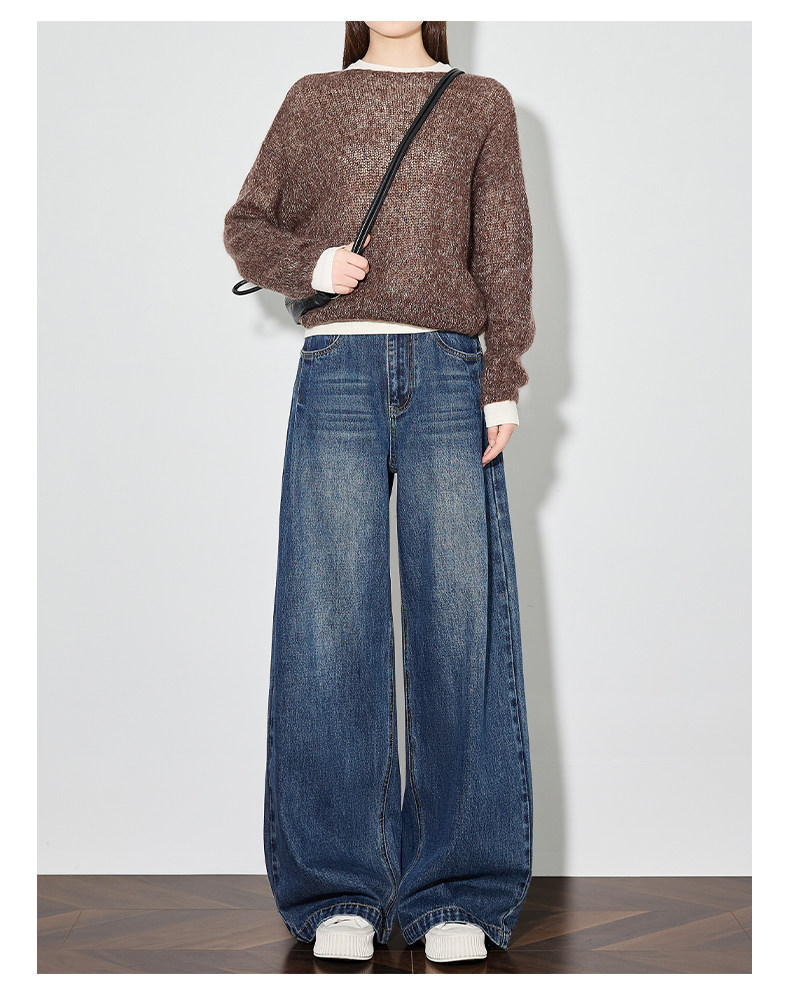 Faesslin Blue Retro Jeans for Women, New Autumn Style, Tall and Long, High-Waisted, Loose Straight-Leg Wide-Leg Pants