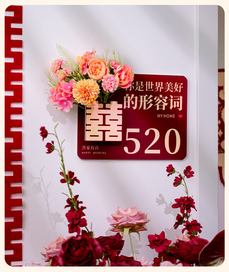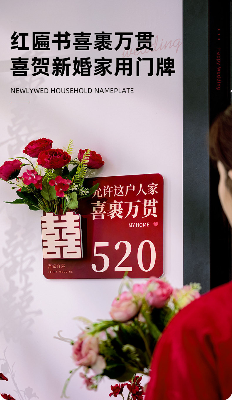The Newlywed Couple's Bedroom Door Is Decorated with Artificial Flowers to Create a Festive Atmosphere, and the Entrance Door Is Decorated with Wedding Stickers with the Character for Happiness