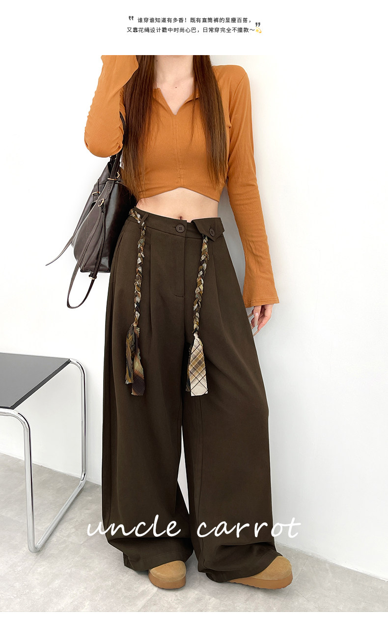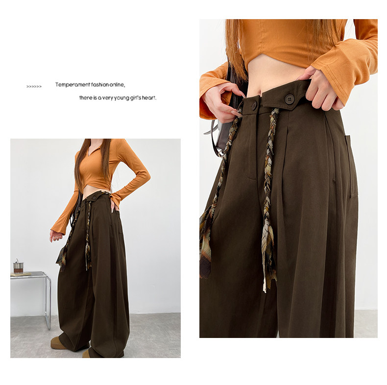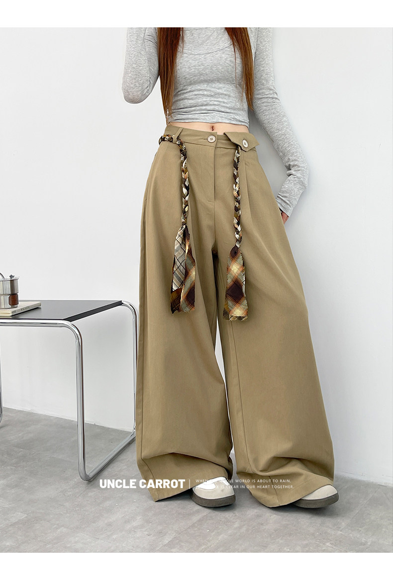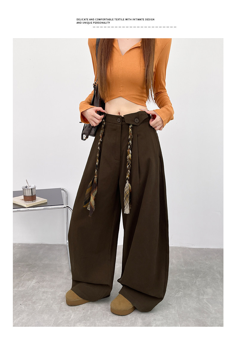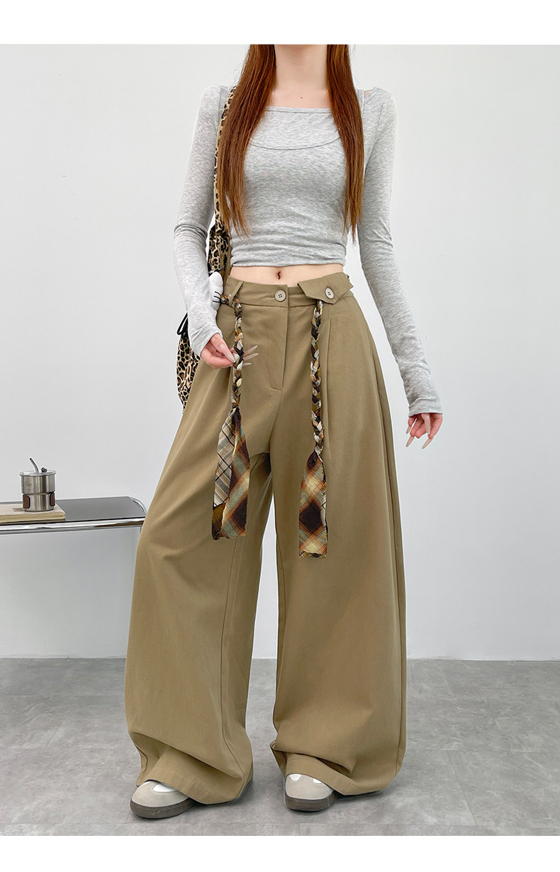 Khaki American Retro Suit Pants Women's Autumn 2025 New High Waist Lace Flower Rope Lazy Scimitar Wide Leg Pants