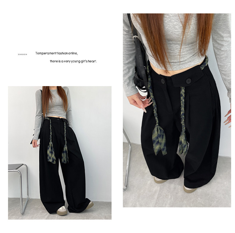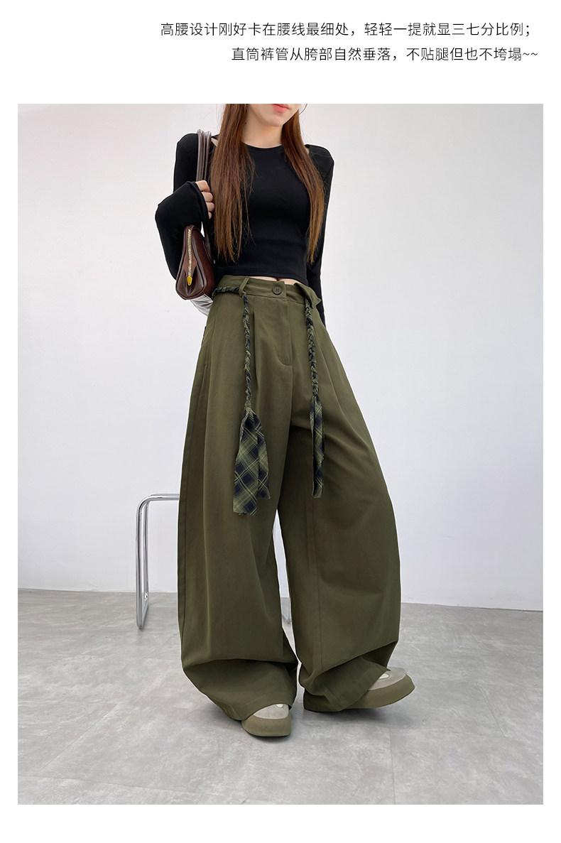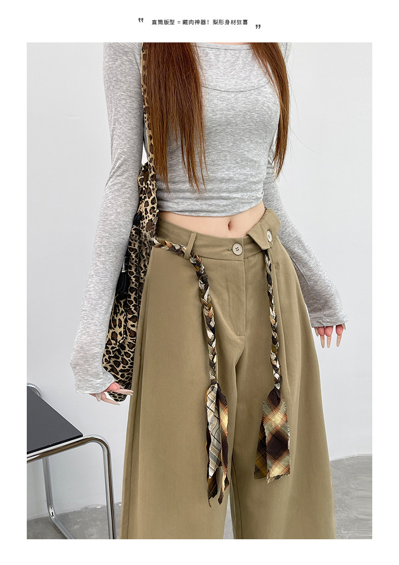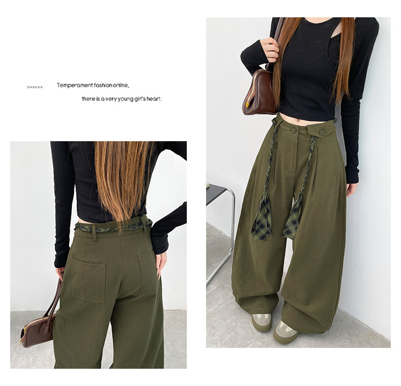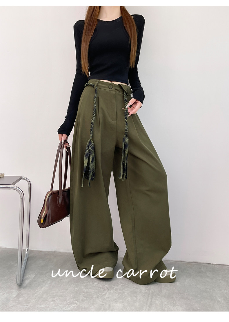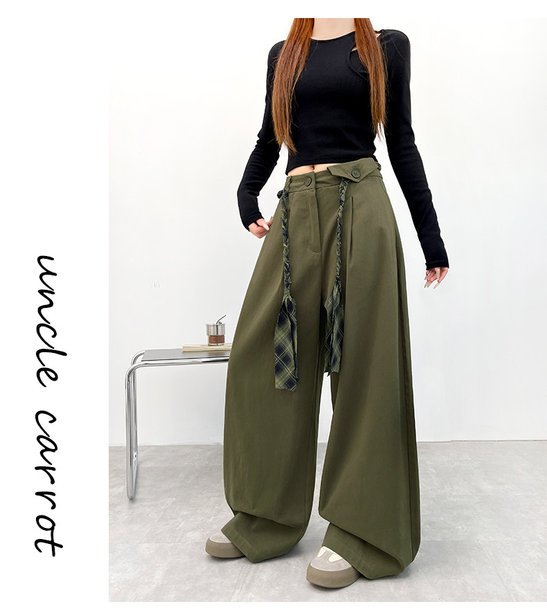 Khaki American Retro Suit Pants Women's Autumn 2025 New High Waist Lace Flower Rope Lazy Scimitar Wide Leg Pants
