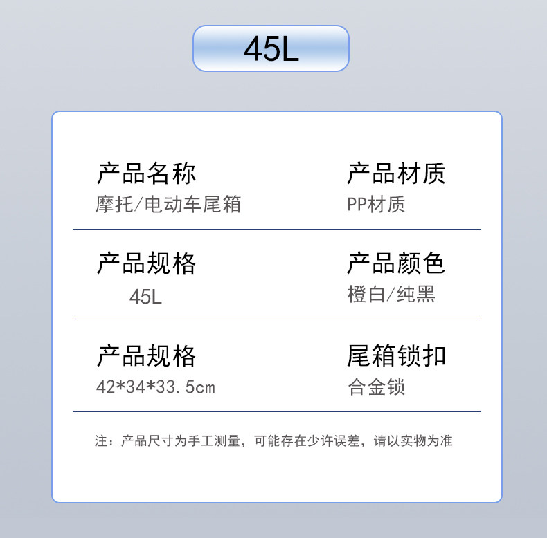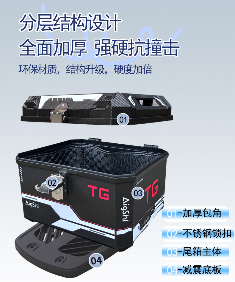 Color Classification Black 45L Tail Box + Shock-Absorbing Base + Lining,Gray 45L Tail Box + Shock-Absorbing Base + Lining,Silver 45L Tail Box + Shock-Absorbing Base + Lining,Pure Black 45L Tail Box + Shock-Absorbing Base + Lining