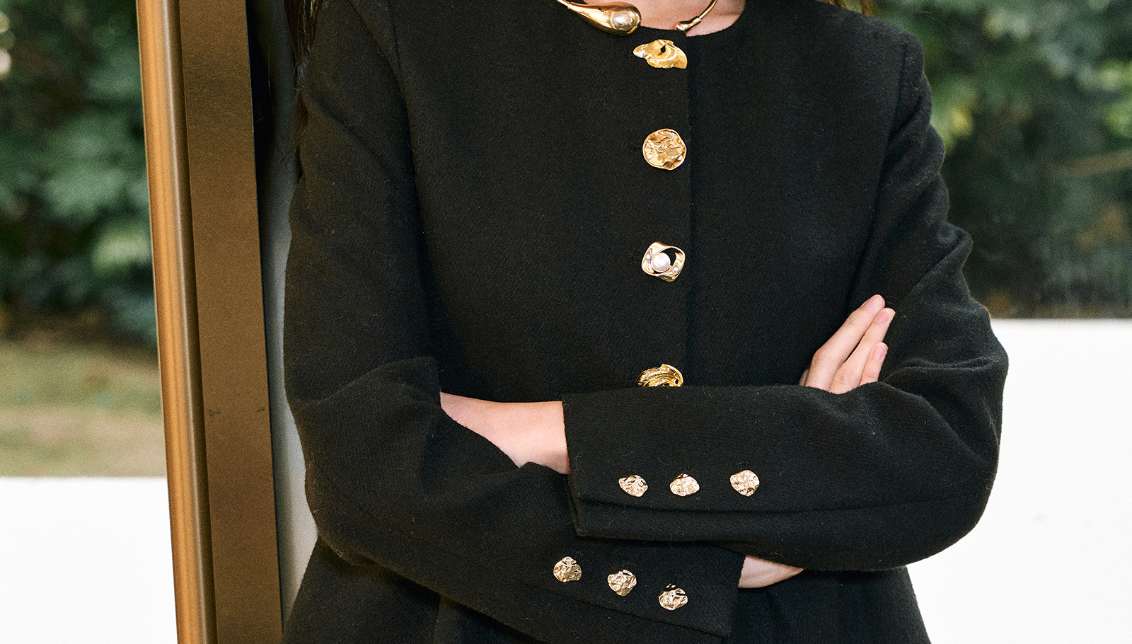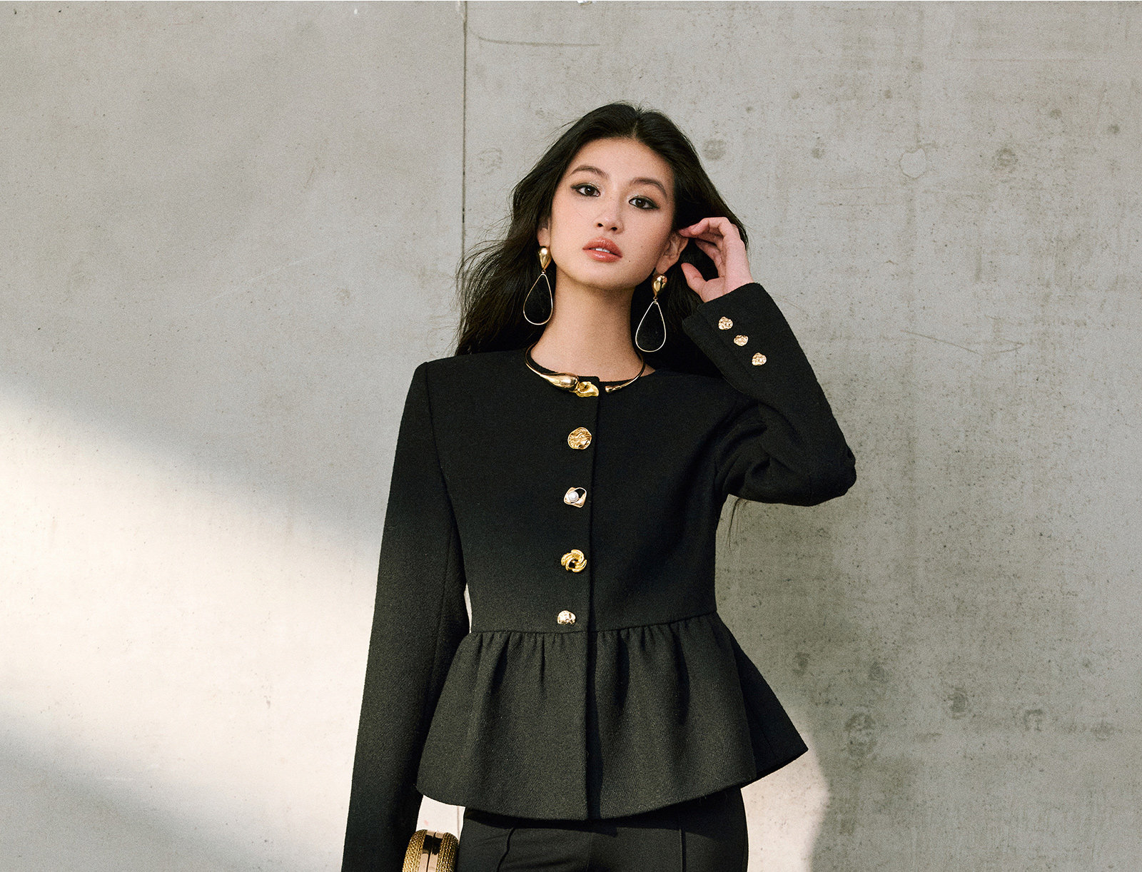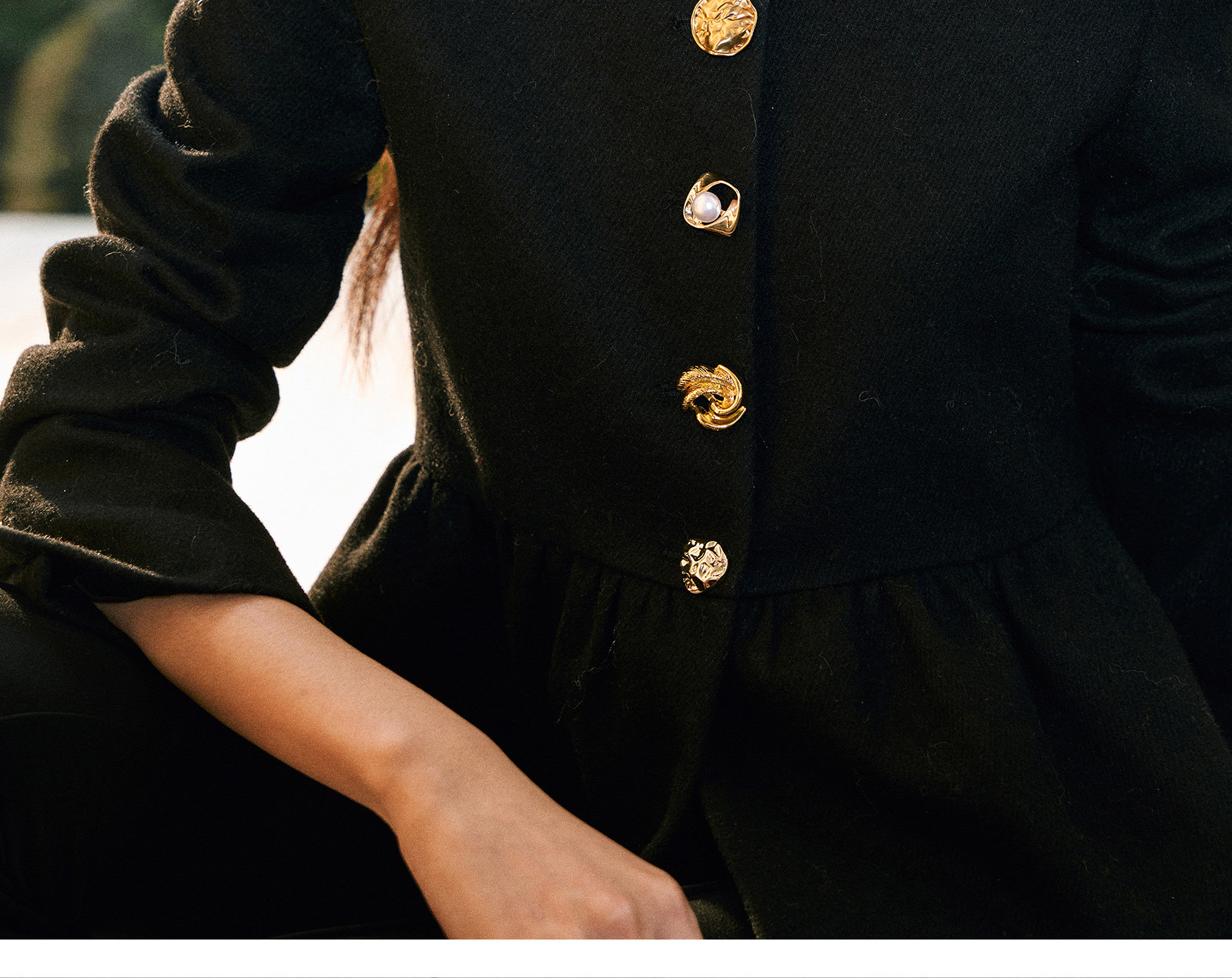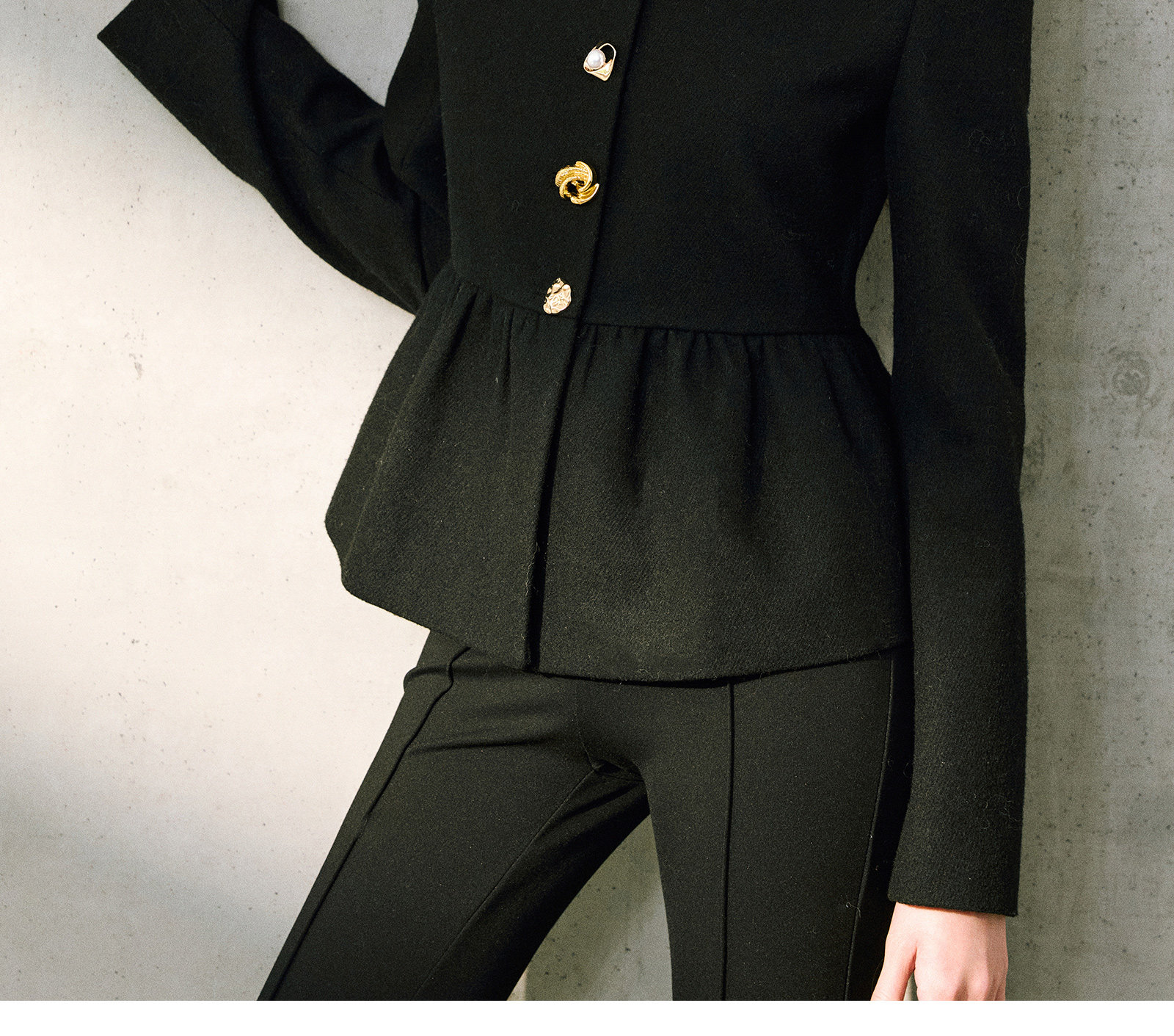 Wangxo|Premium Custom-Woven Woolen Fabric|Floral Waist-Cinching Irregular Buttoned Round-Neck Short Coat