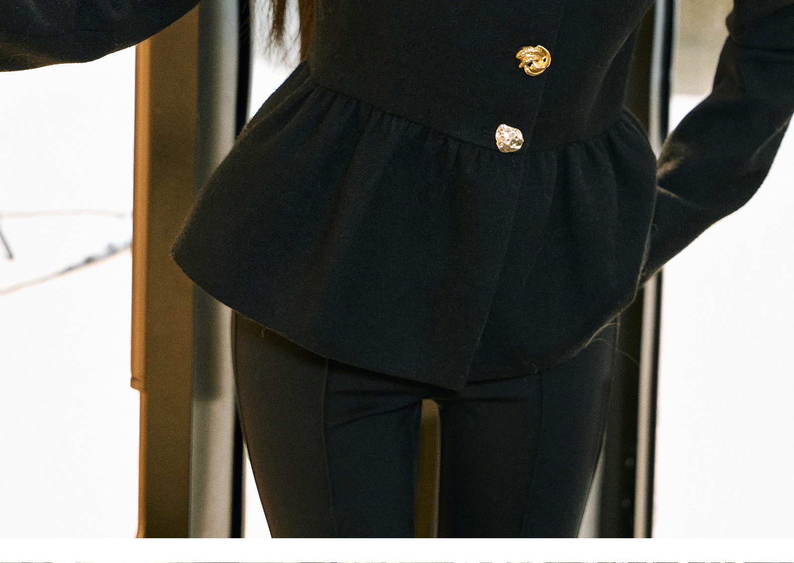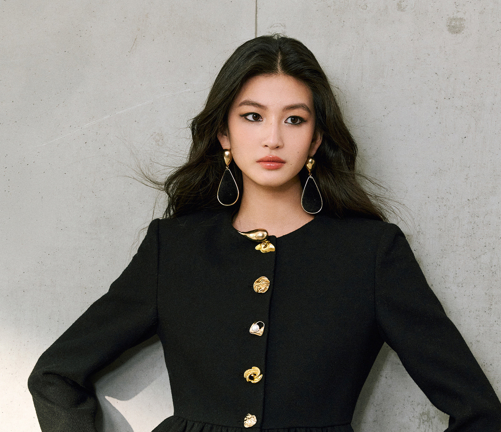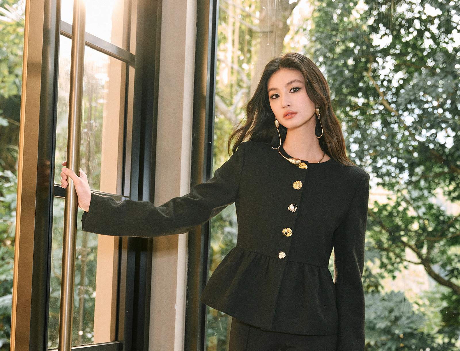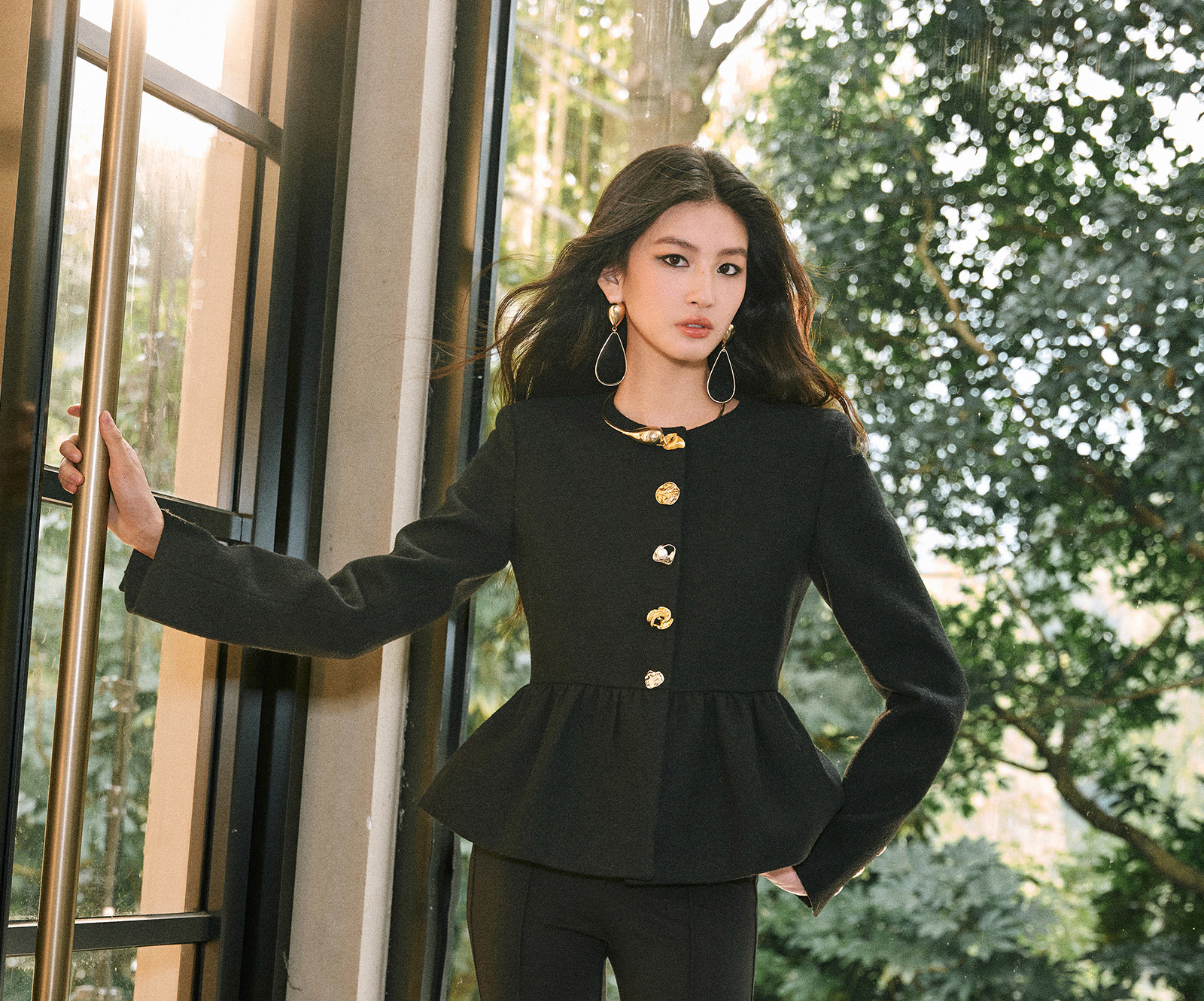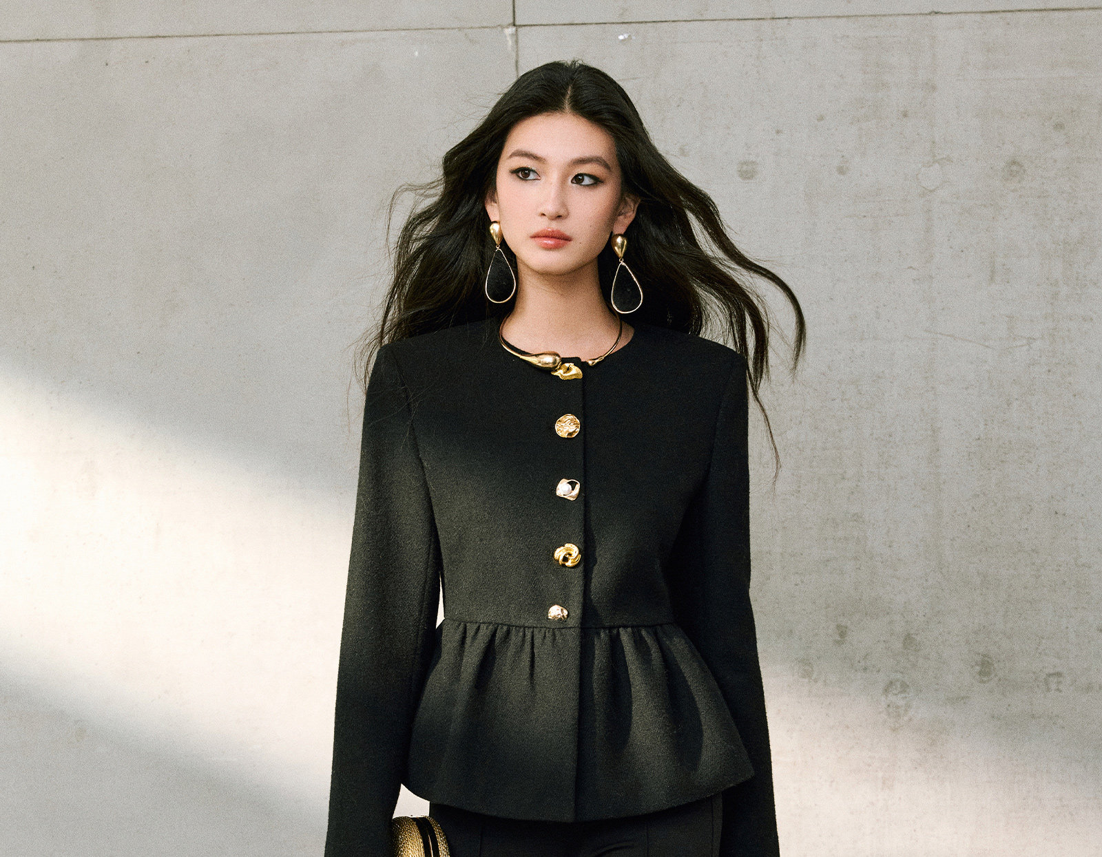 Wangxo|Premium Custom-Woven Woolen Fabric|Floral Waist-Cinching Irregular Buttoned Round-Neck Short Coat