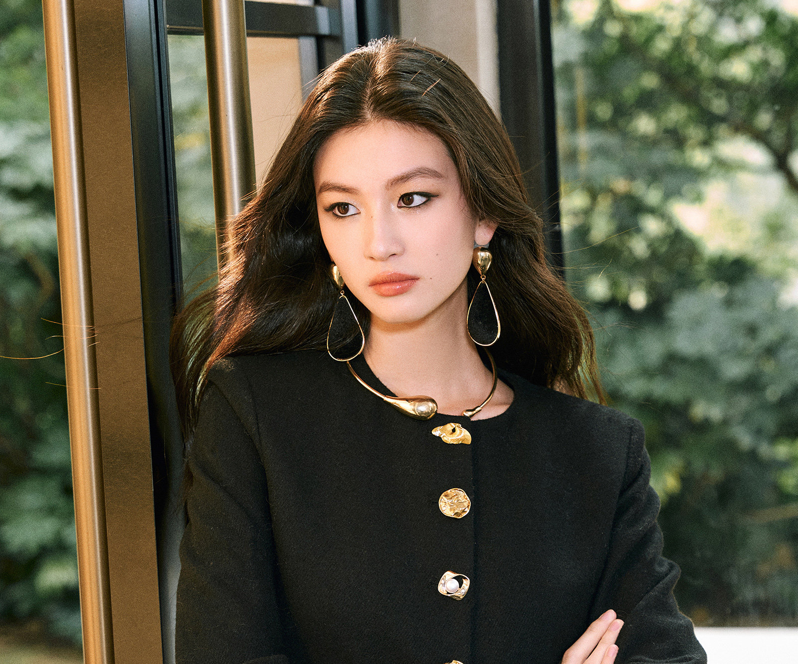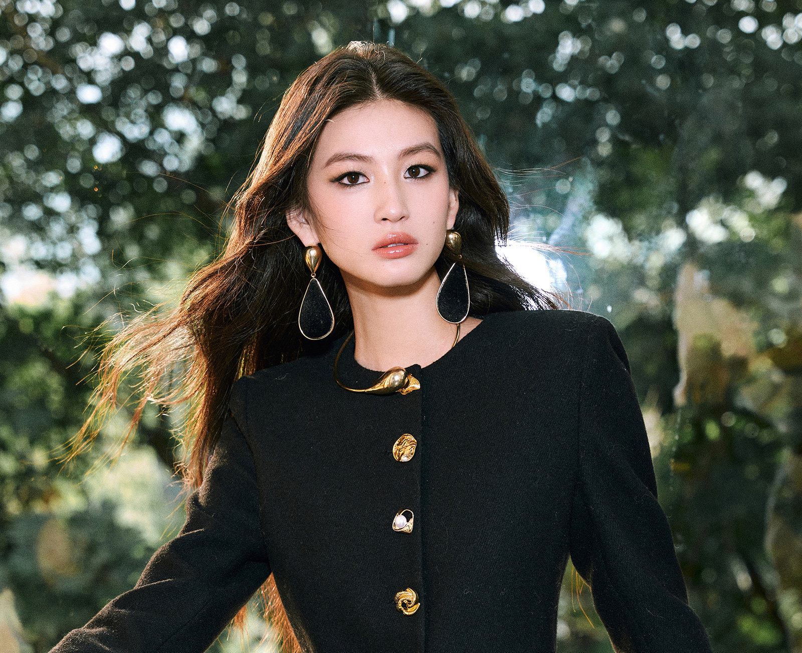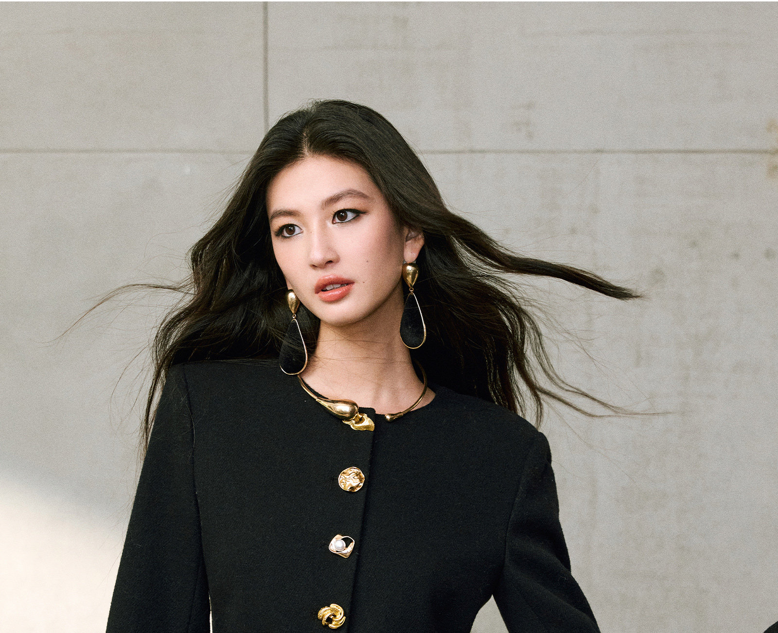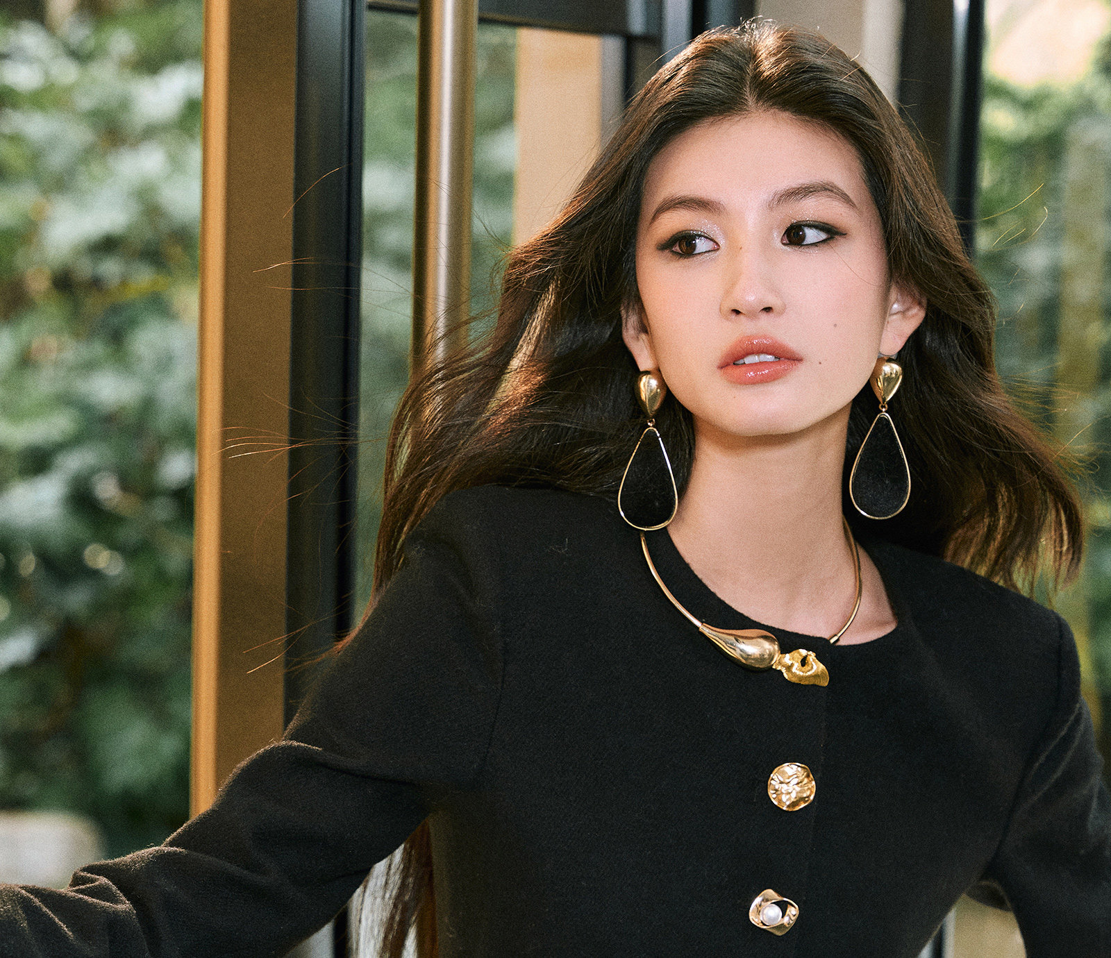 Wangxo|Premium Custom-Woven Woolen Fabric|Floral Waist-Cinching Irregular Buttoned Round-Neck Short Coat