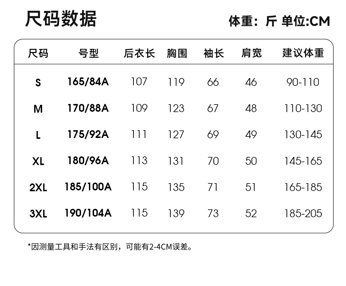 China (cm) 165 / 88-90 170 / 96-98 175 / 108-110 180 / 118-122 185 / 126-130