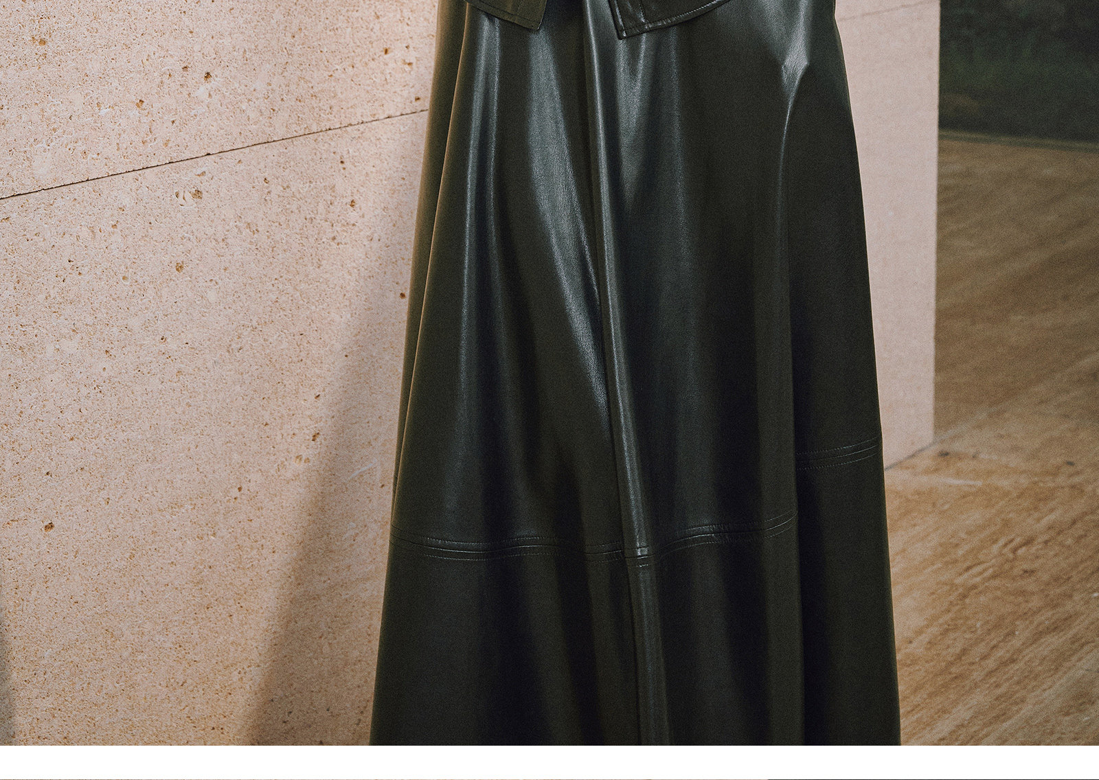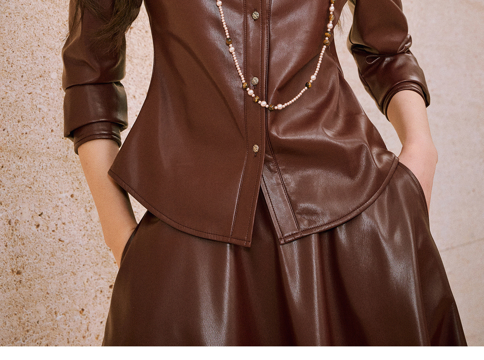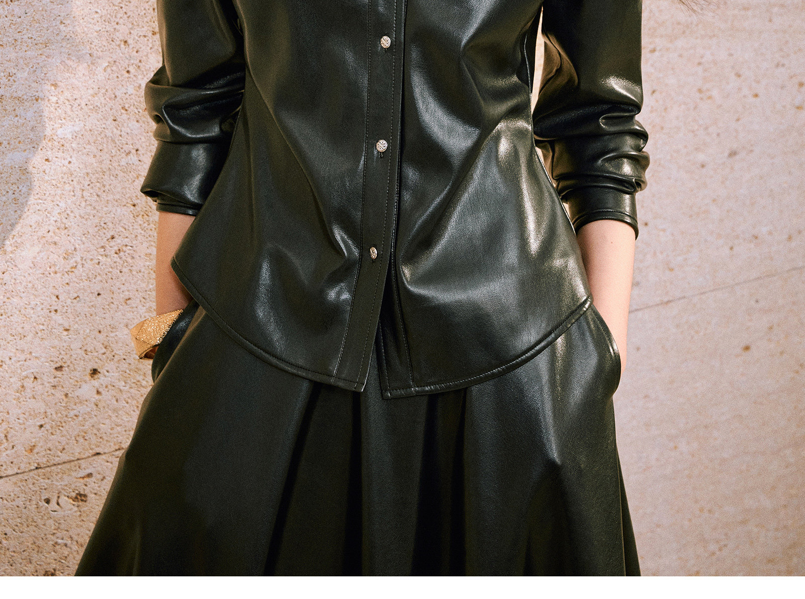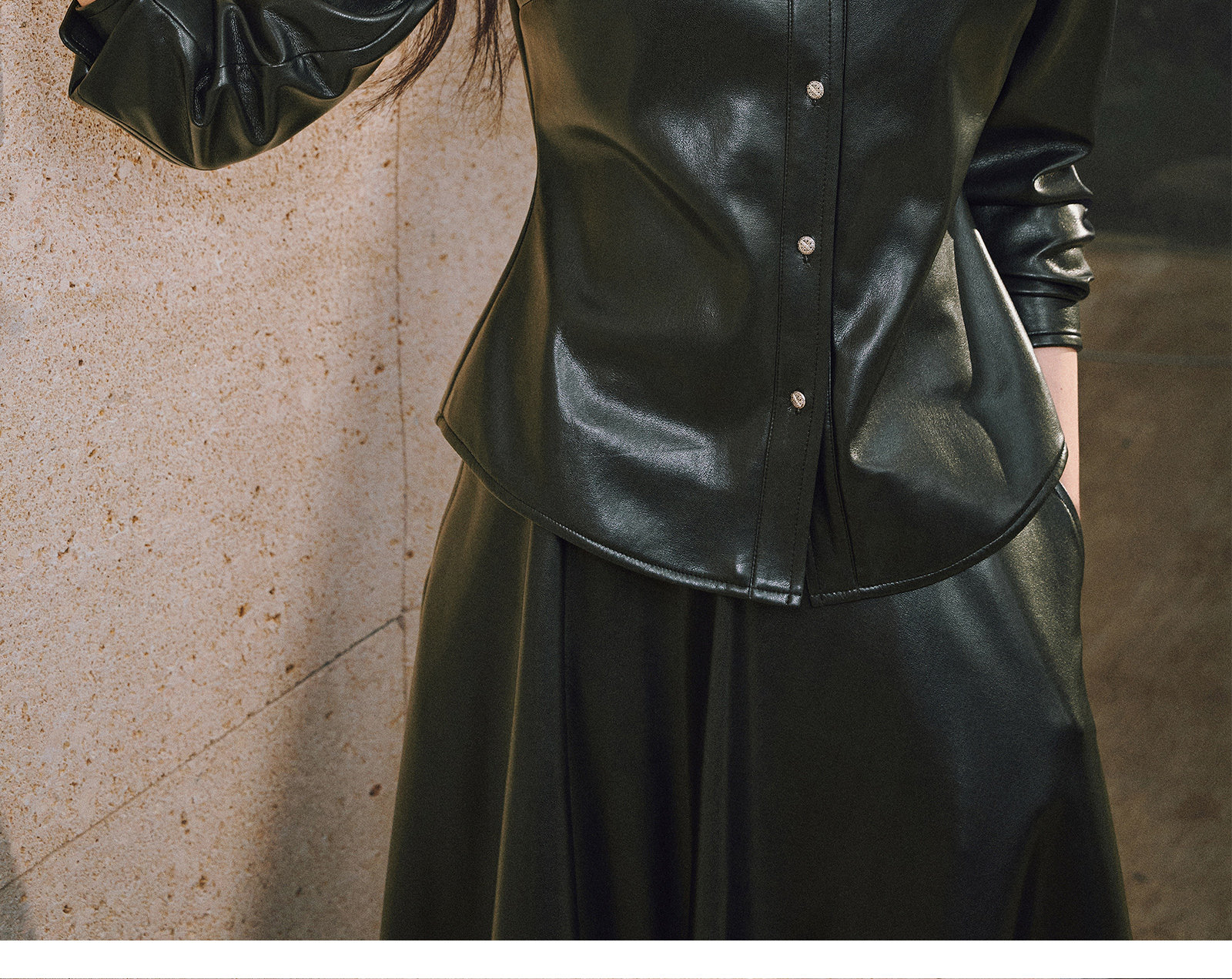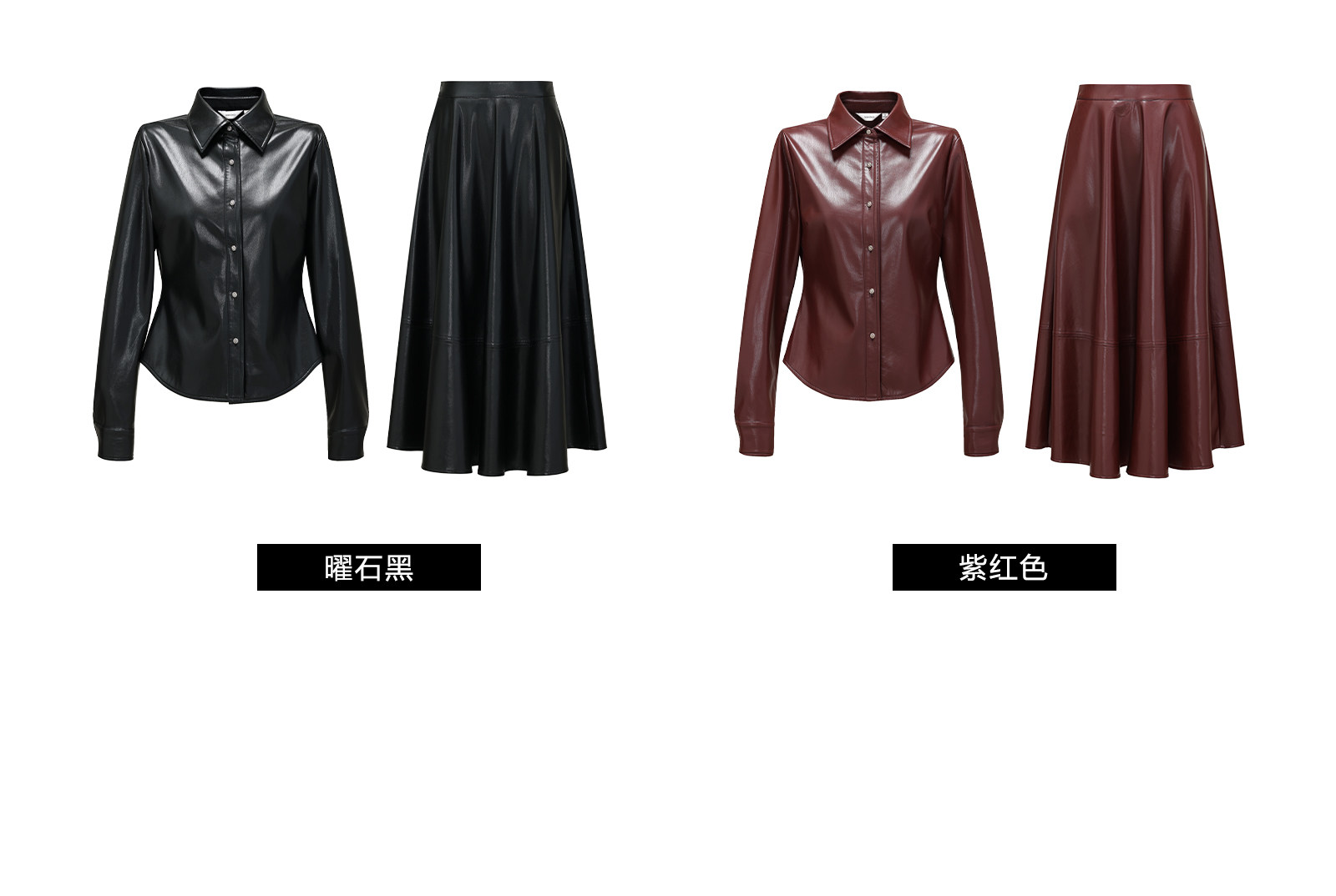 Wangxo|Genuine Leather Texture High-Density Protein Leather|Glossy Waist-Cinching Shirt & Multi-Panel Spliced Umbrella Skirt