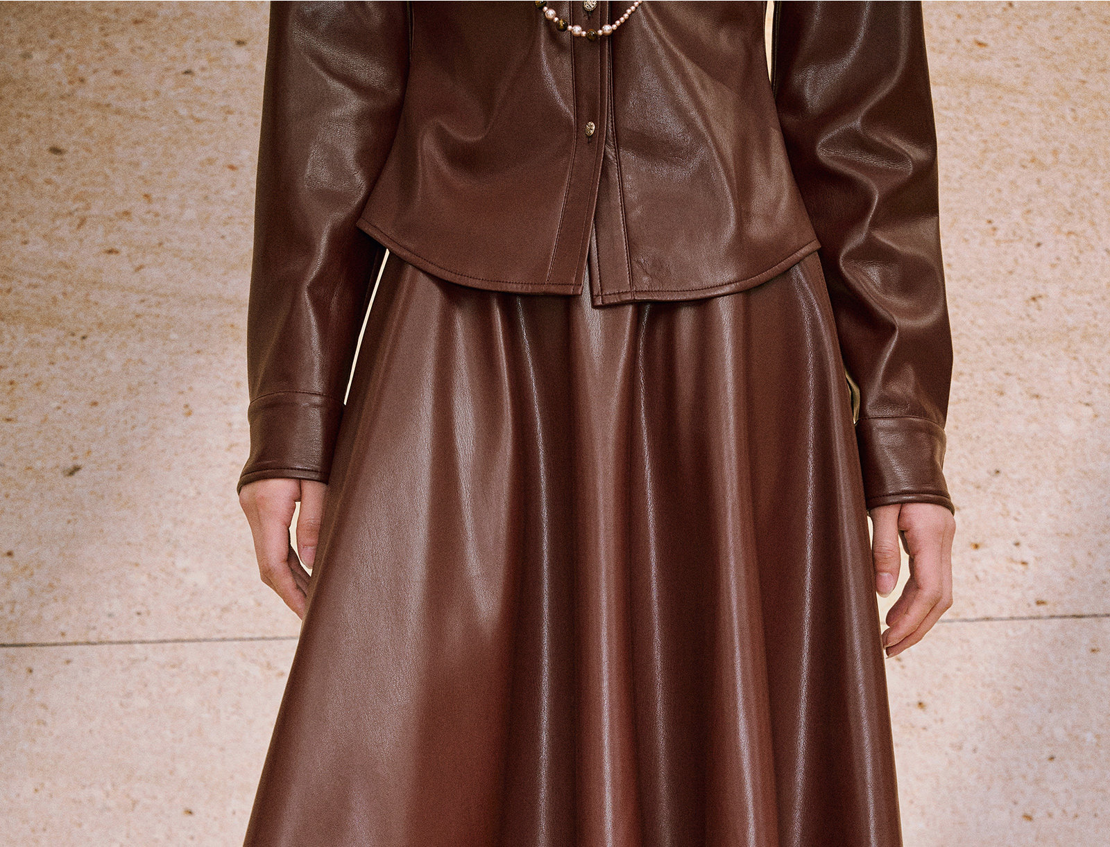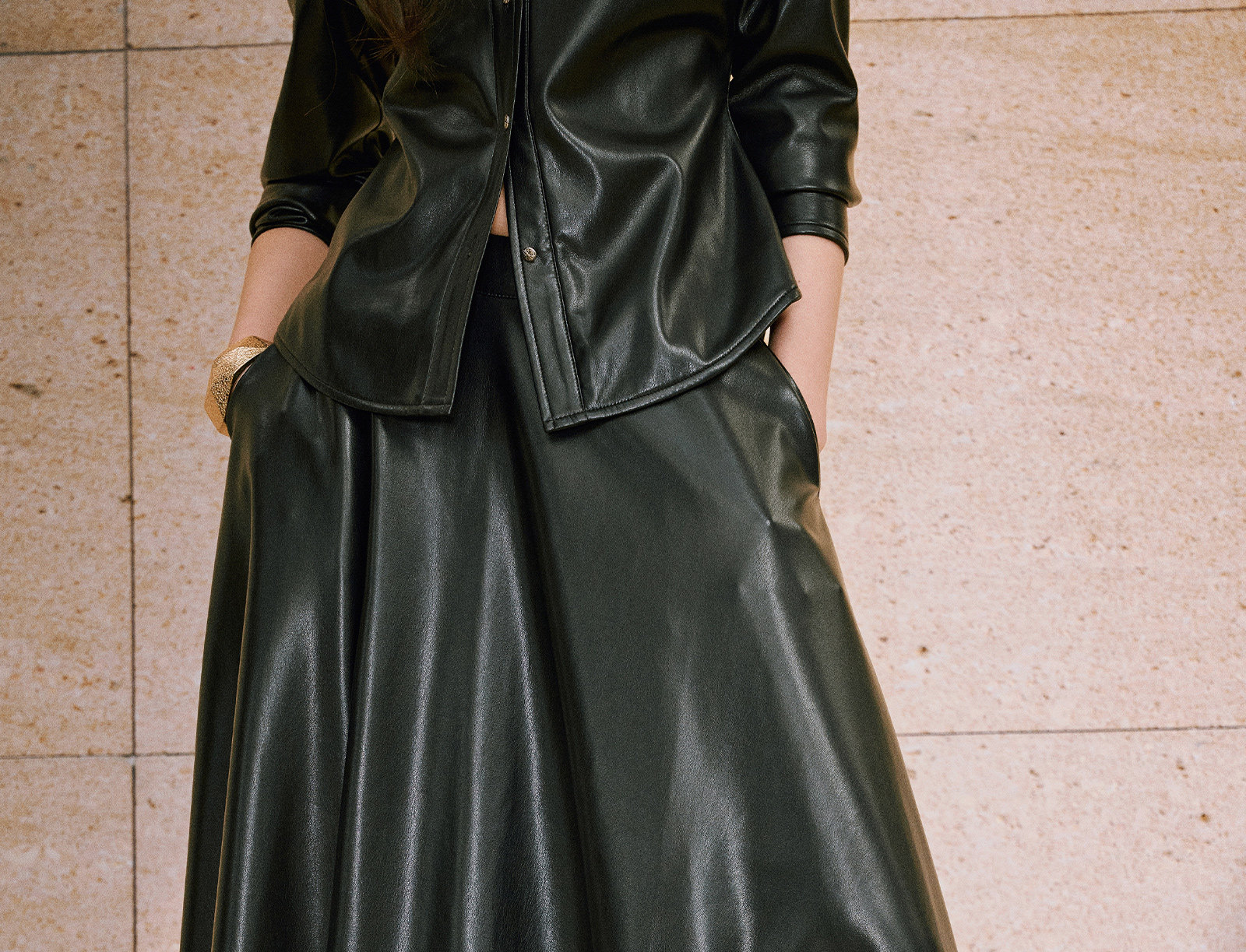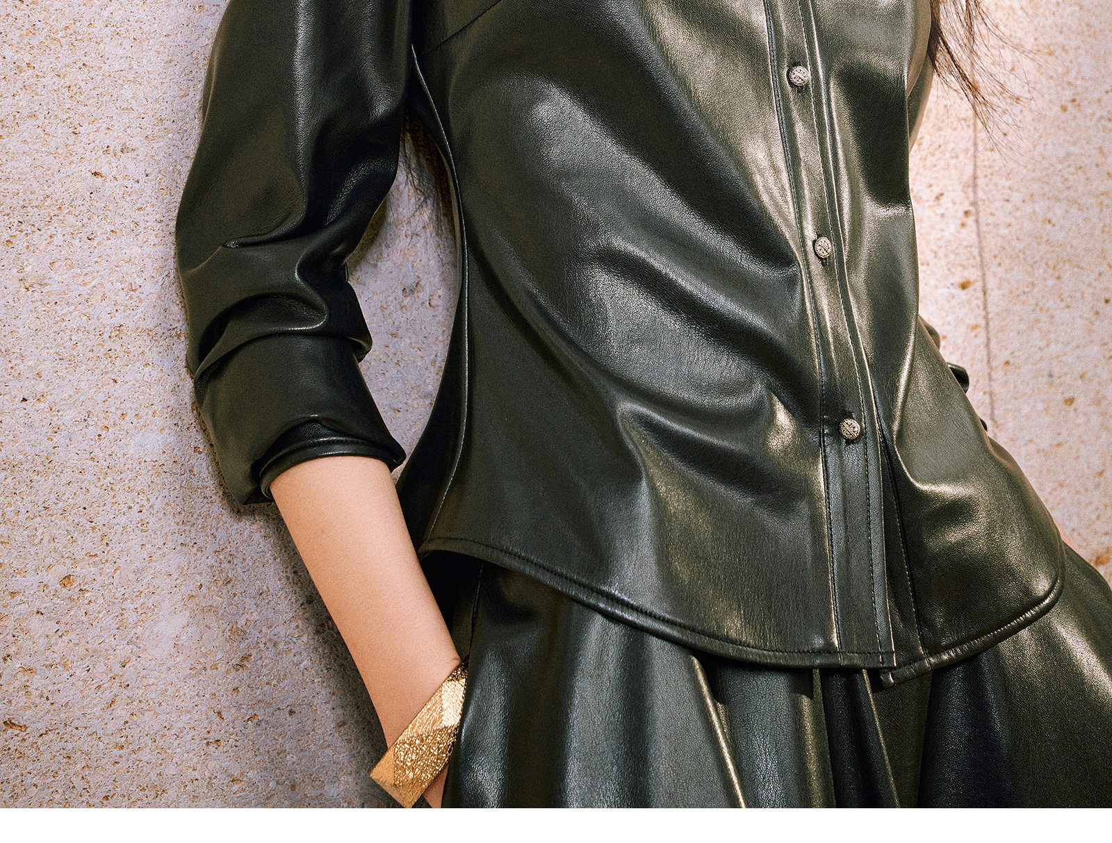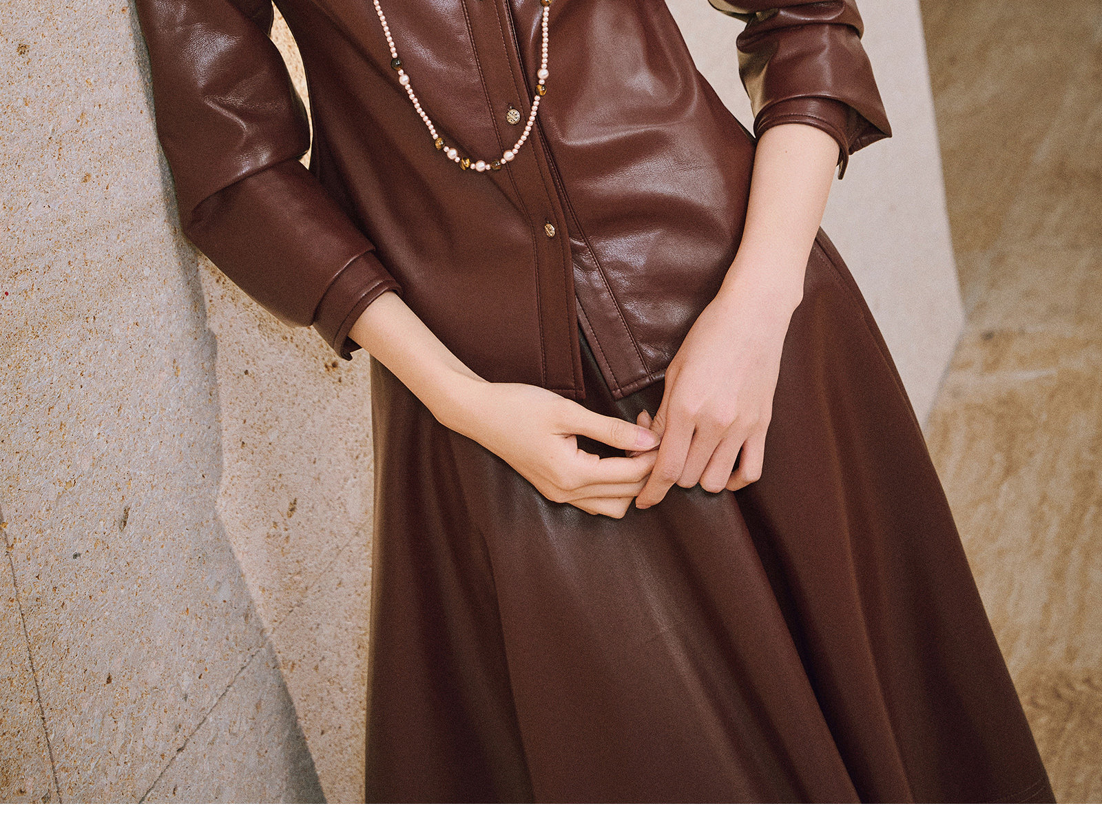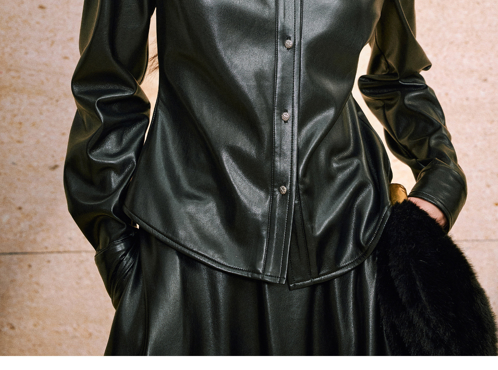 Wangxo|Genuine Leather Texture High-Density Protein Leather|Glossy Waist-Cinching Shirt & Multi-Panel Spliced Umbrella Skirt