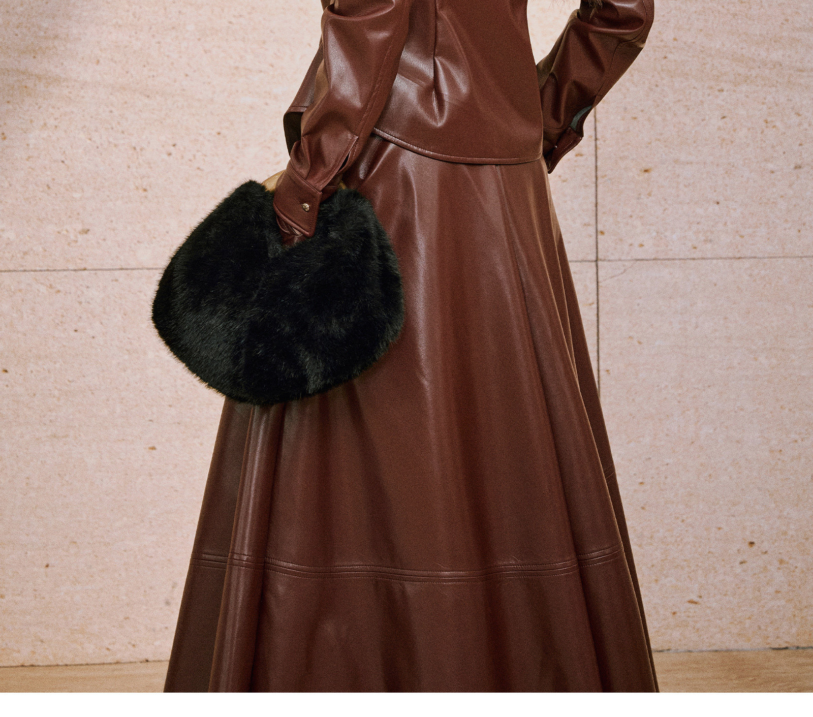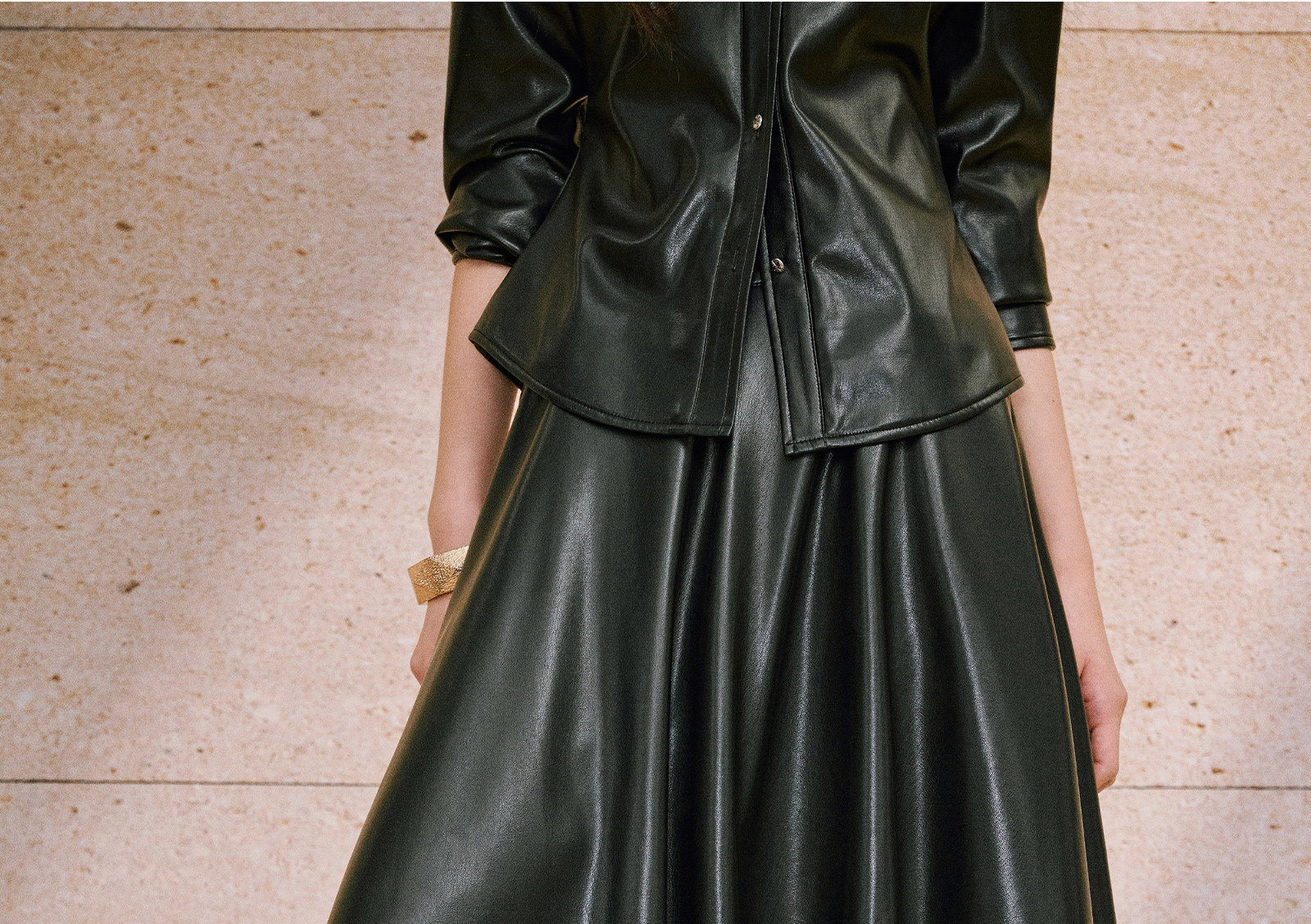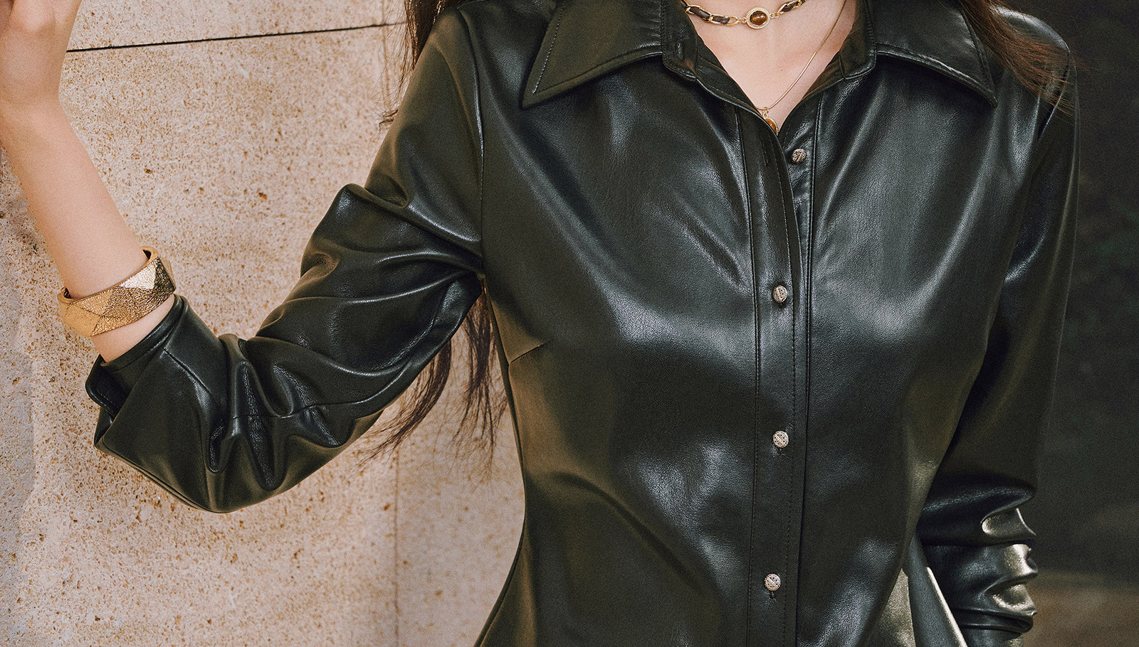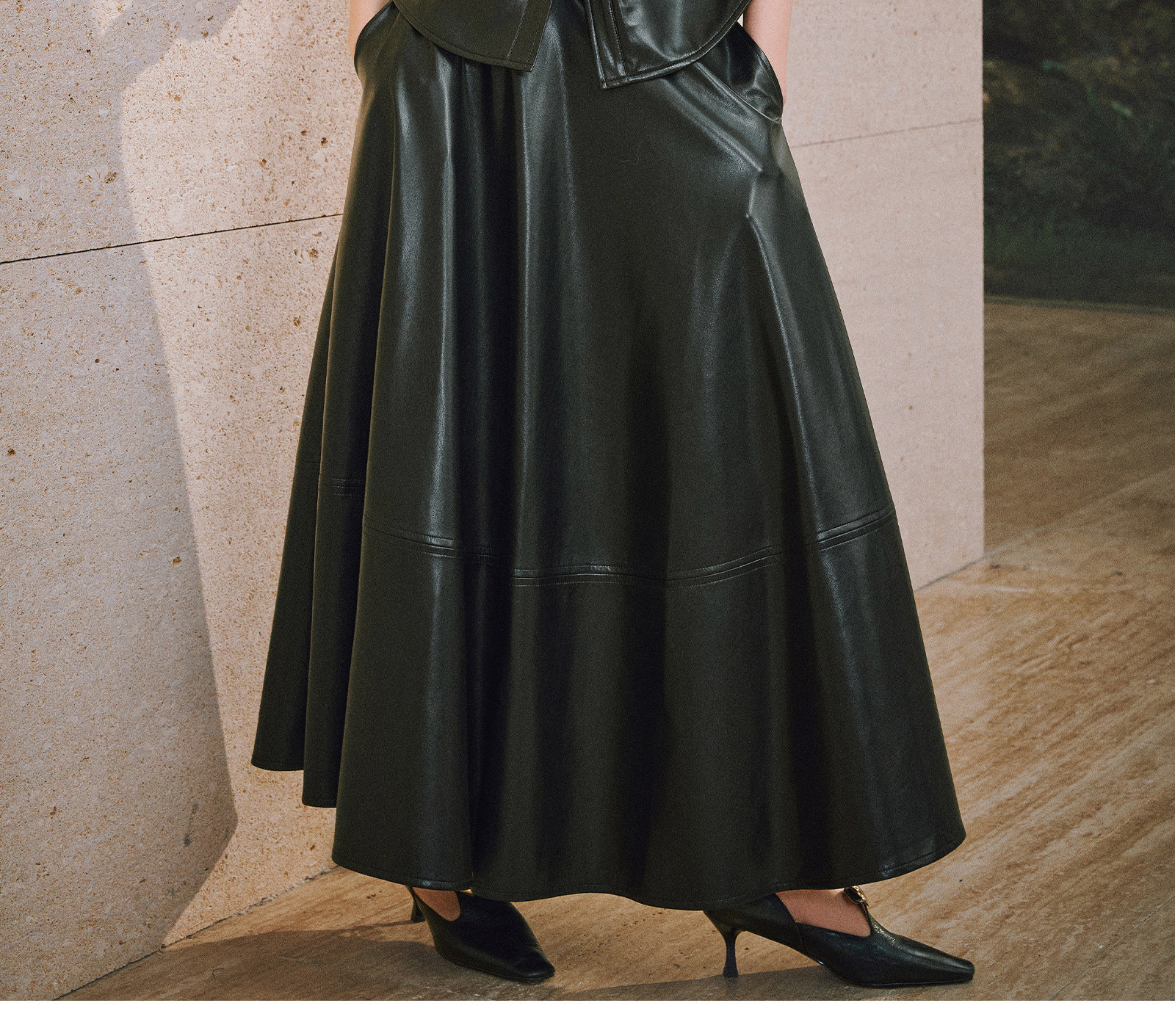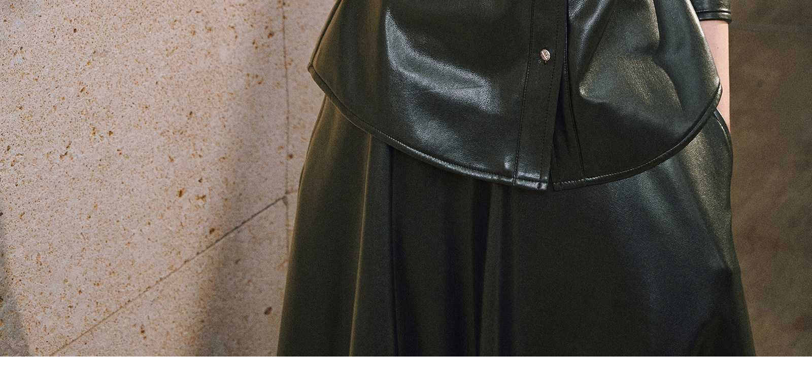 Wangxo|Genuine Leather Texture High-Density Protein Leather|Glossy Waist-Cinching Shirt & Multi-Panel Spliced Umbrella Skirt