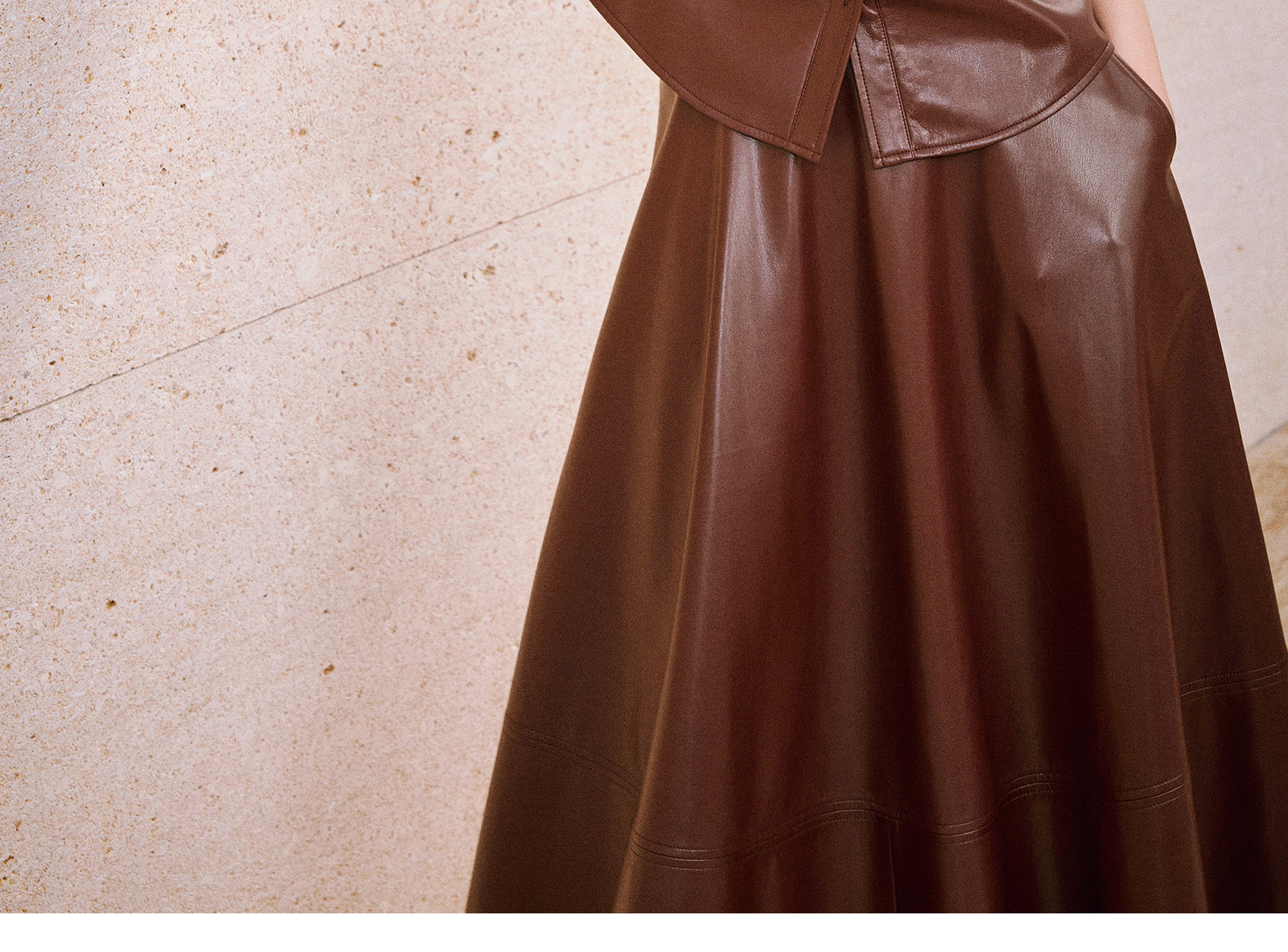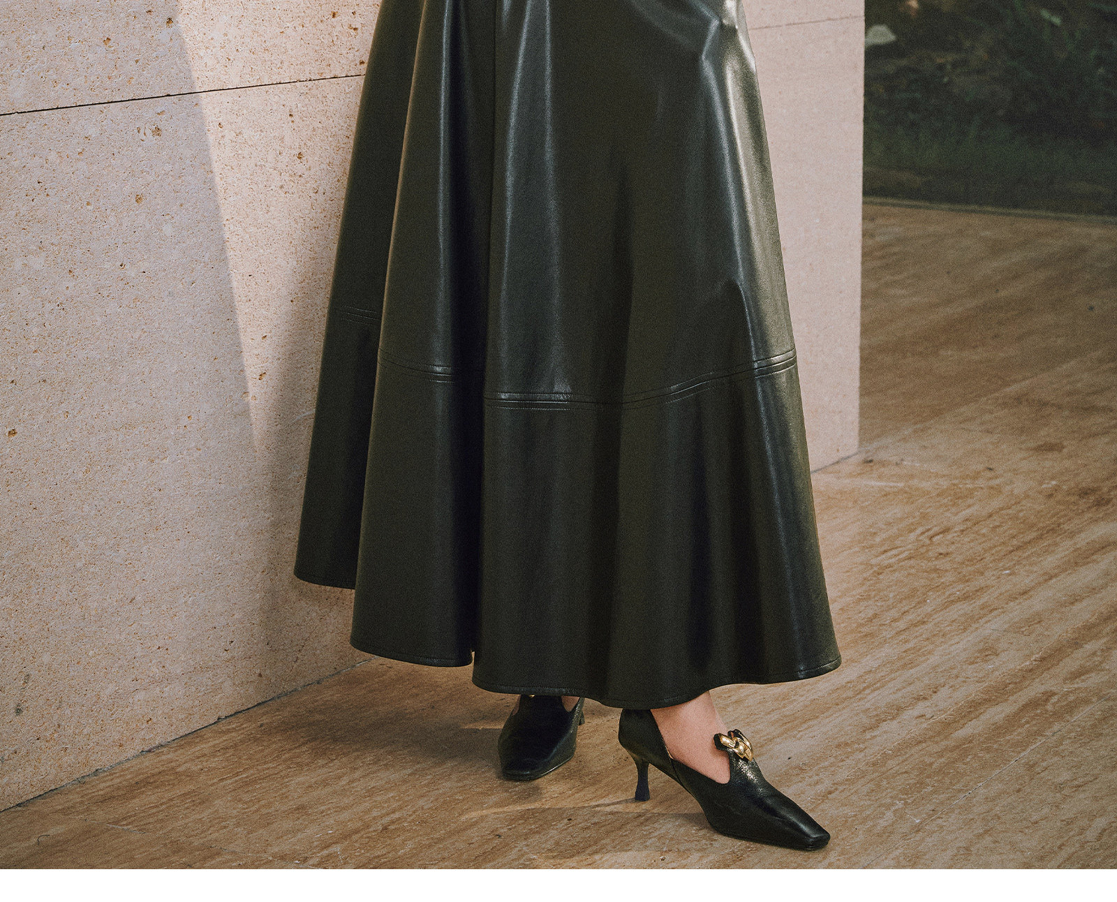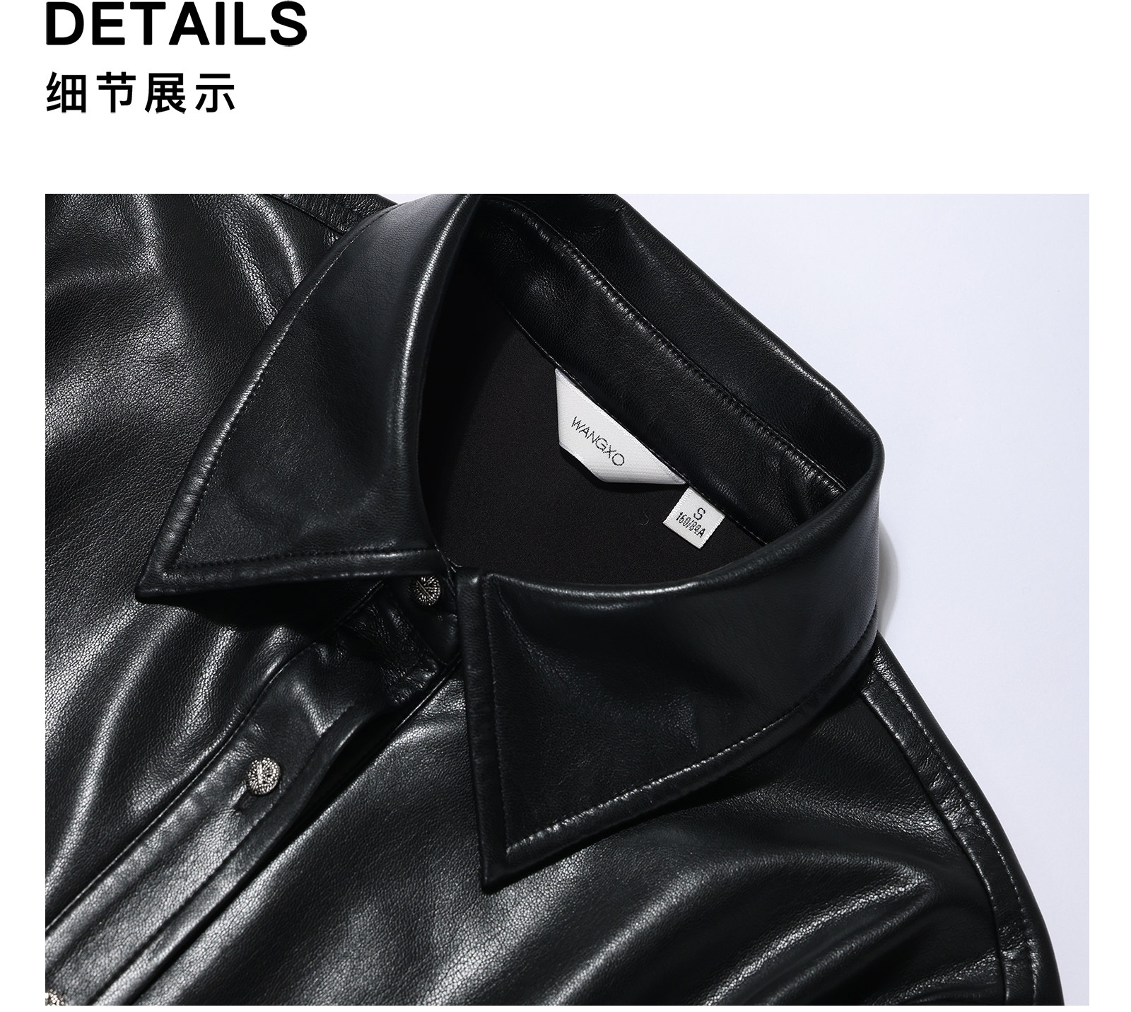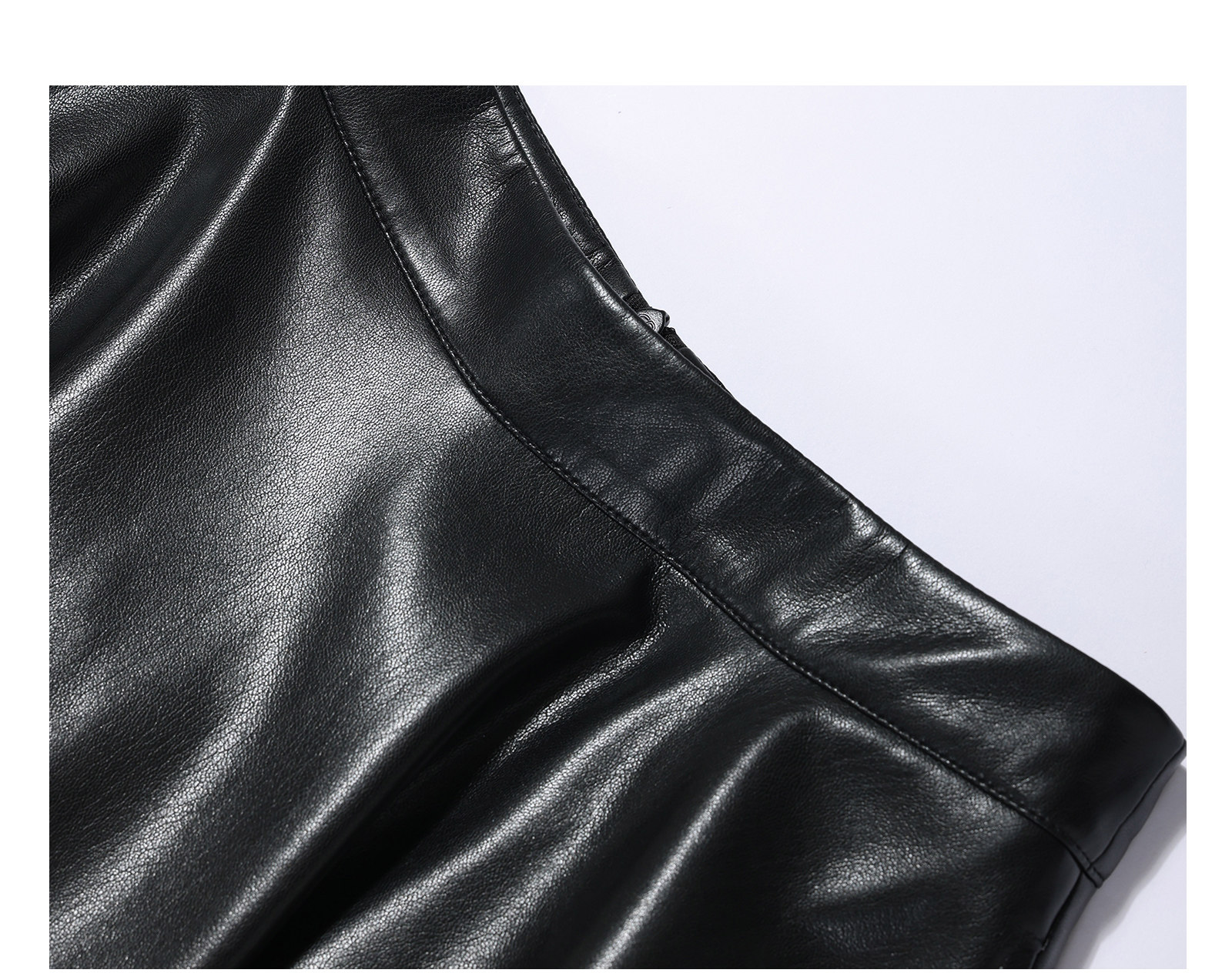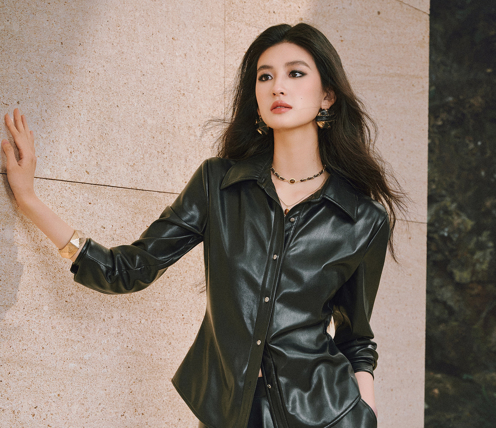 Wangxo|Genuine Leather Texture High-Density Protein Leather|Glossy Waist-Cinching Shirt & Multi-Panel Spliced Umbrella Skirt