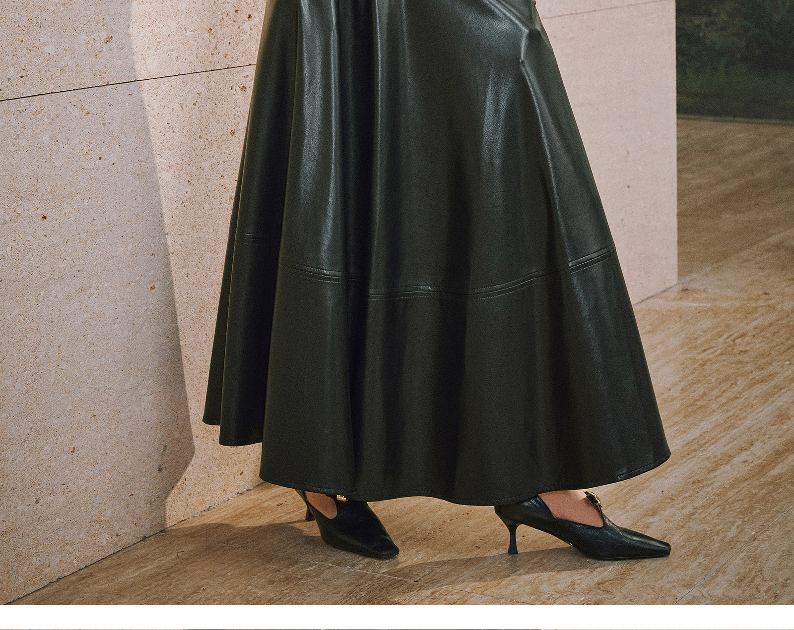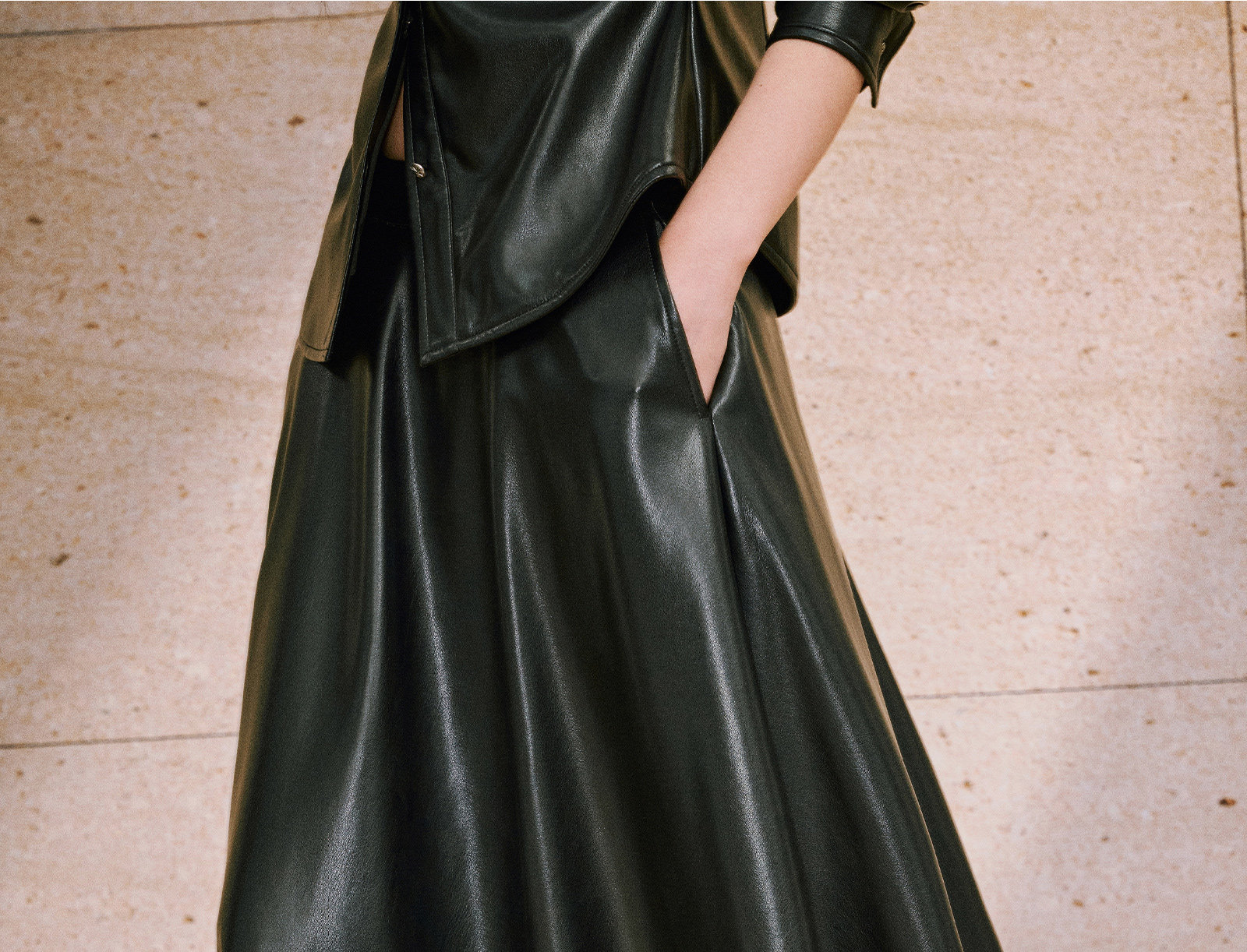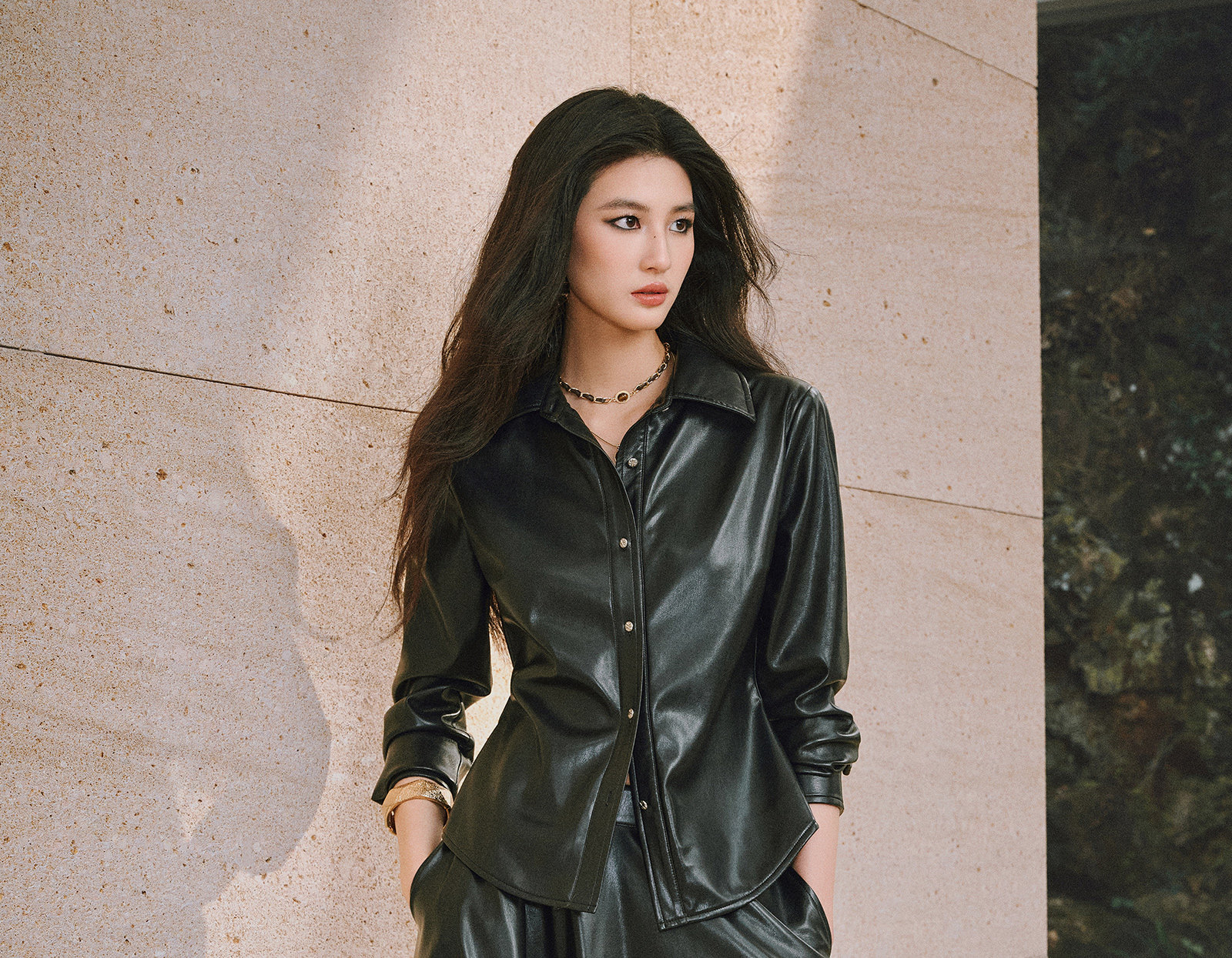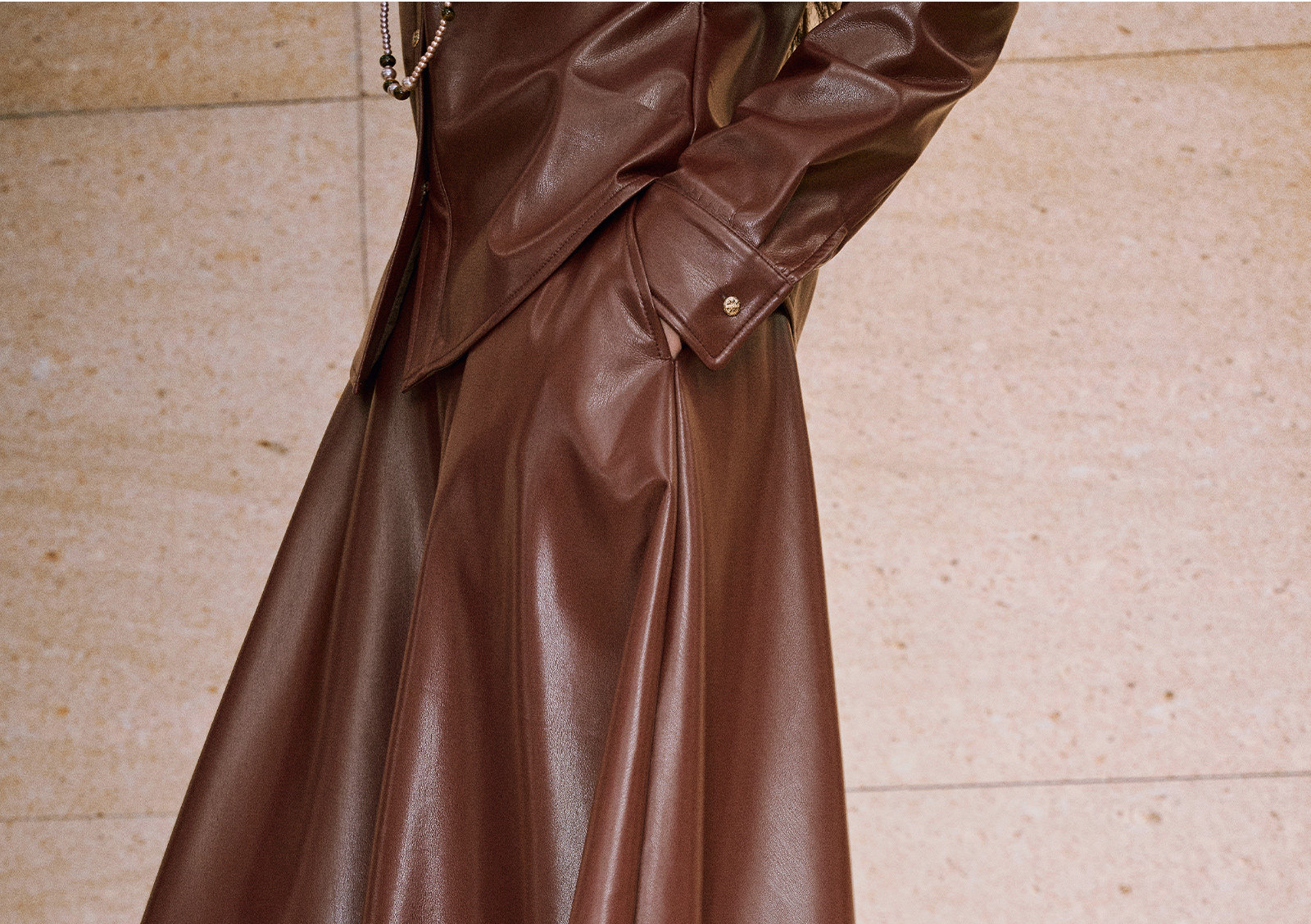 Wangxo|Genuine Leather Texture High-Density Protein Leather|Glossy Waist-Cinching Shirt & Multi-Panel Spliced Umbrella Skirt