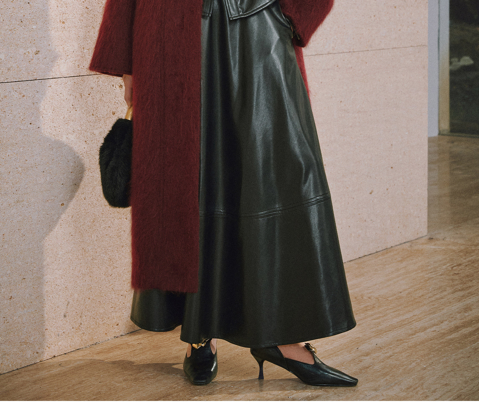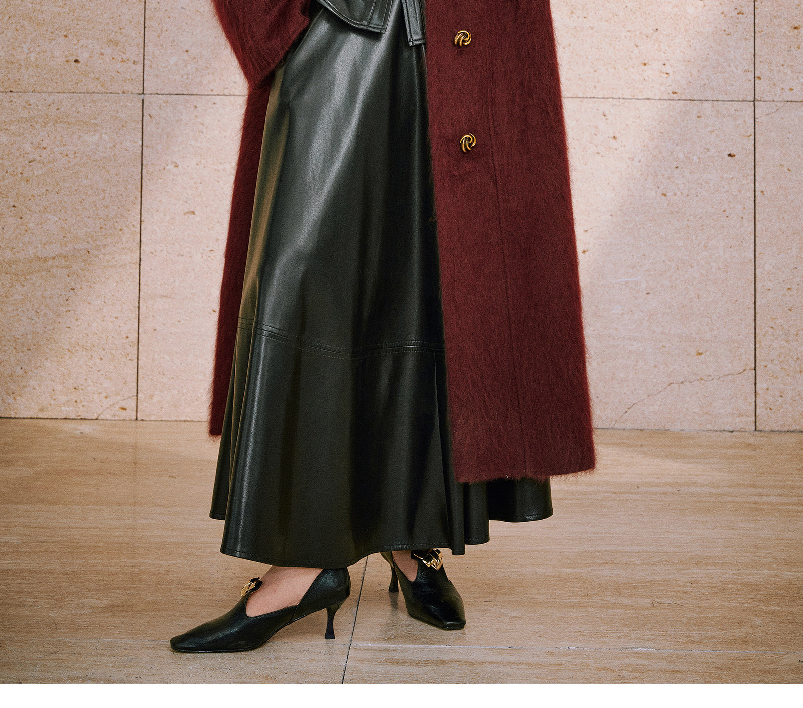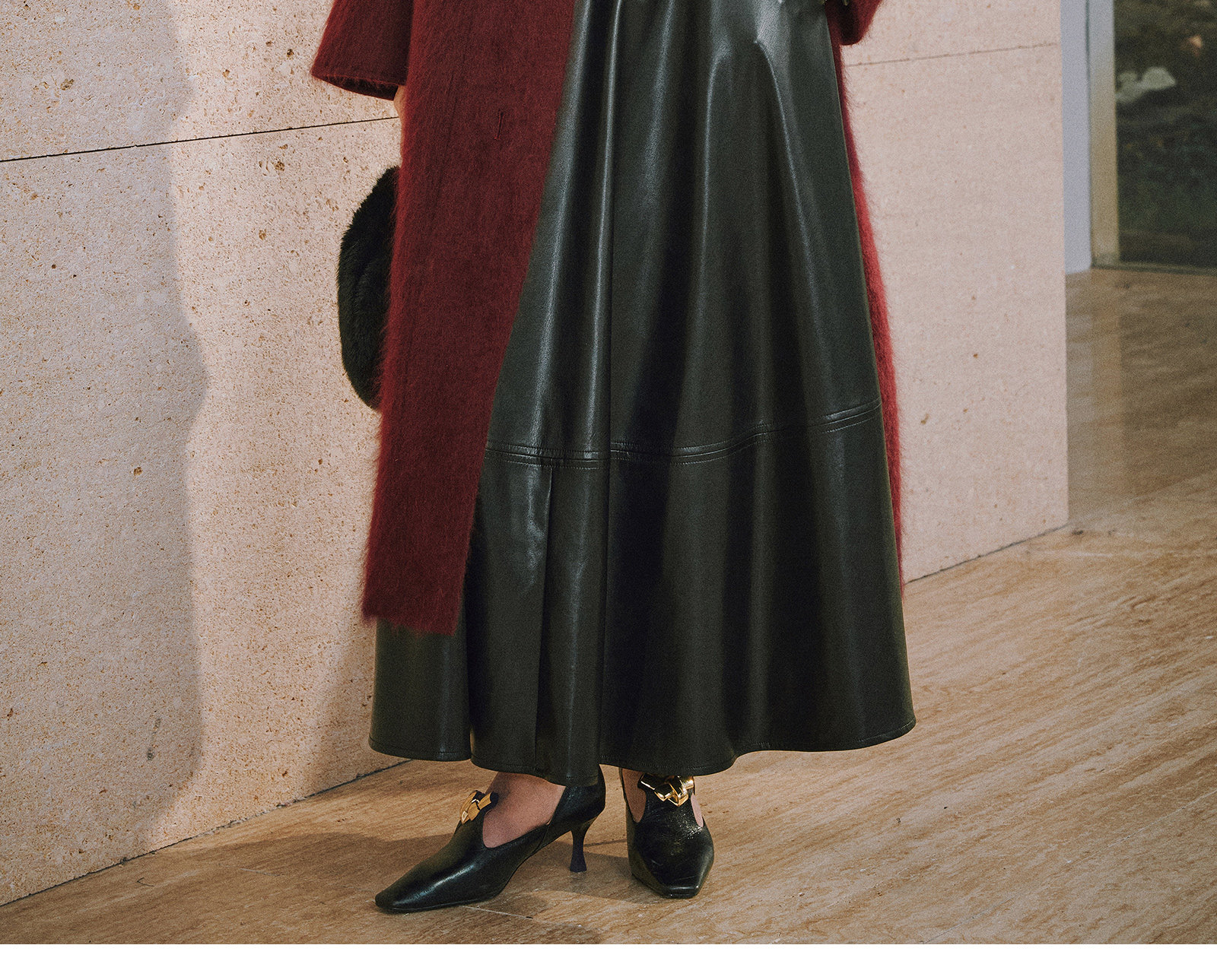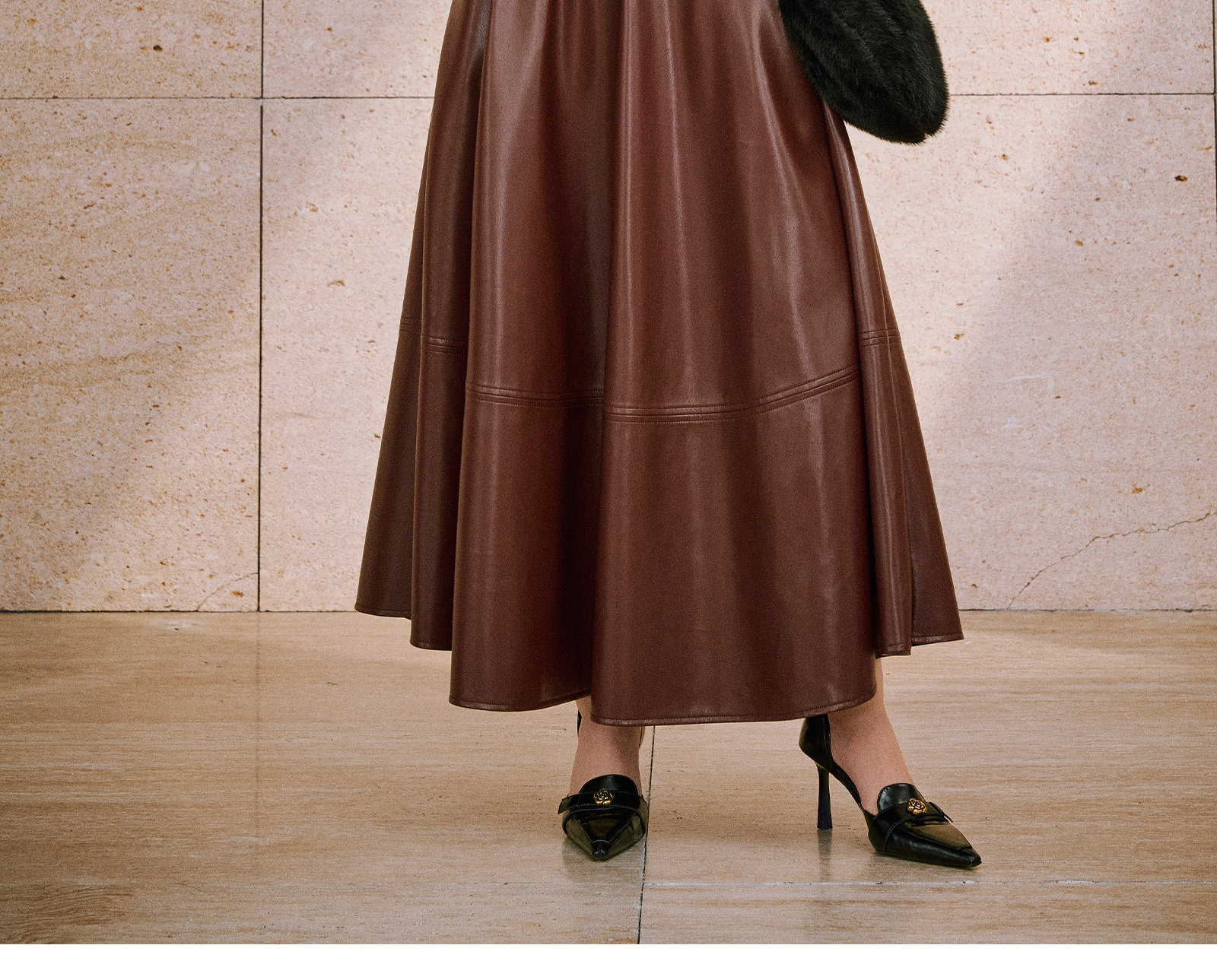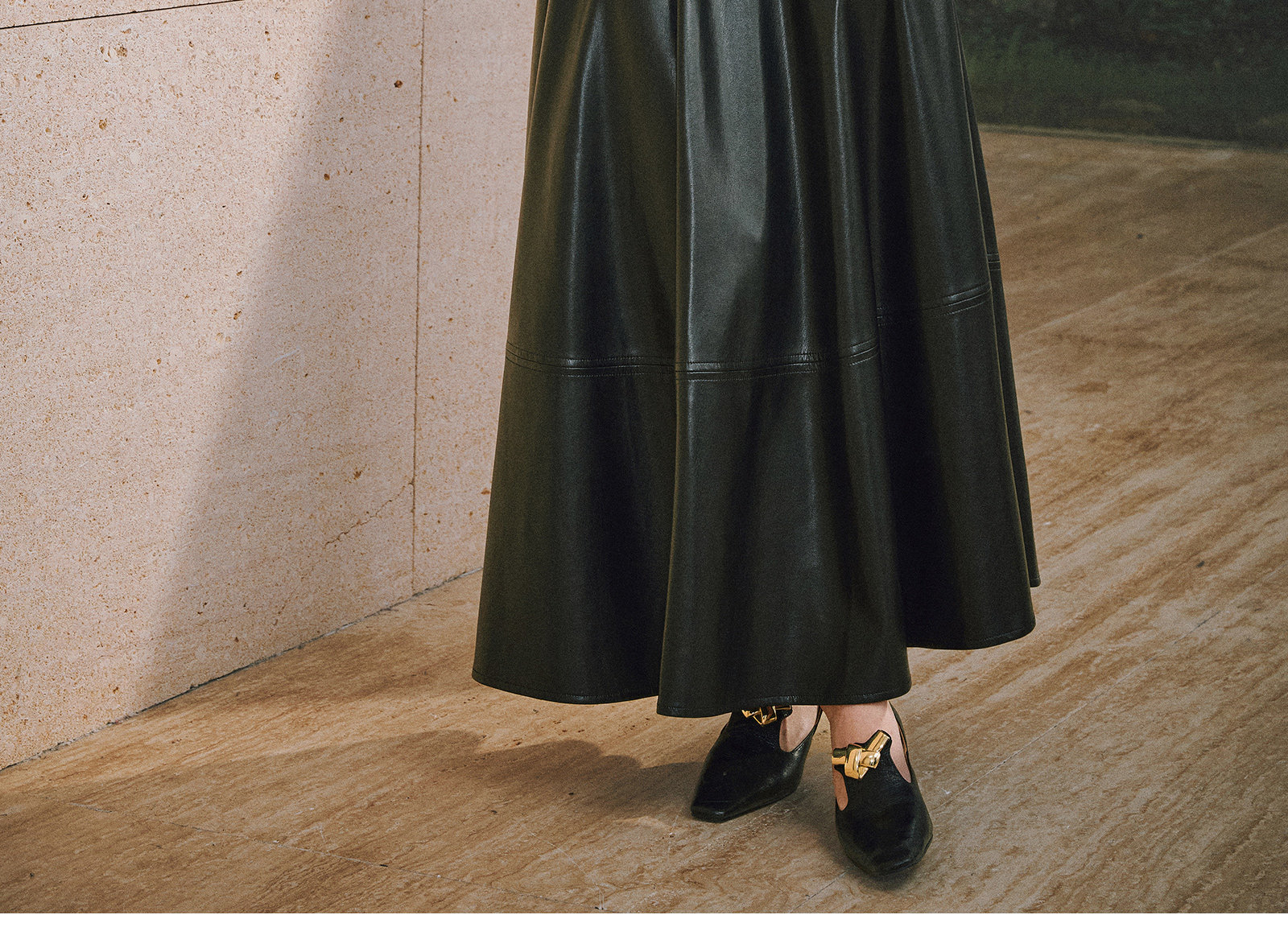 Wangxo|Genuine Leather Texture High-Density Protein Leather|Glossy Waist-Cinching Shirt & Multi-Panel Spliced Umbrella Skirt