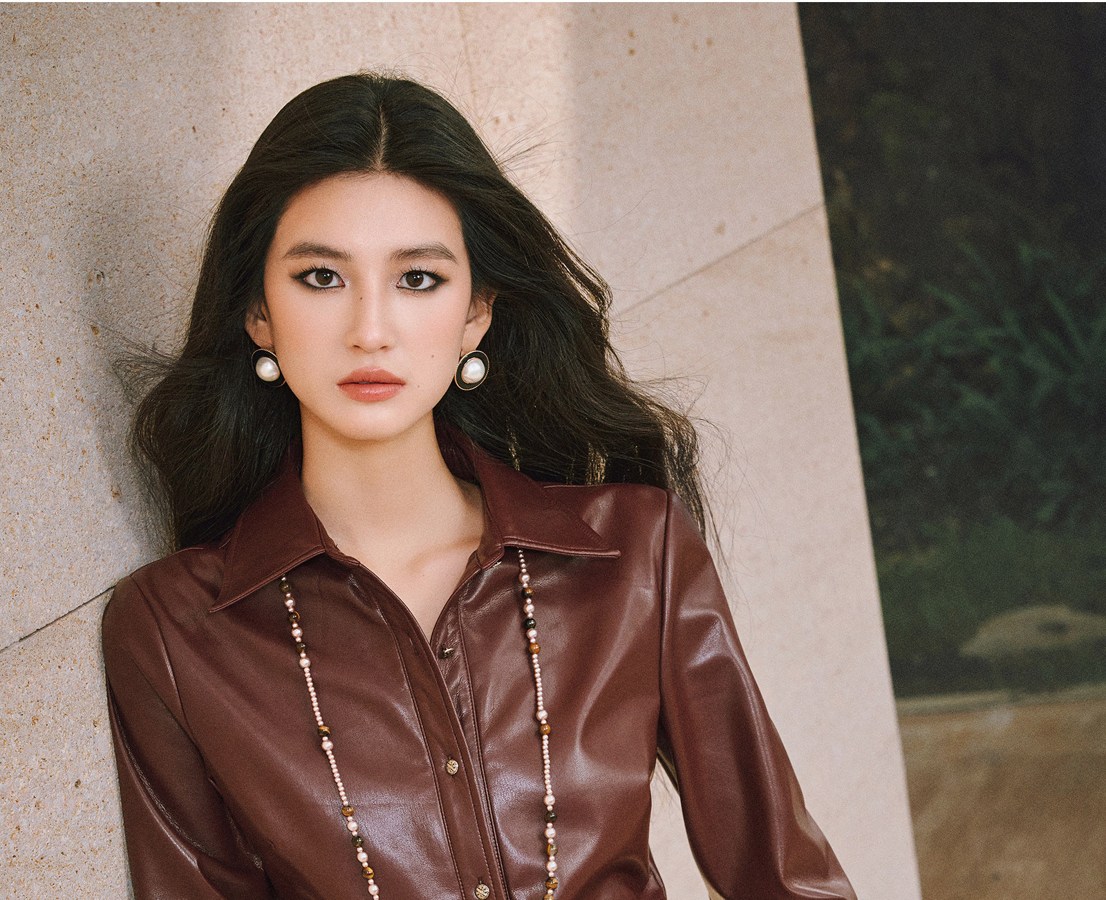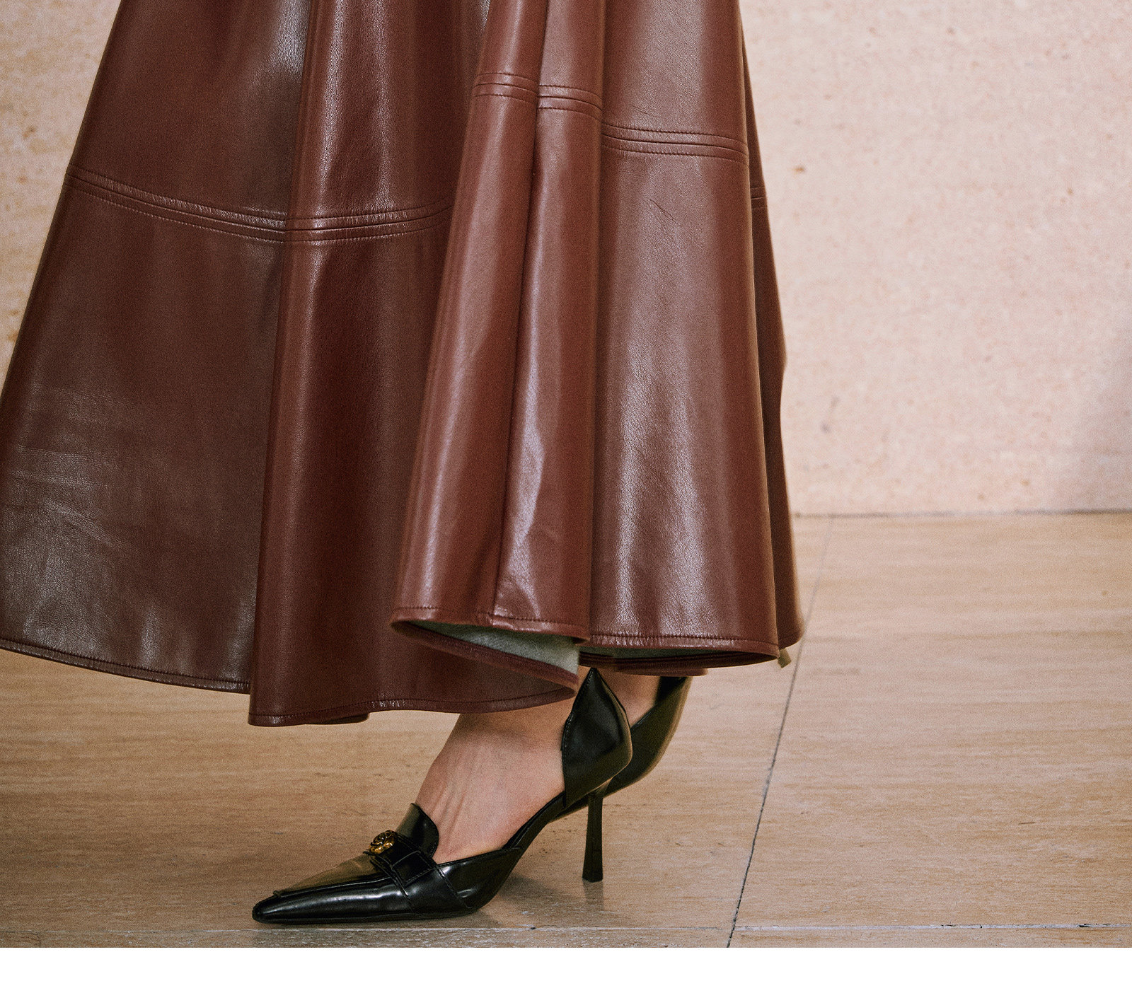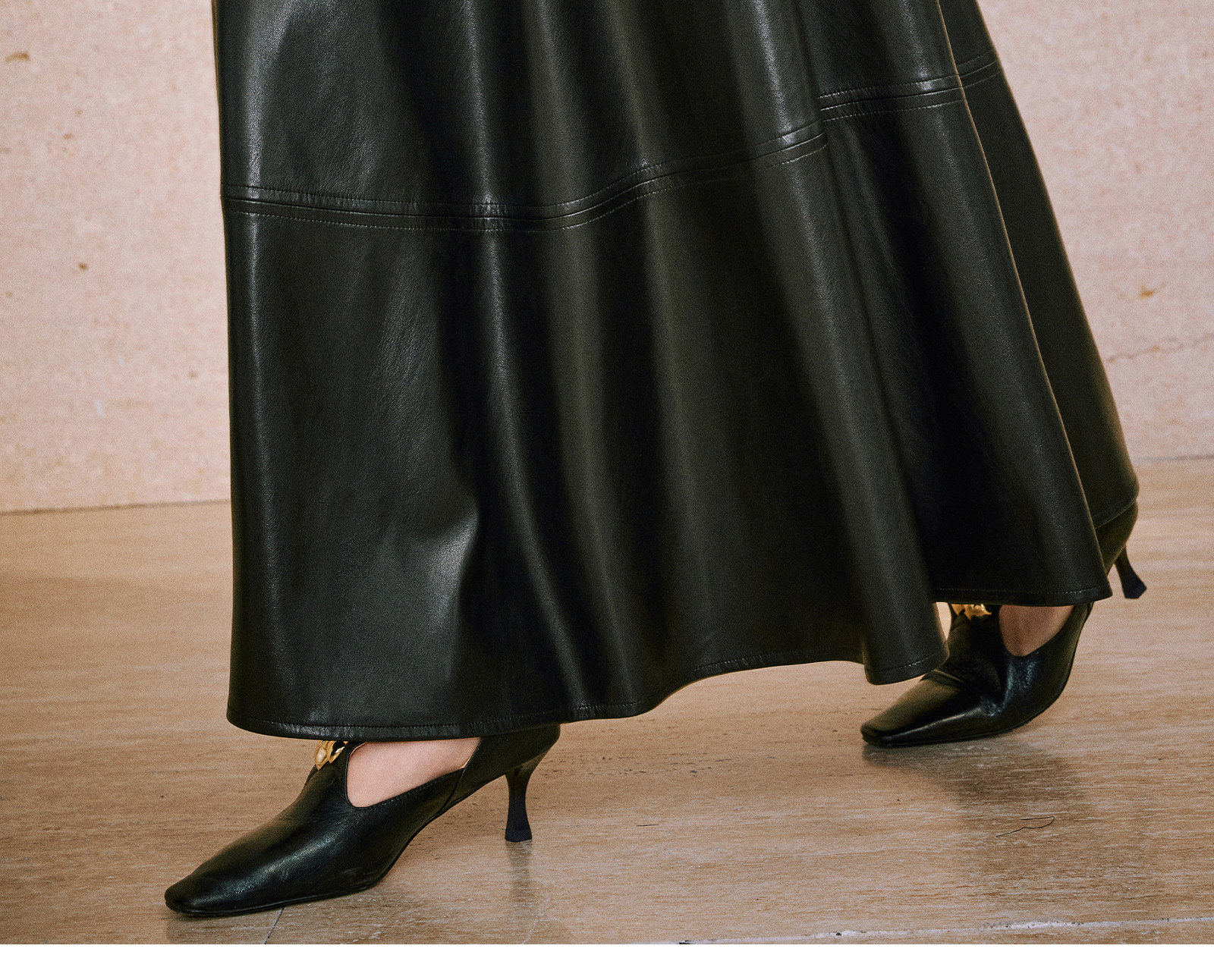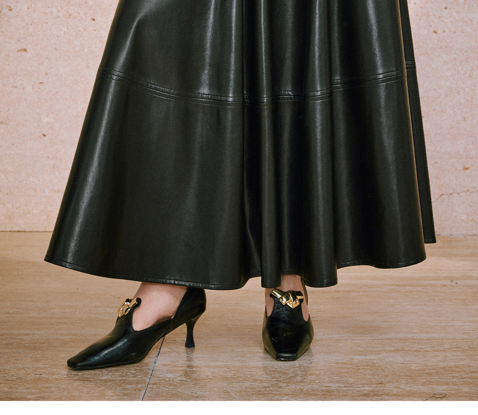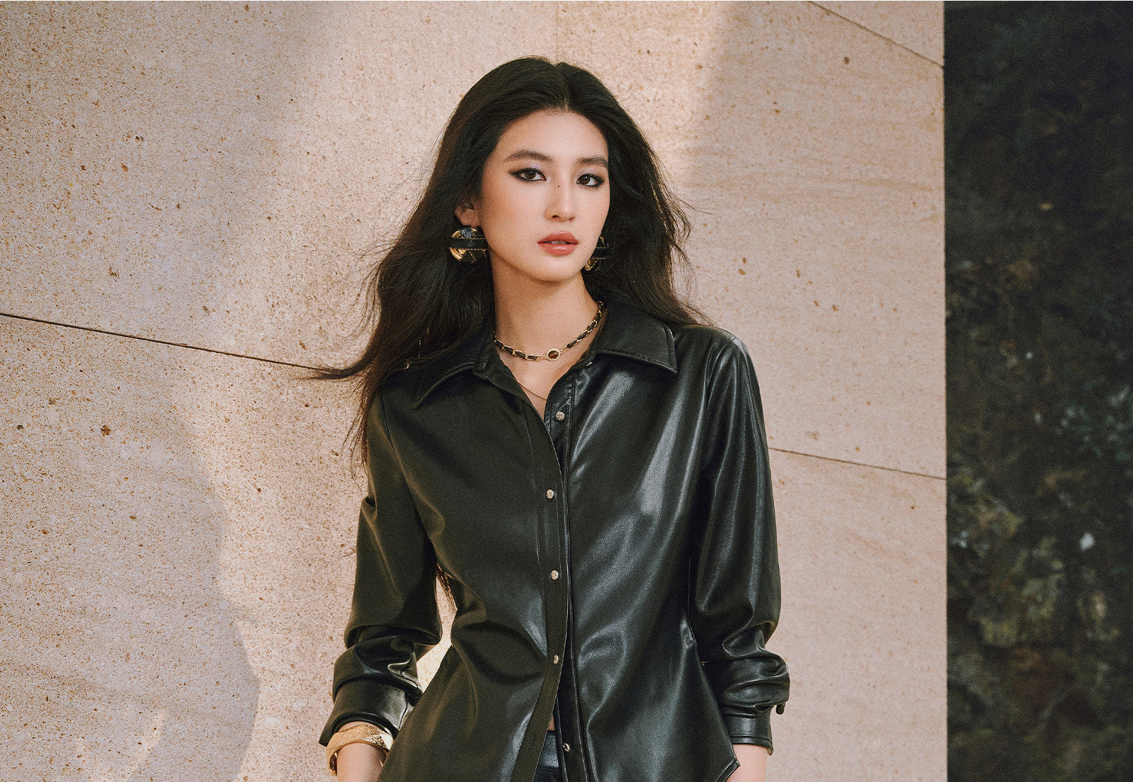 Wangxo|Genuine Leather Texture High-Density Protein Leather|Glossy Waist-Cinching Shirt & Multi-Panel Spliced Umbrella Skirt