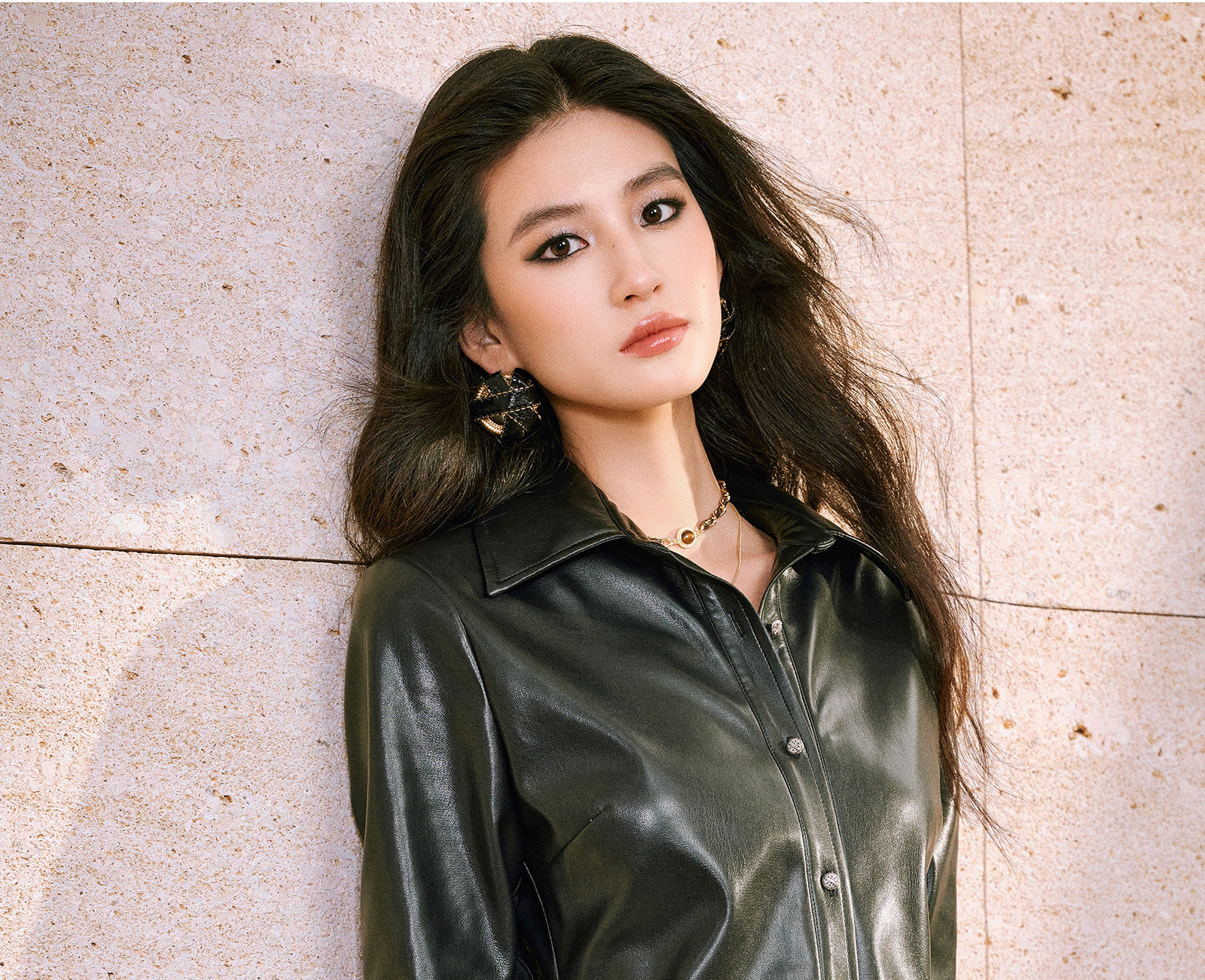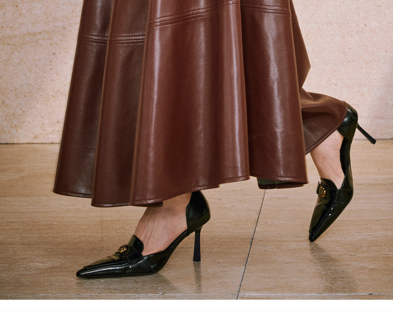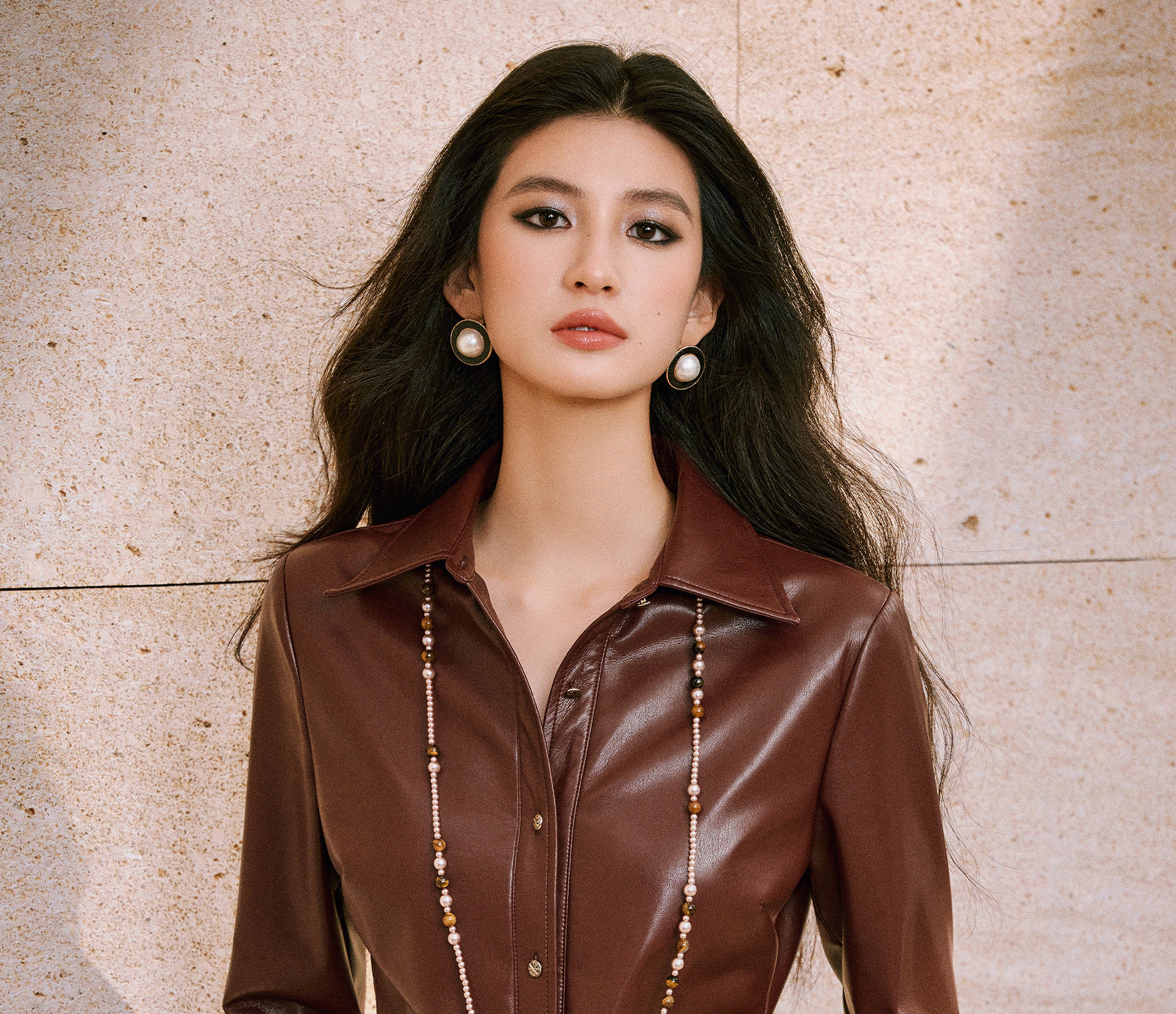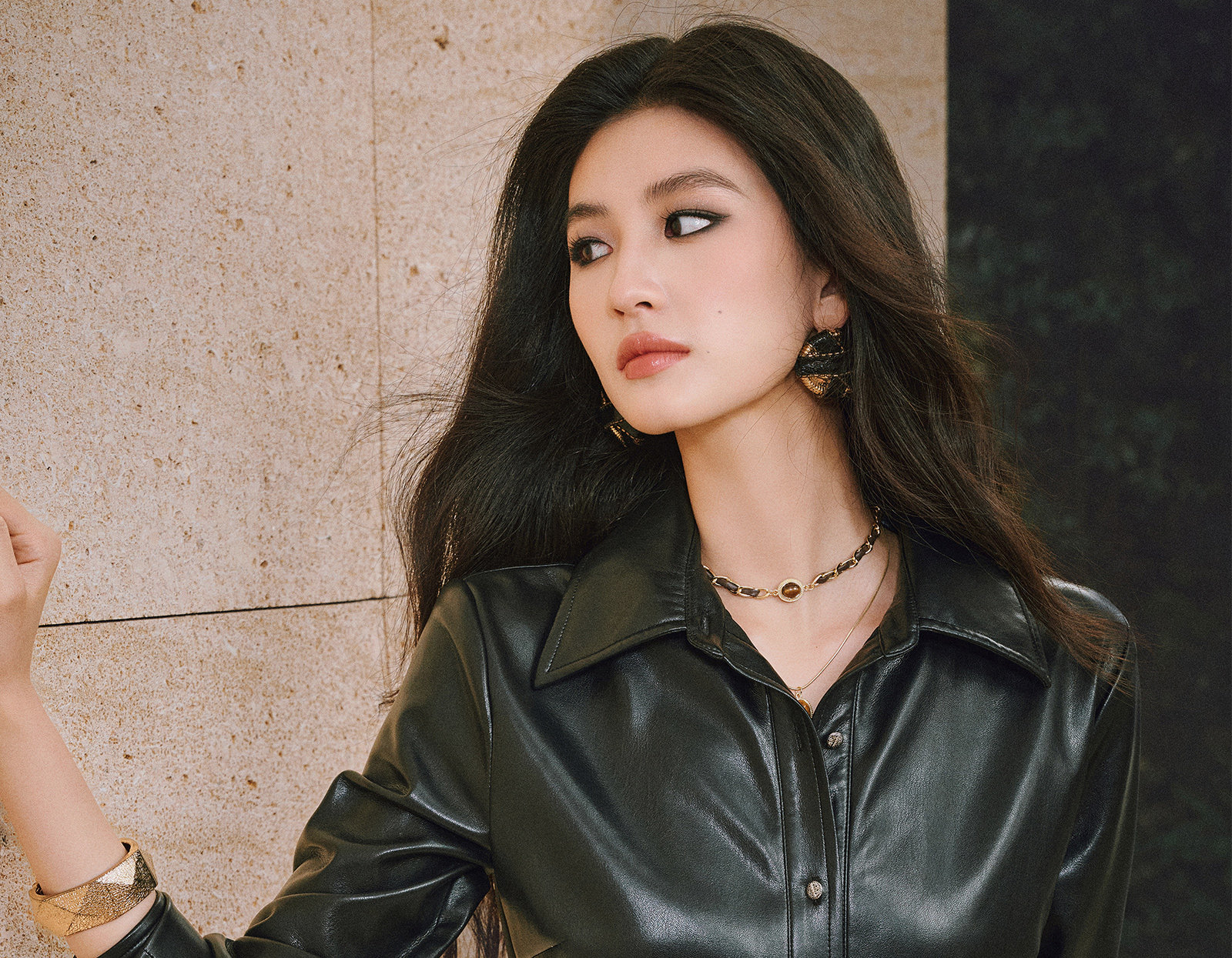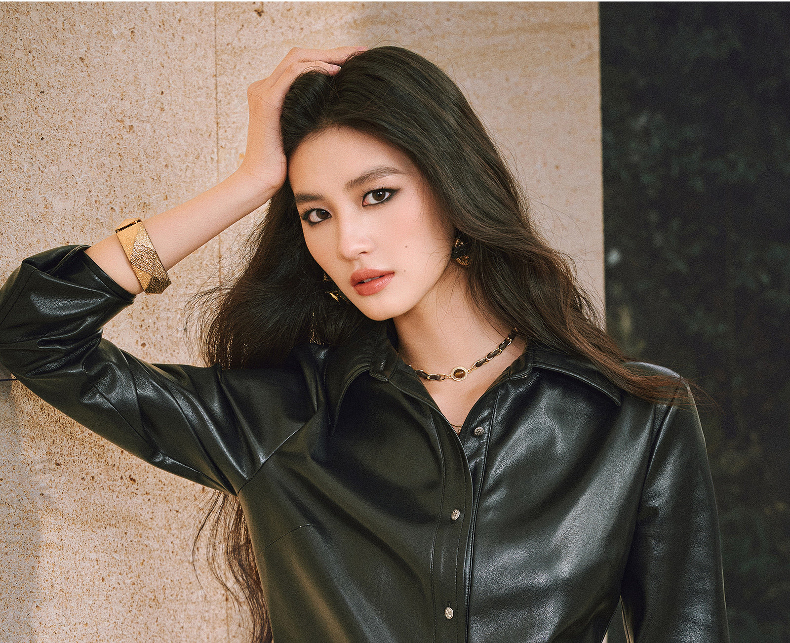 Wangxo|Genuine Leather Texture High-Density Protein Leather|Glossy Waist-Cinching Shirt & Multi-Panel Spliced Umbrella Skirt