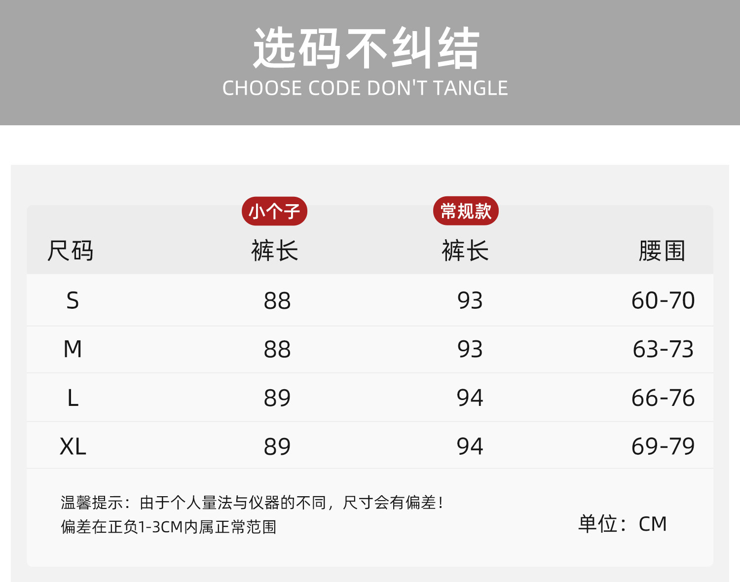 Outseam (cm) 99 cm 101.5 cm 104 cm 106.5 cm 109 cm