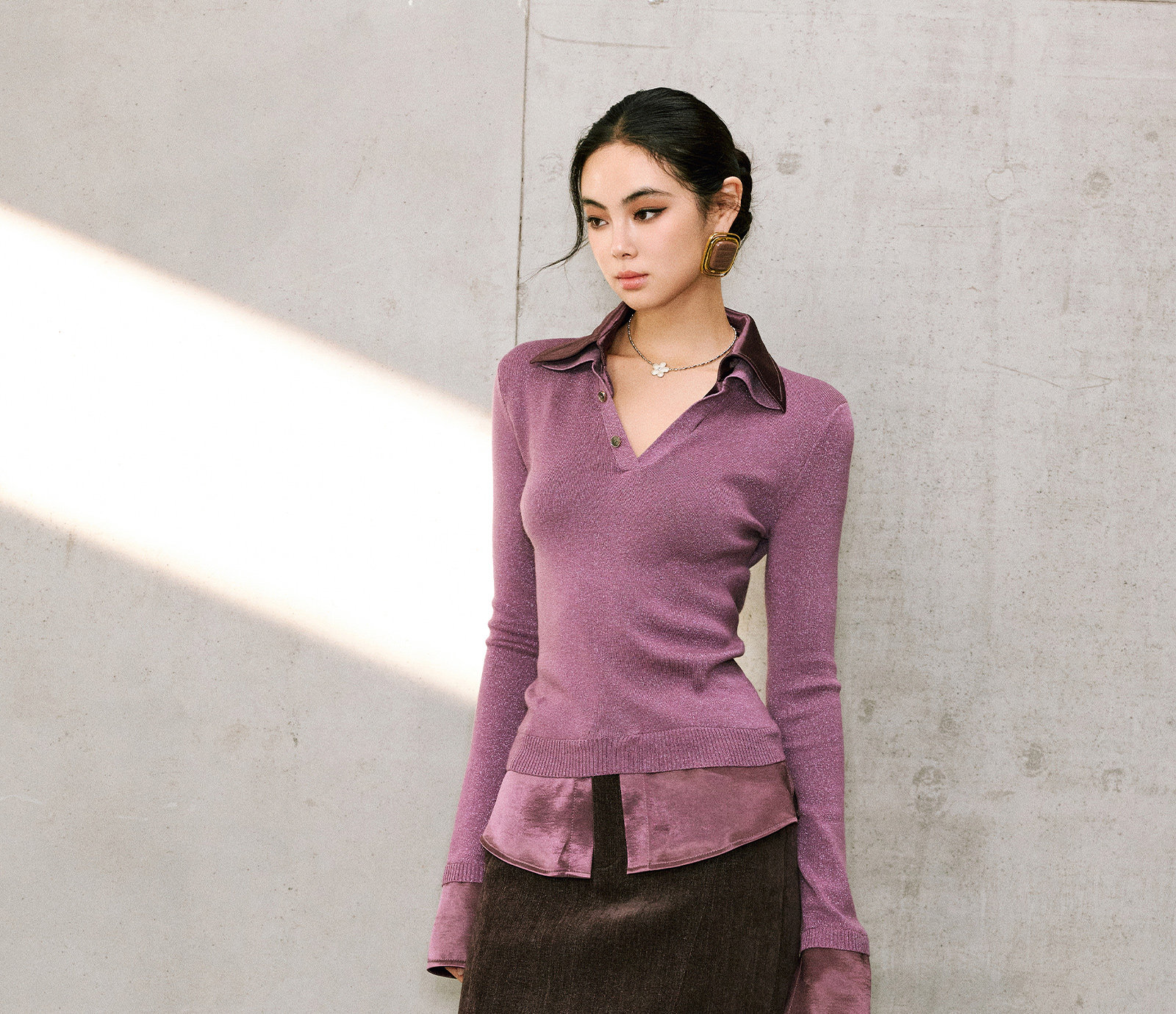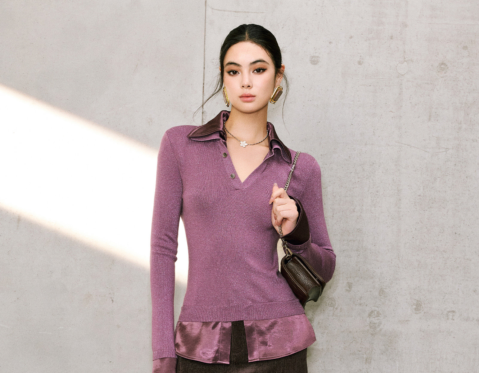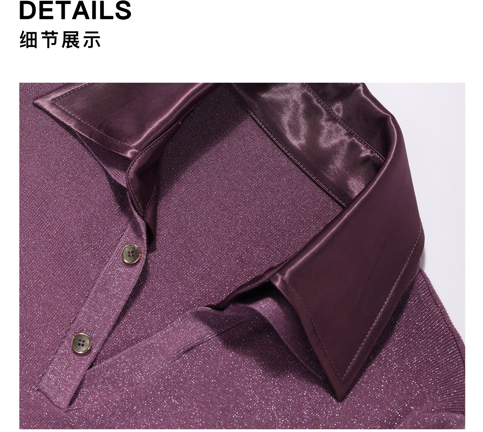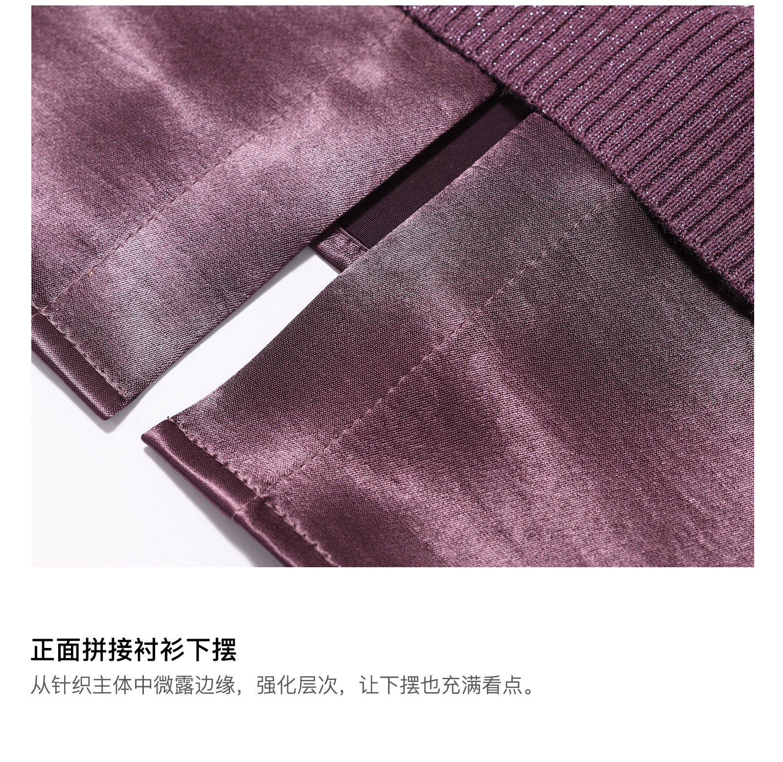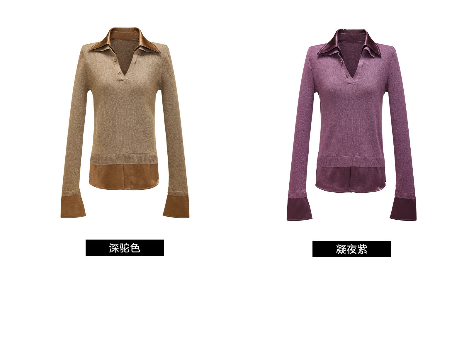 WANGXO|奢雅密闪弹力针织拼接光泽缎面|翻V领层次感假两件上衣
