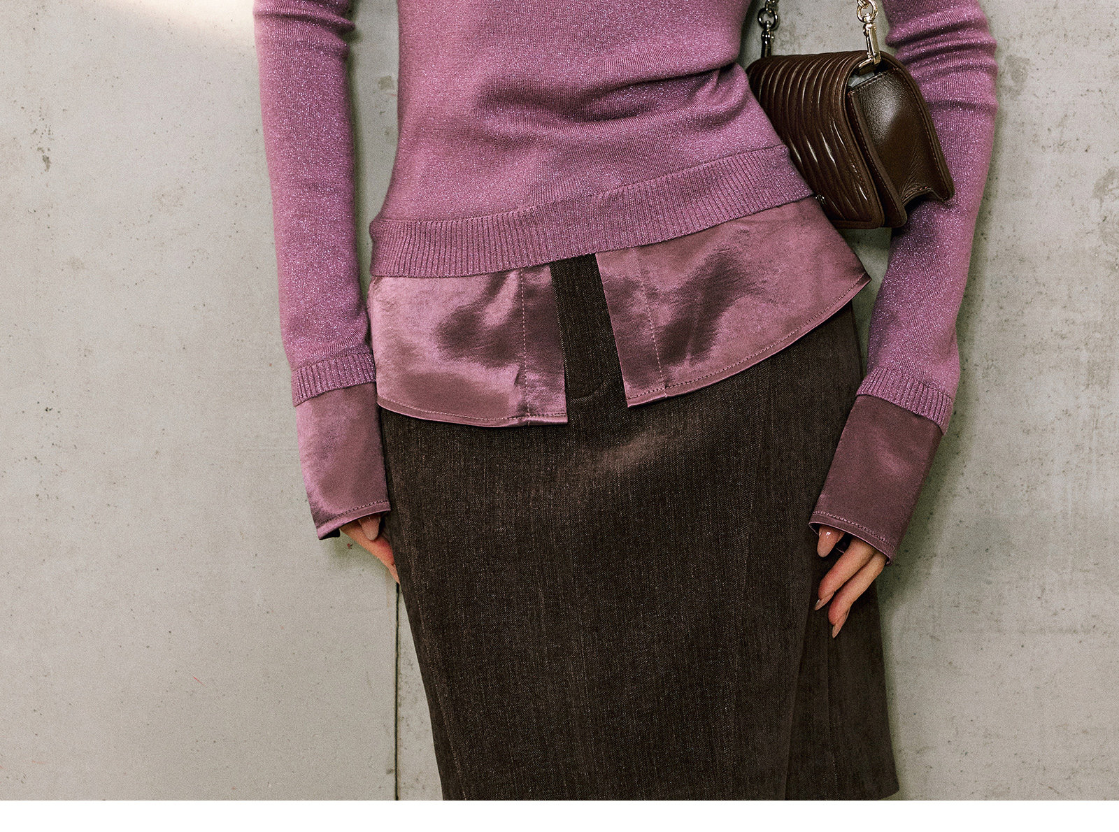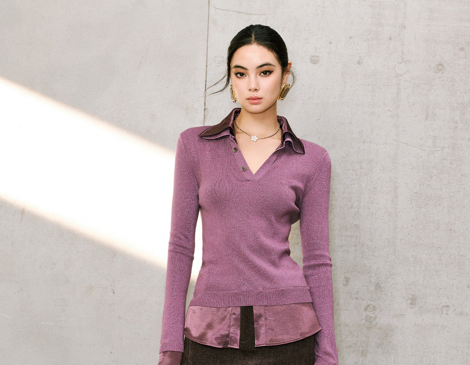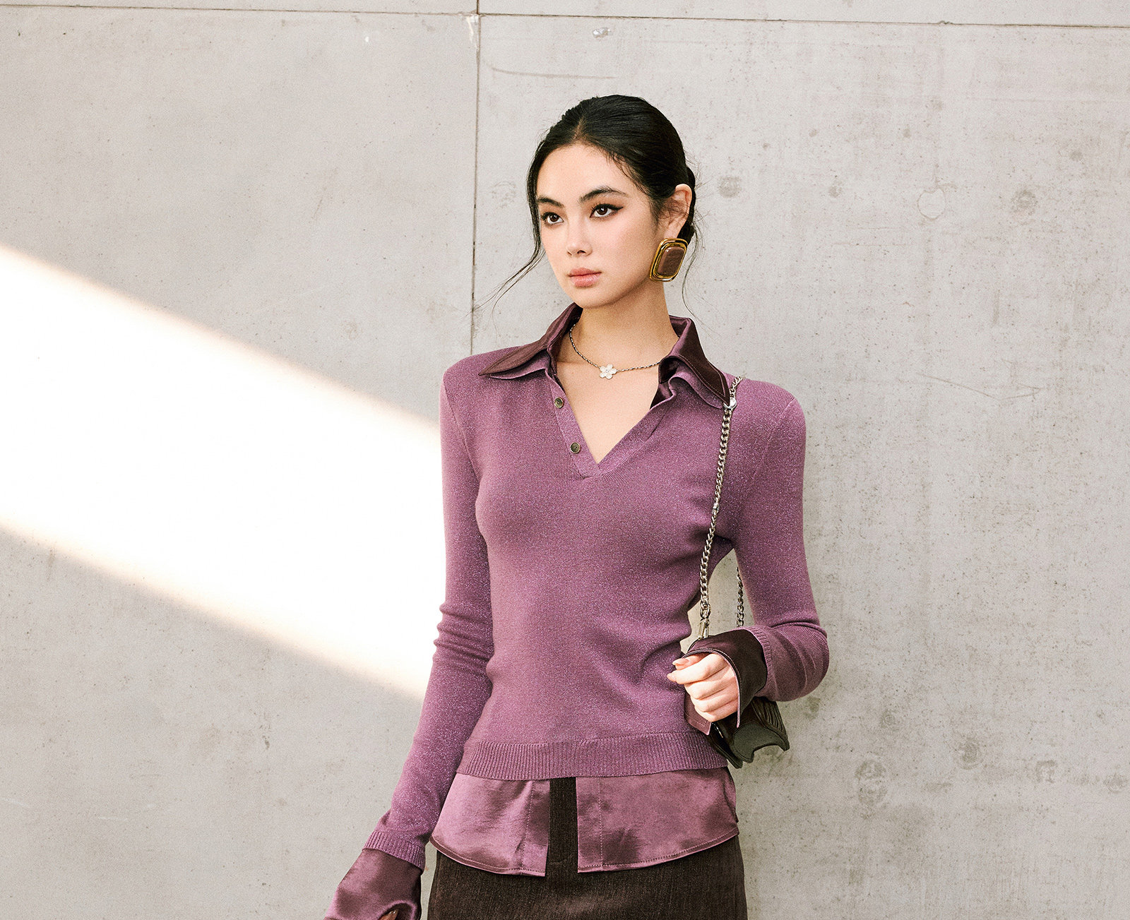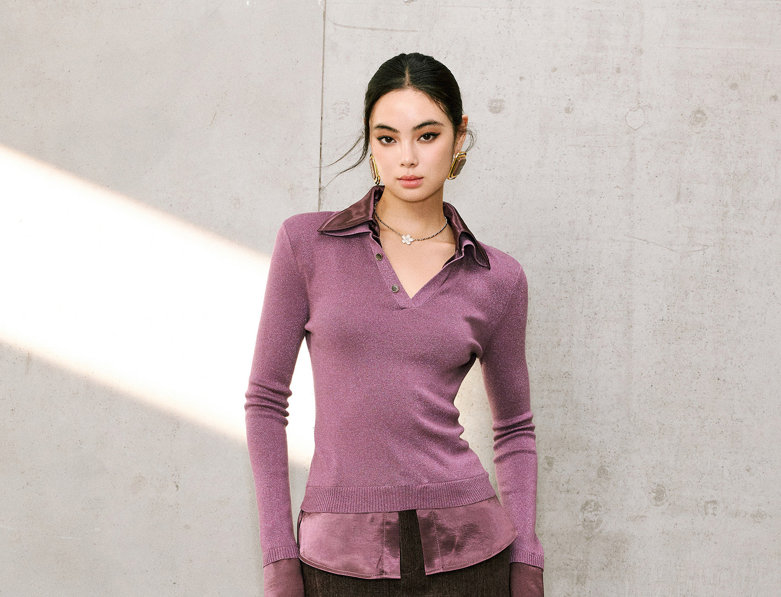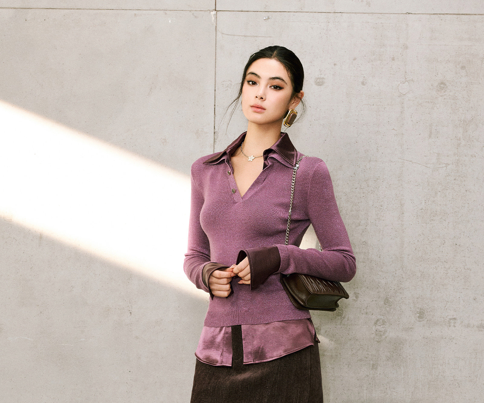 WANGXO|奢雅密闪弹力针织拼接光泽缎面|翻V领层次感假两件上衣