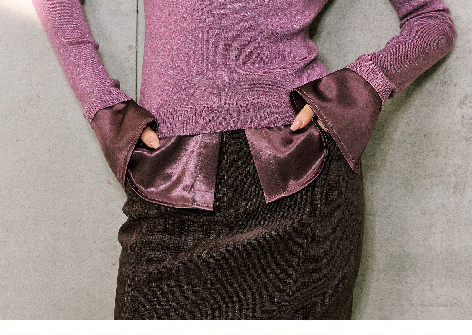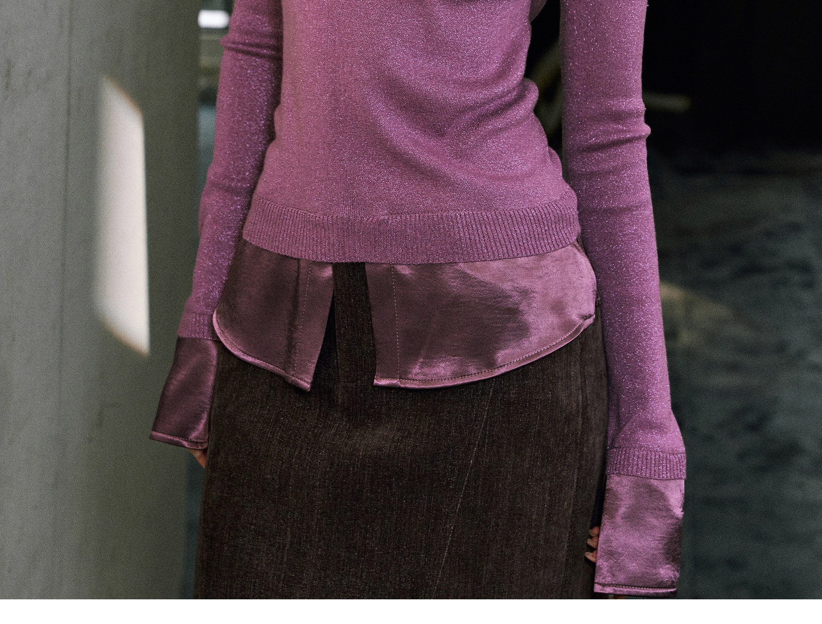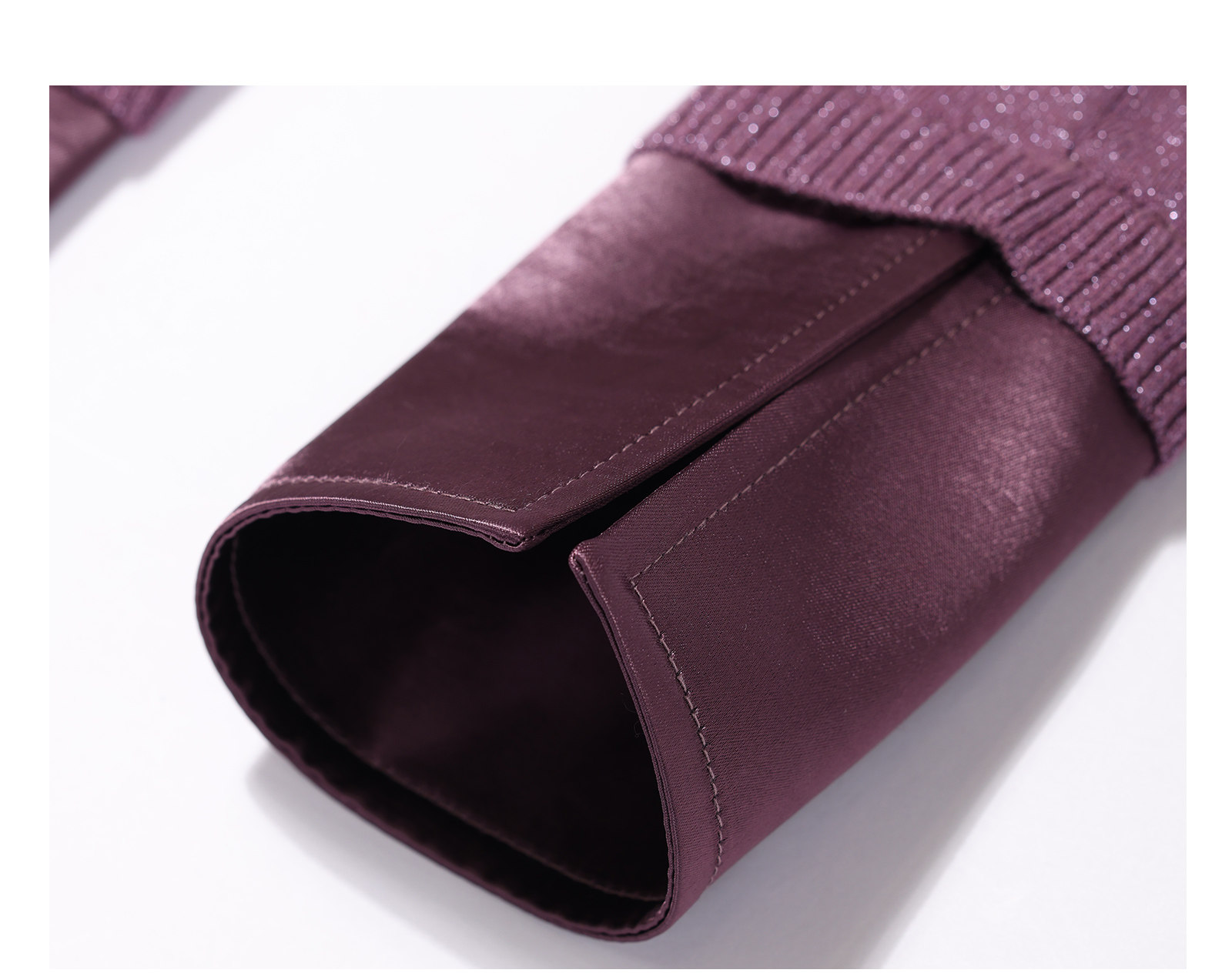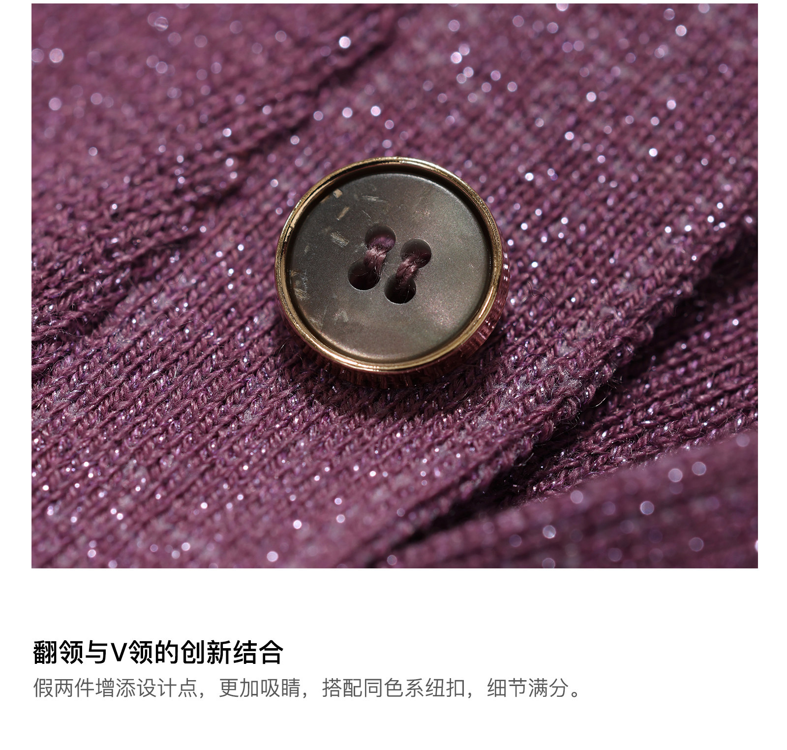 WANGXO|奢雅密闪弹力针织拼接光泽缎面|翻V领层次感假两件上衣