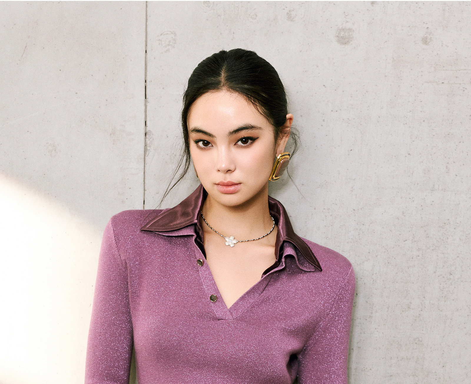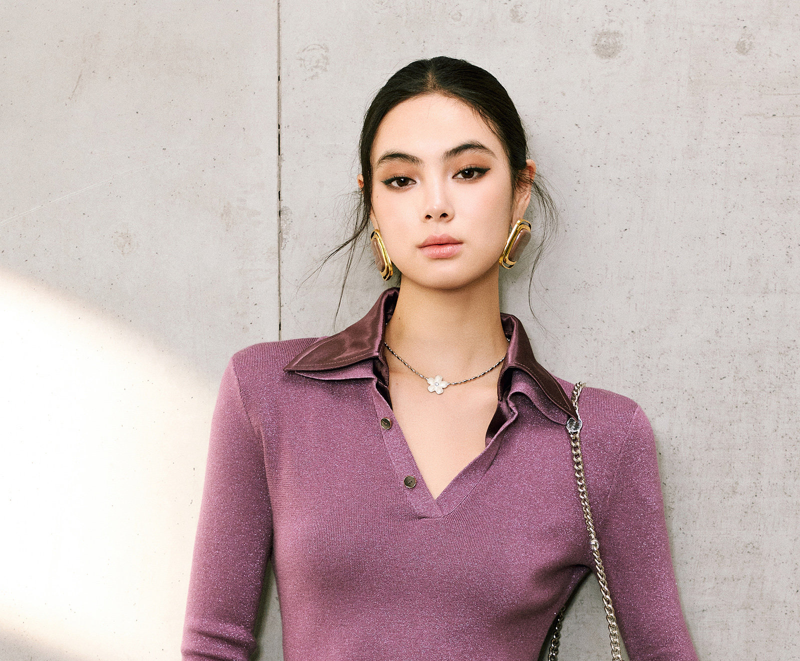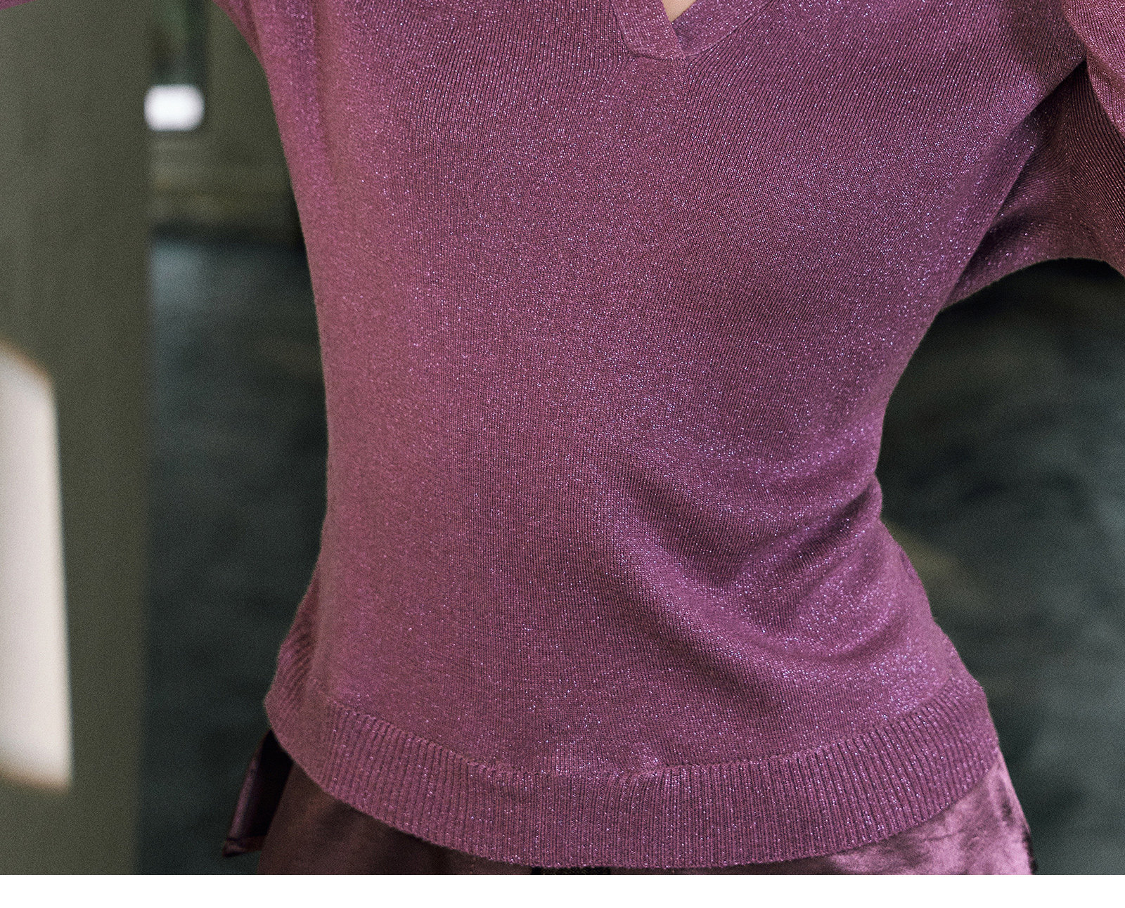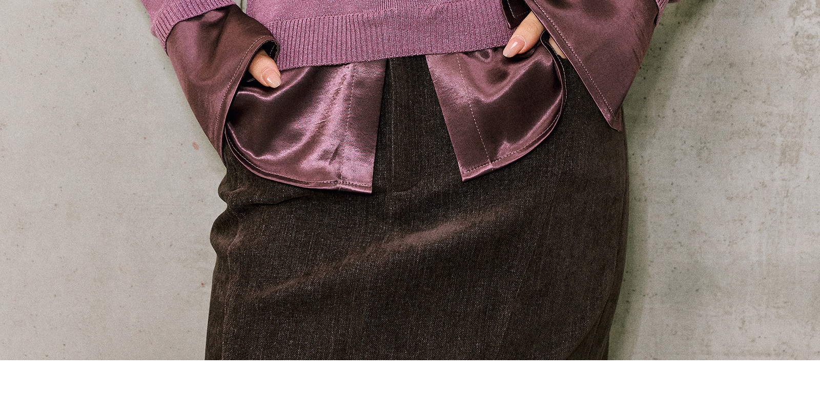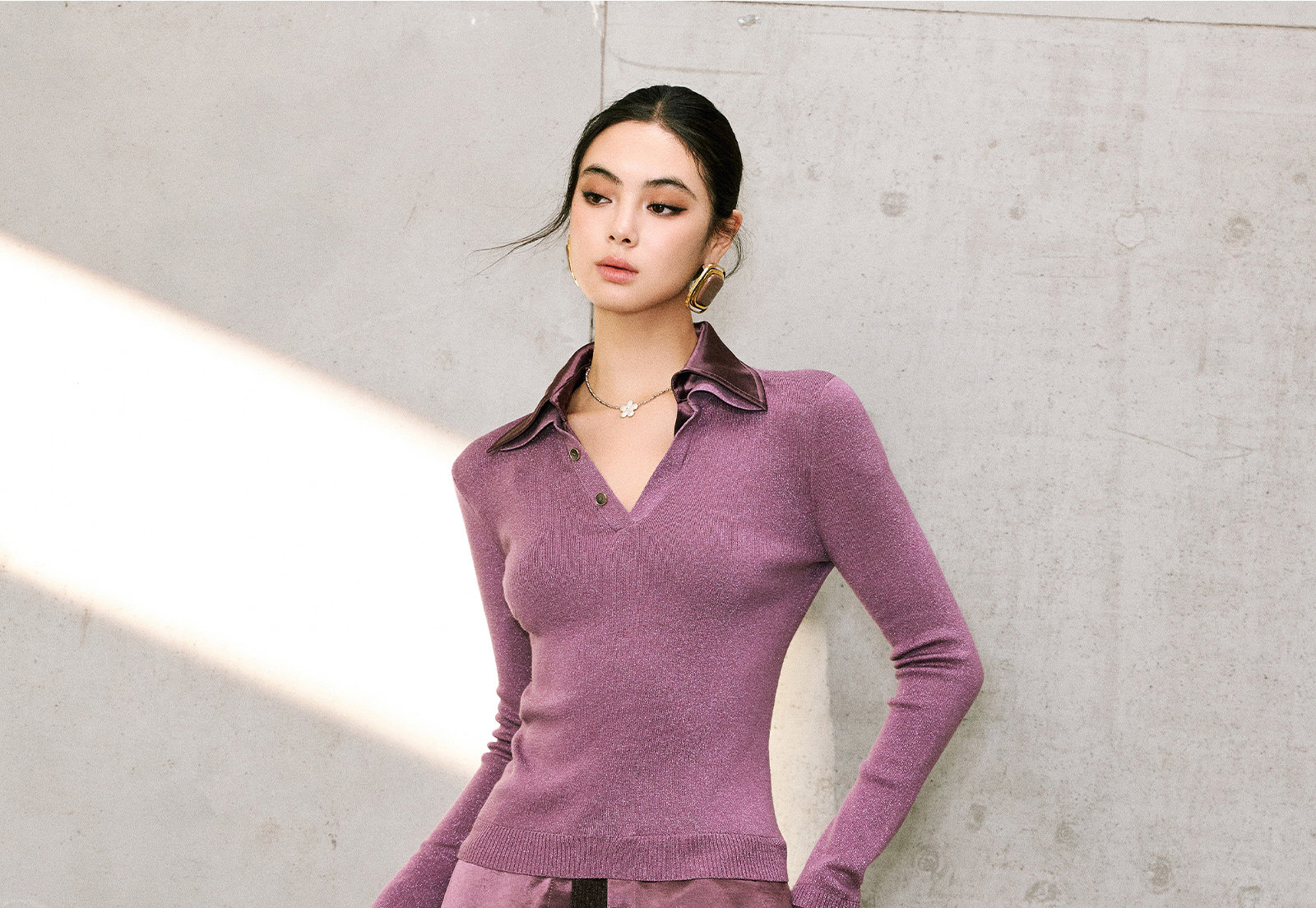 WANGXO|奢雅密闪弹力针织拼接光泽缎面|翻V领层次感假两件上衣