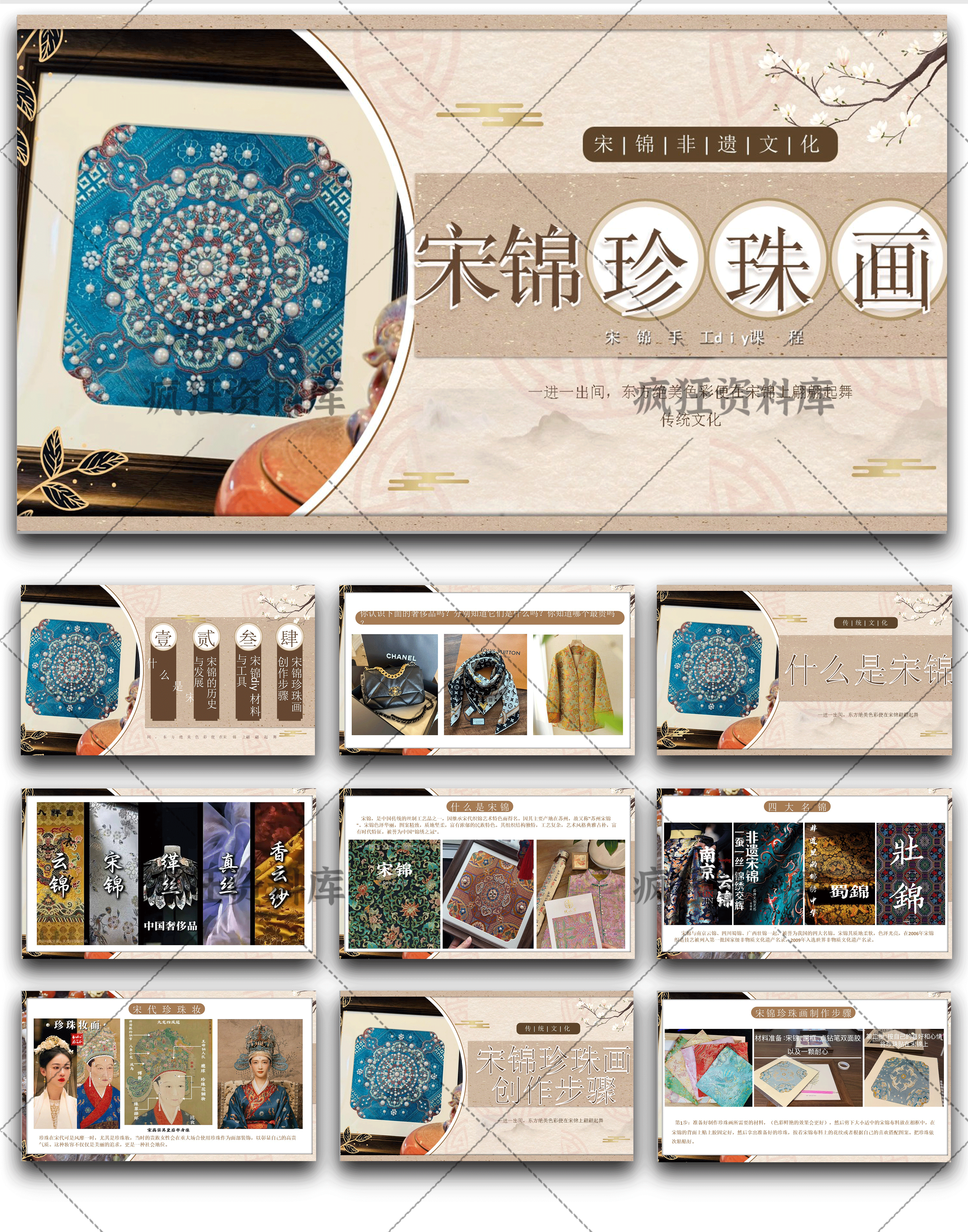 Song Brocade Pearl Painting Ppt Template Finished Product Production Intangible Cultural Heritage Activity Salon Traditional Culture Handicraft Introduction DIY Courseware