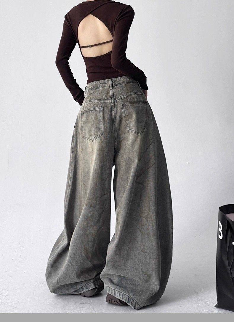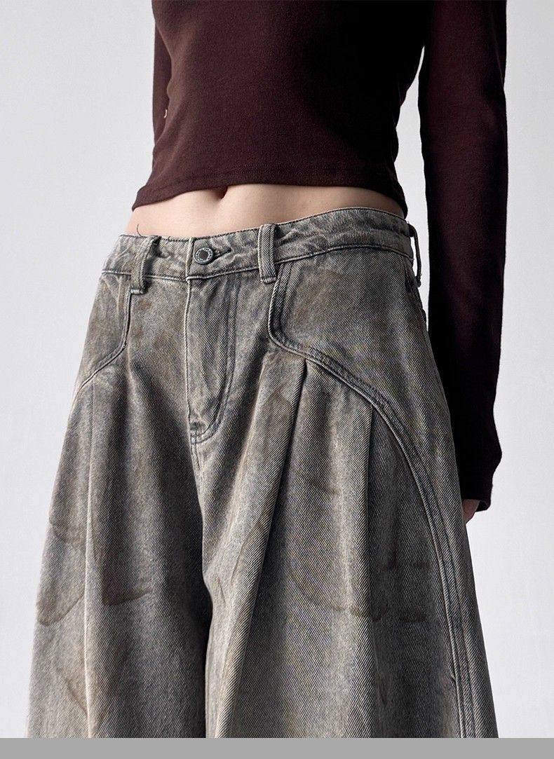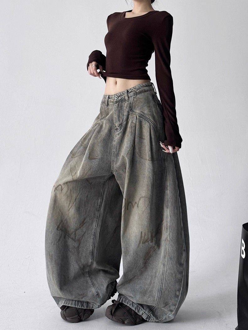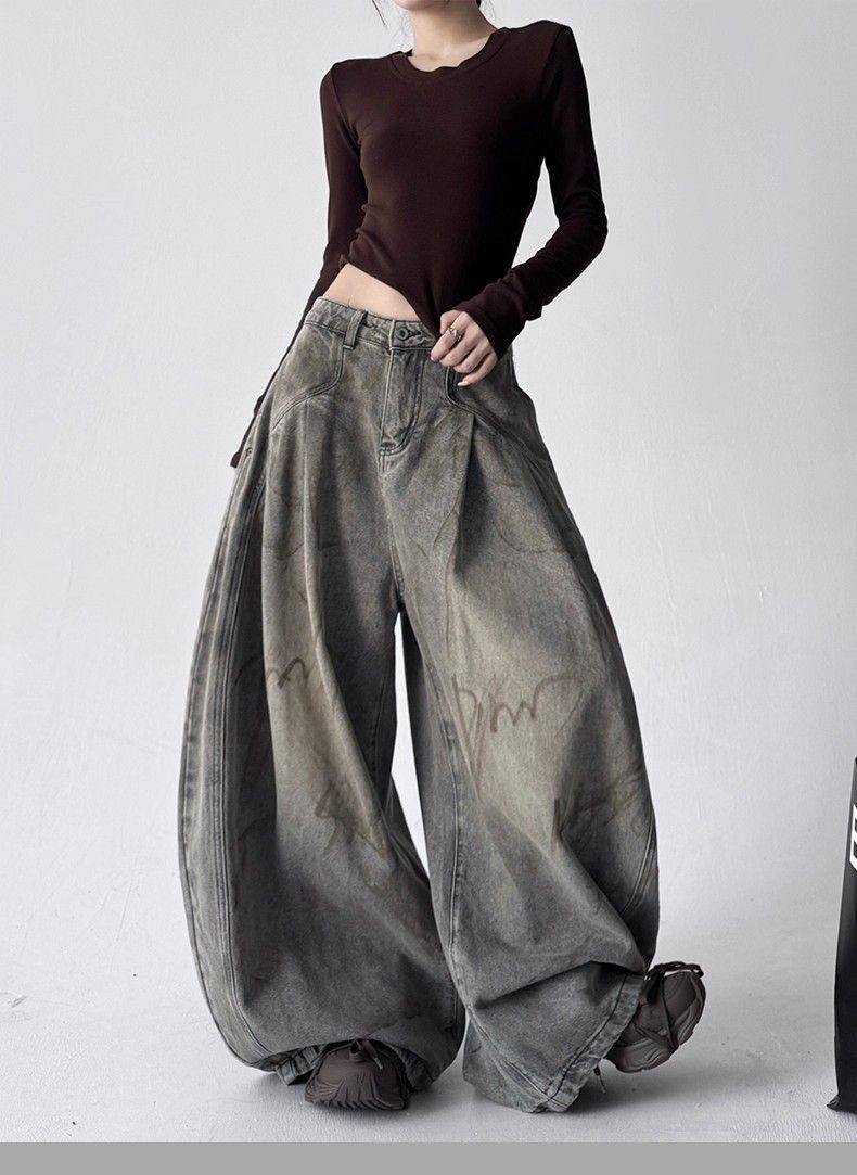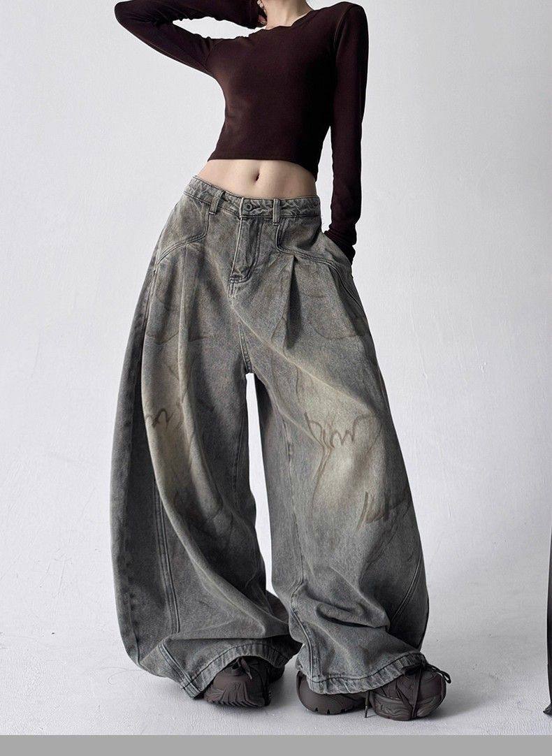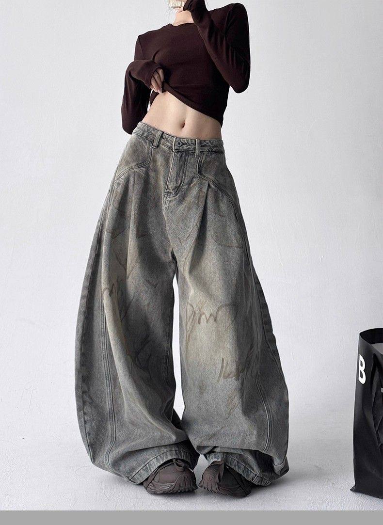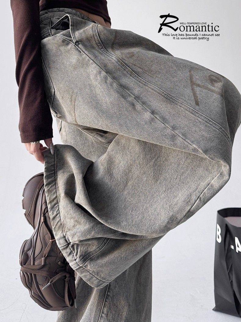 2025新款冬季字母涂鸦牛仔裤女宽松显瘦百搭高个子直筒阔腿长裤子