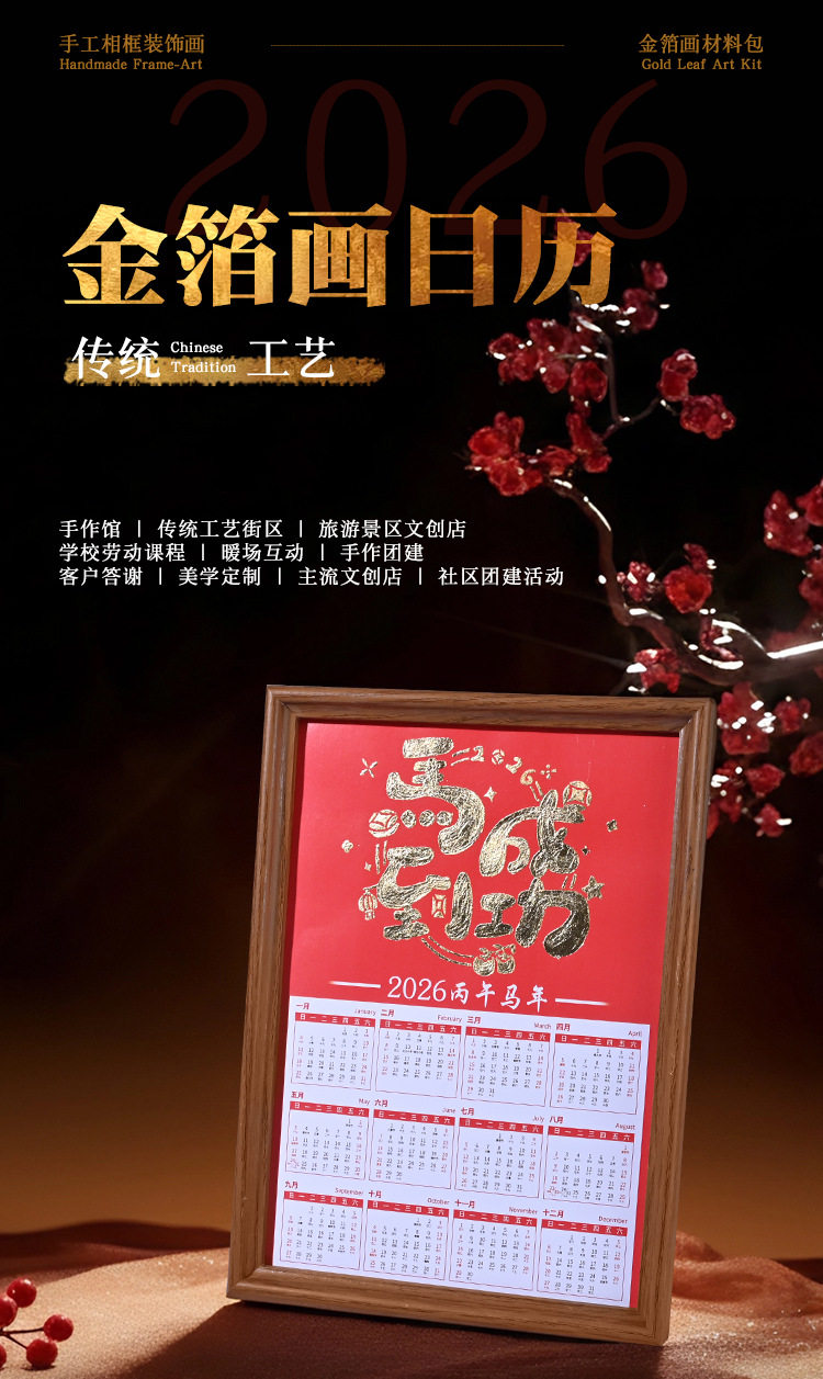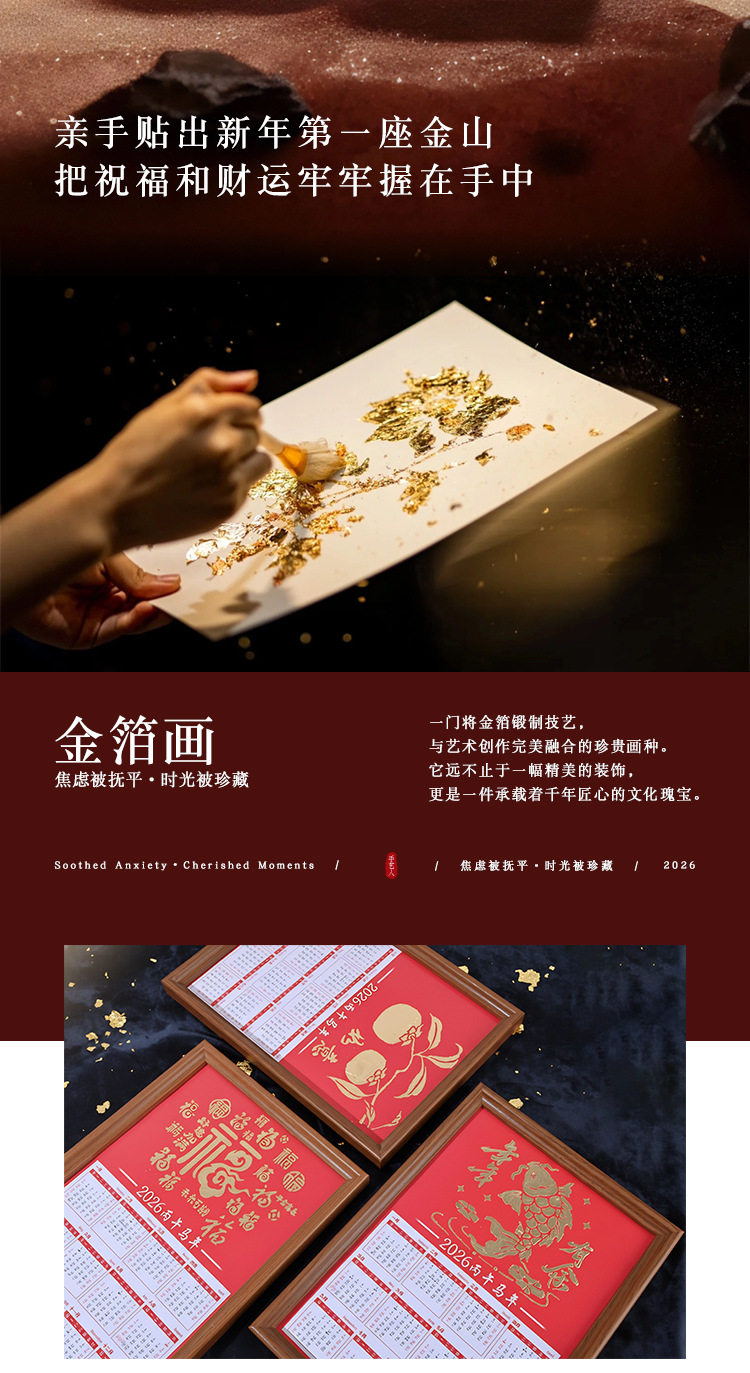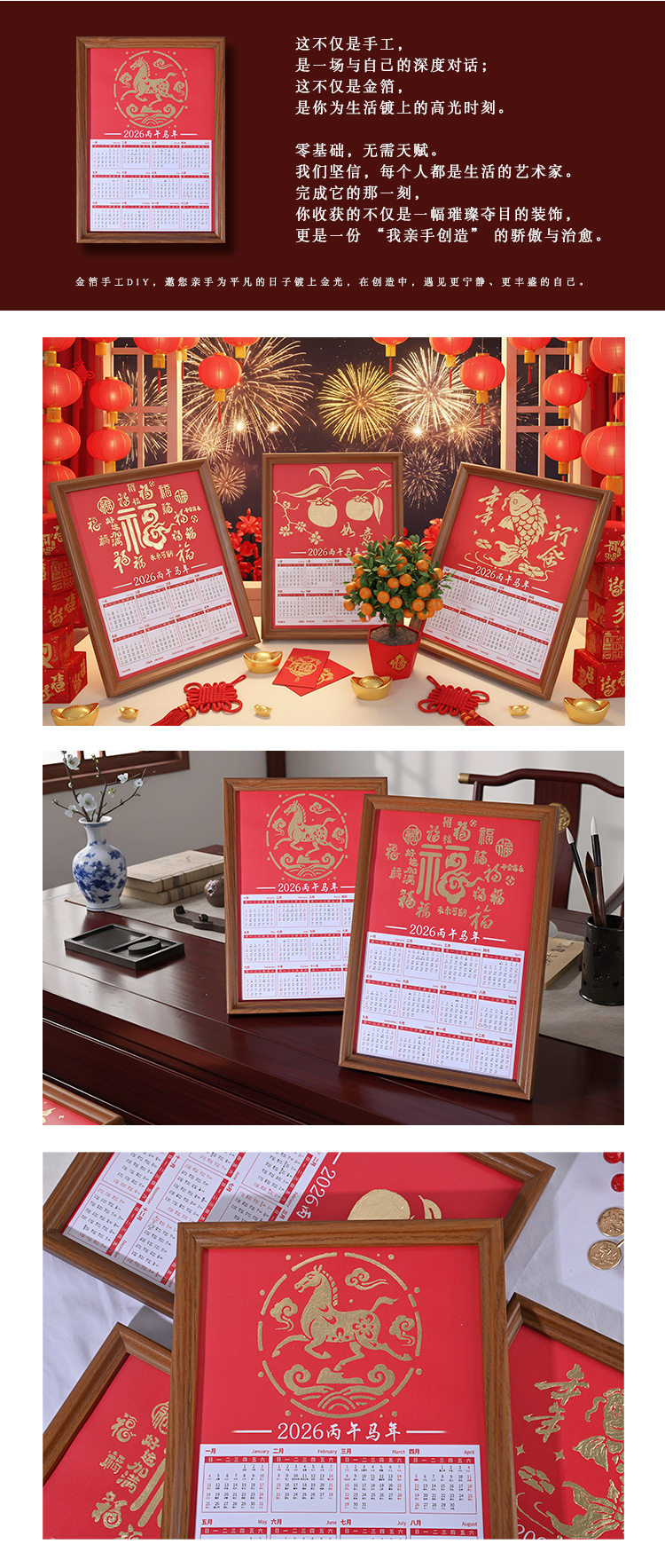 2026 Goldfolien-Malkalender, handgefertigt, DIY-Fotorahmen, gedeckter Tisch, Fu-Charakter, verbrannte Folie, dekorative Malerei, Jahr des Pferdes, kulturelles und kreatives Aufwärmen, handgefertigt