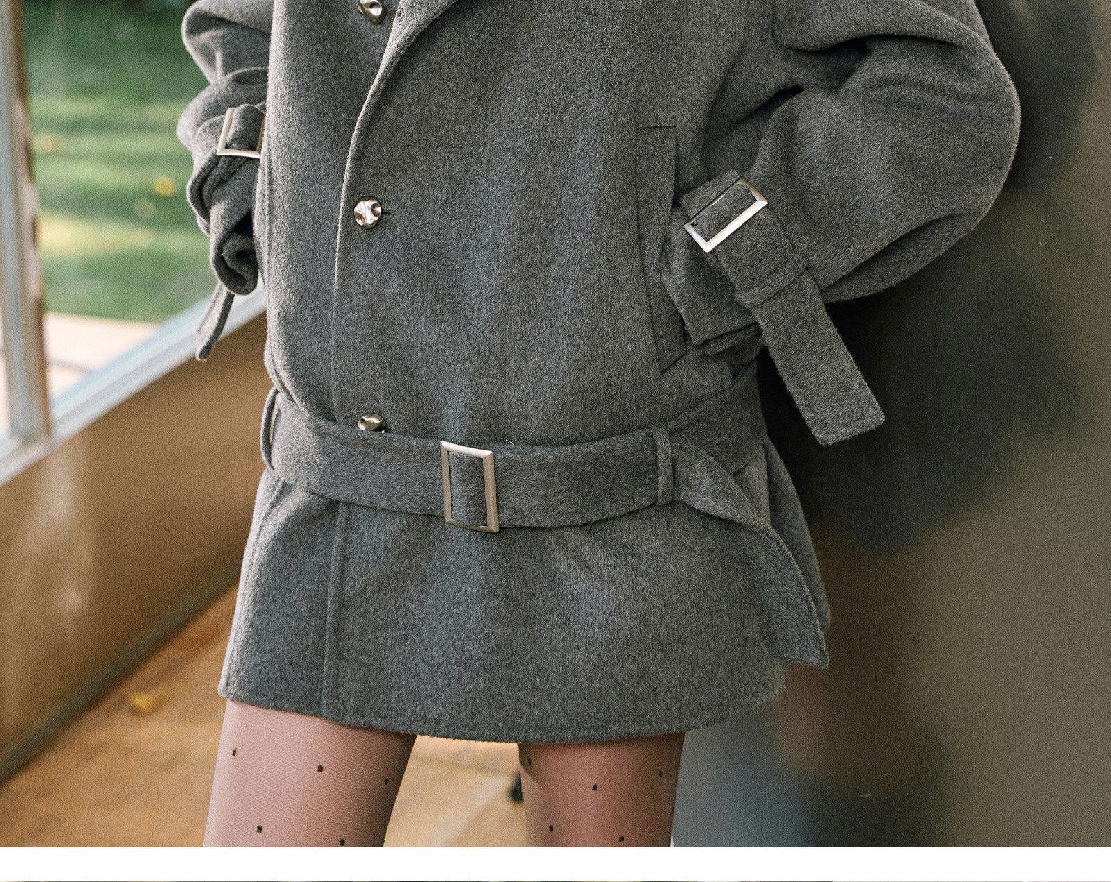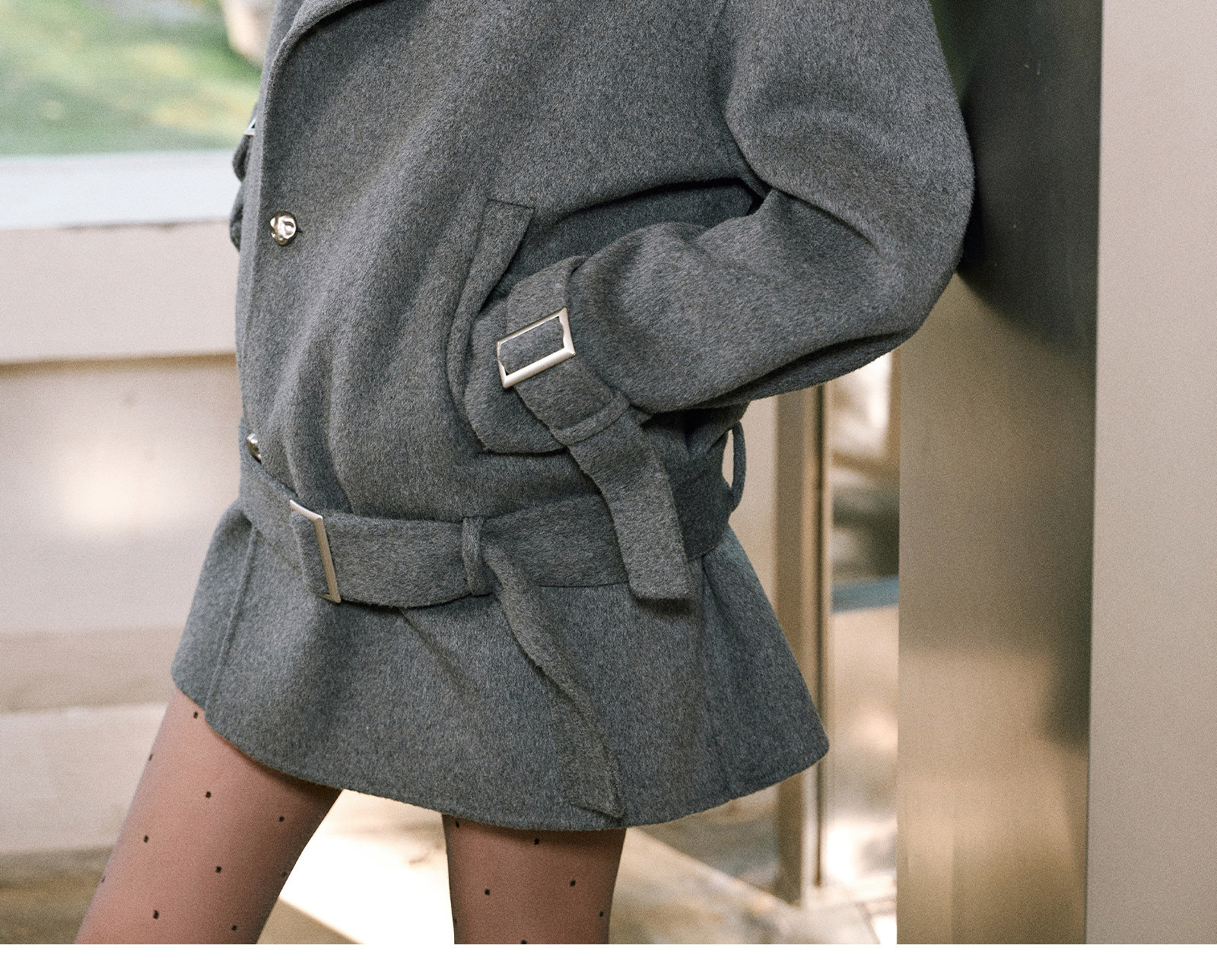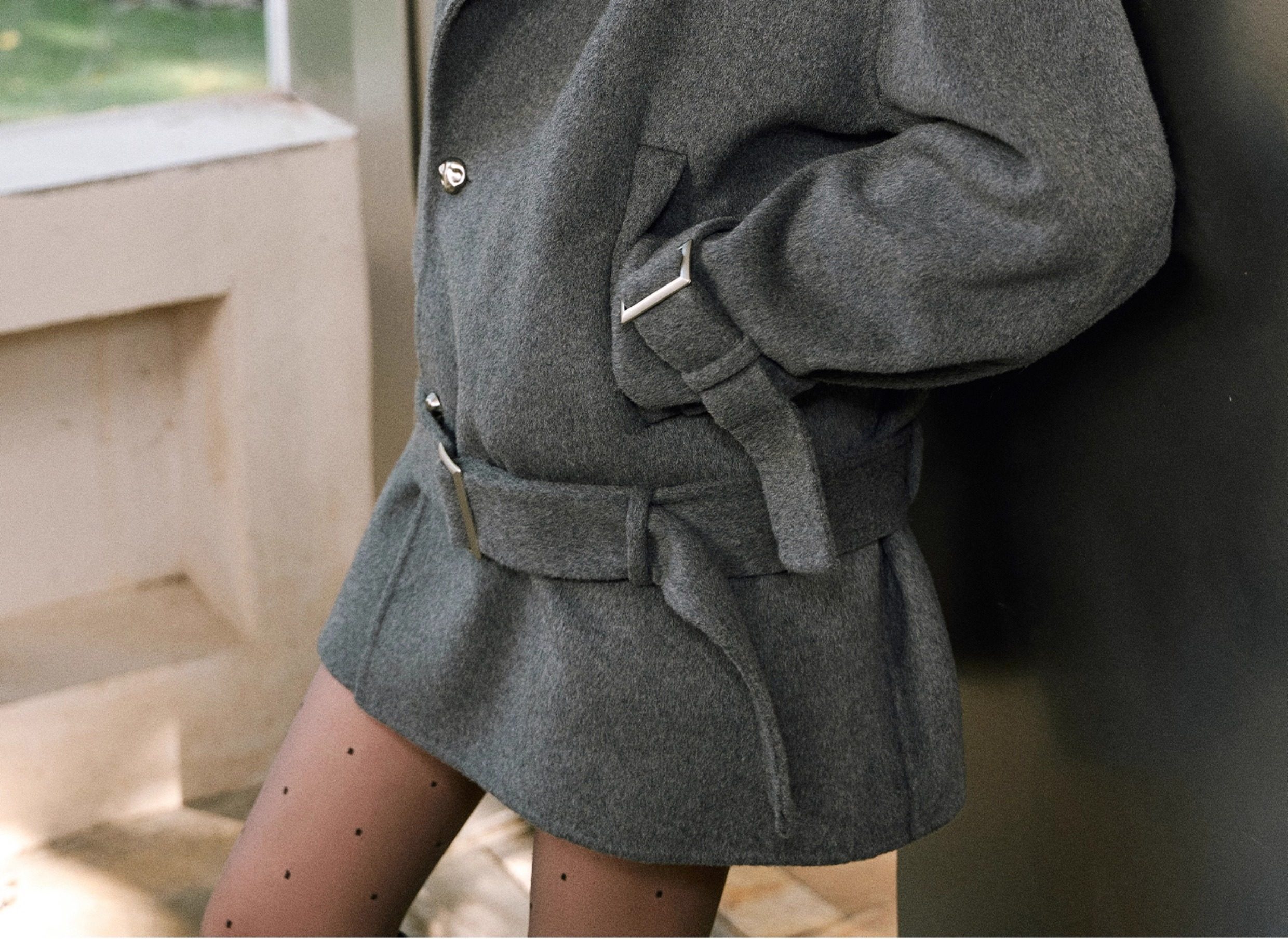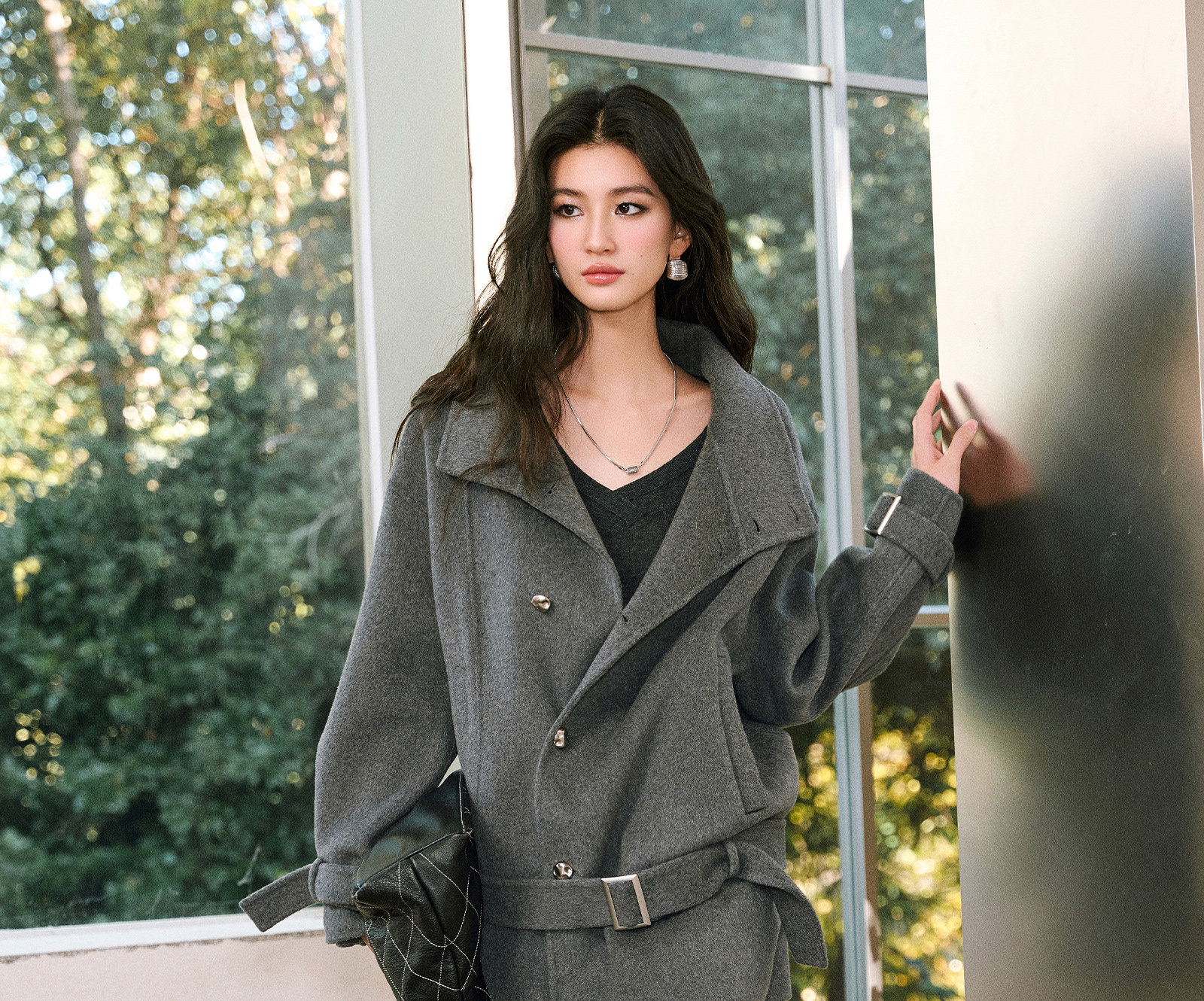 Wangxo|Custom-Spun Wool and Cashmere in the Perfect Golden Ratio|Gray Double-Sided Wool Coat with Large Lapel and Waist-Cinching Belt