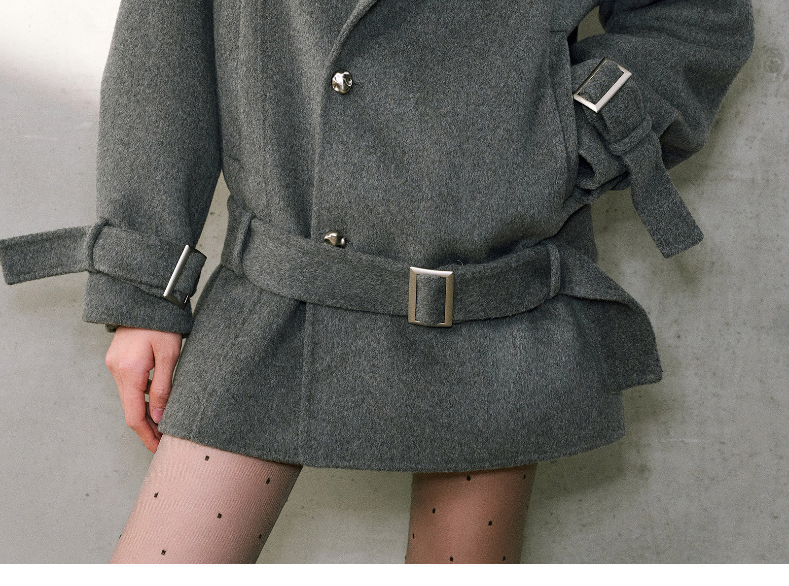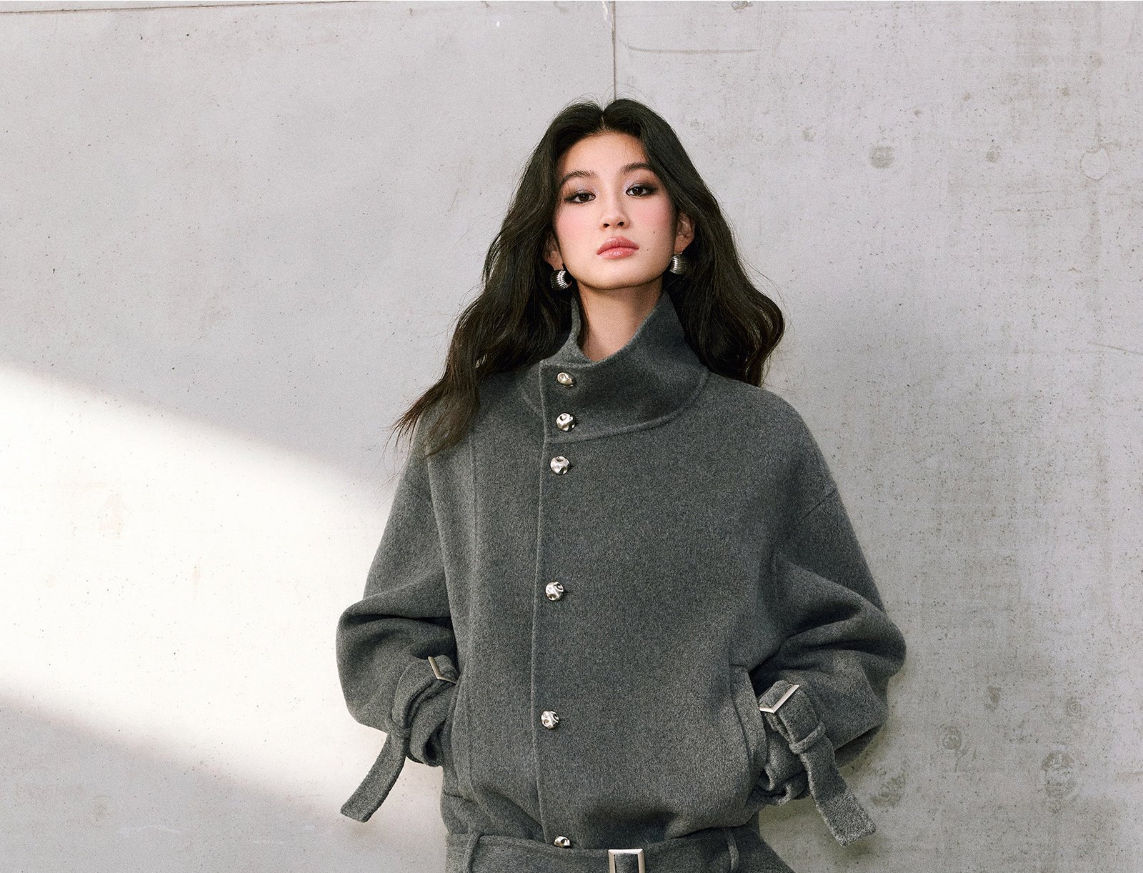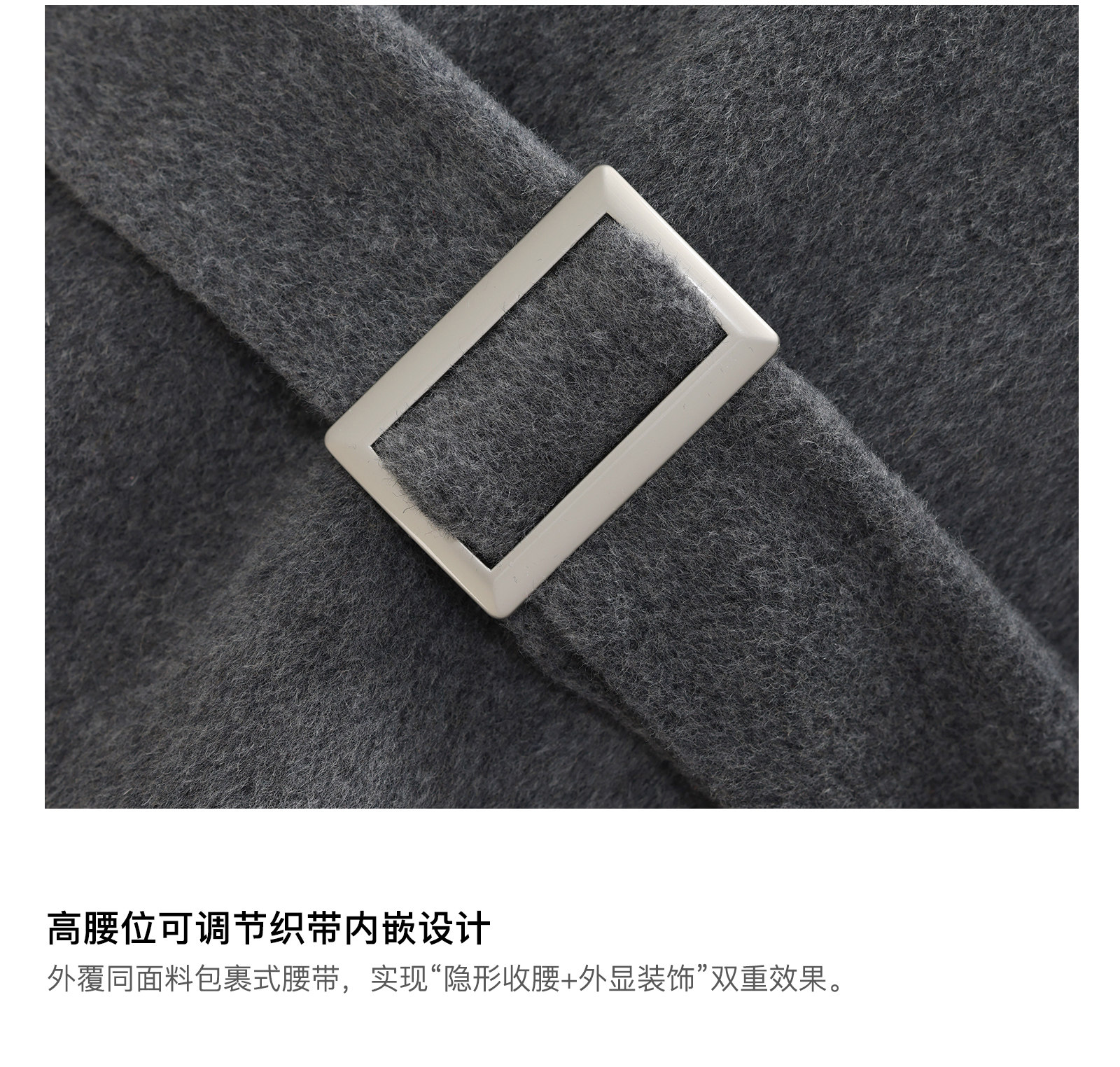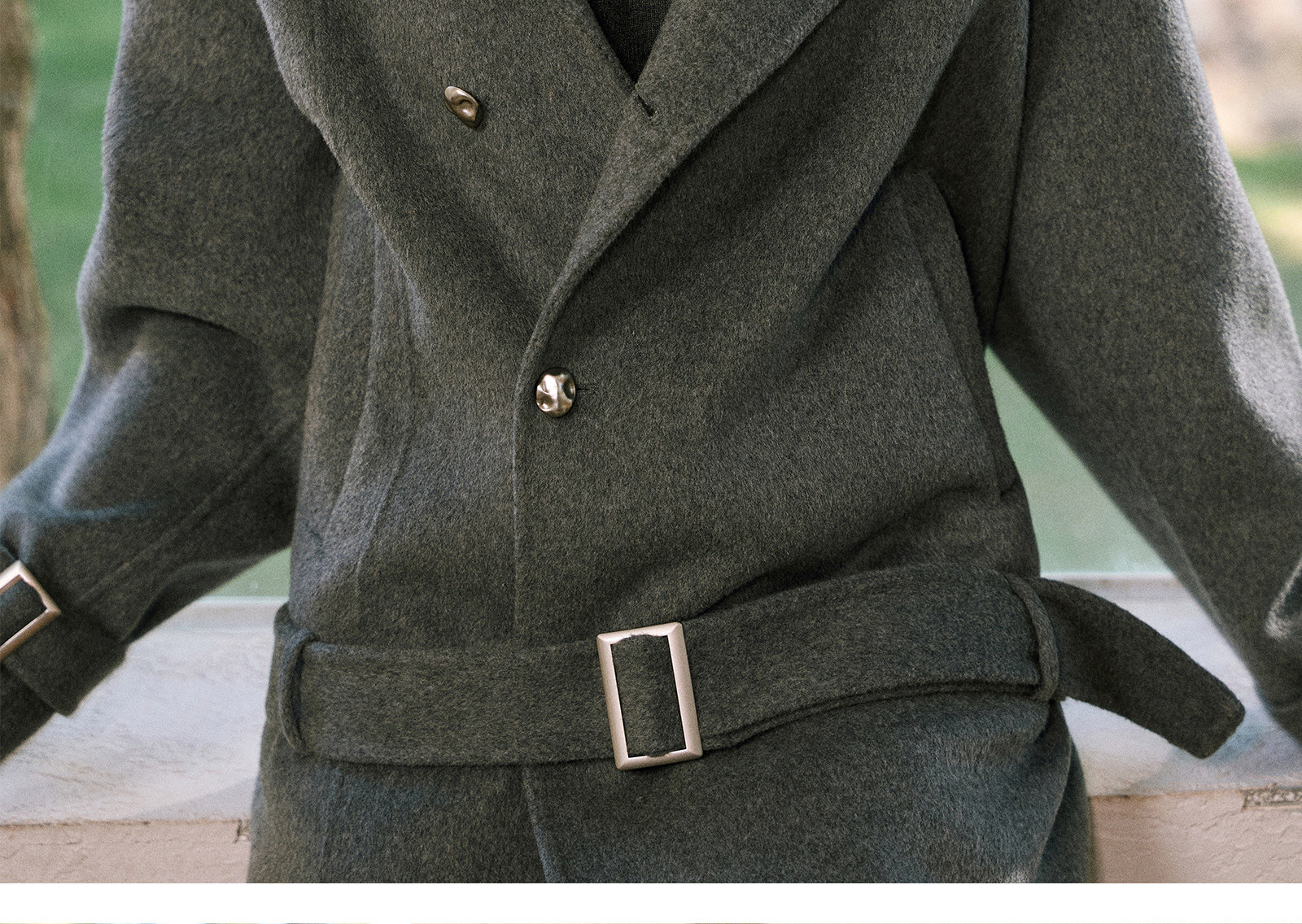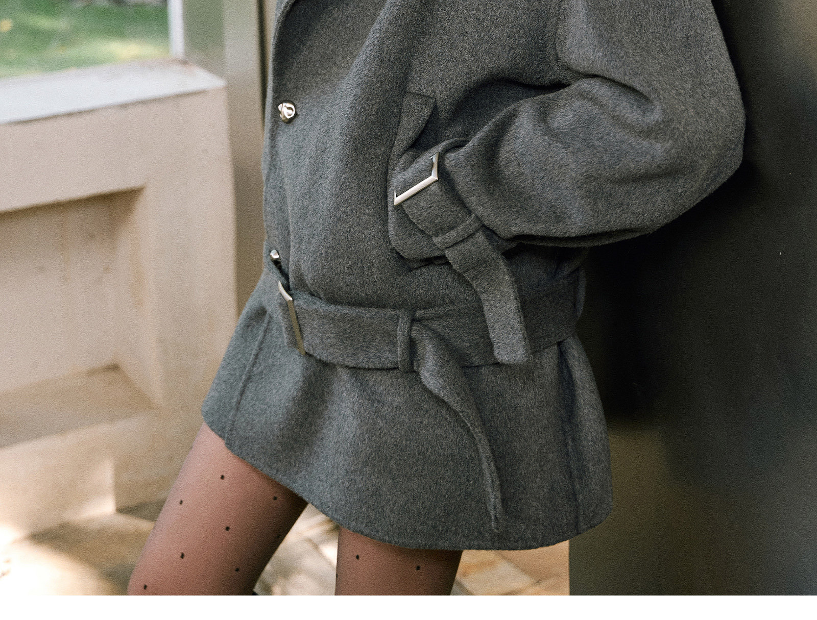 Wangxo|Custom-Spun Wool and Cashmere in the Perfect Golden Ratio|Gray Double-Sided Wool Coat with Large Lapel and Waist-Cinching Belt