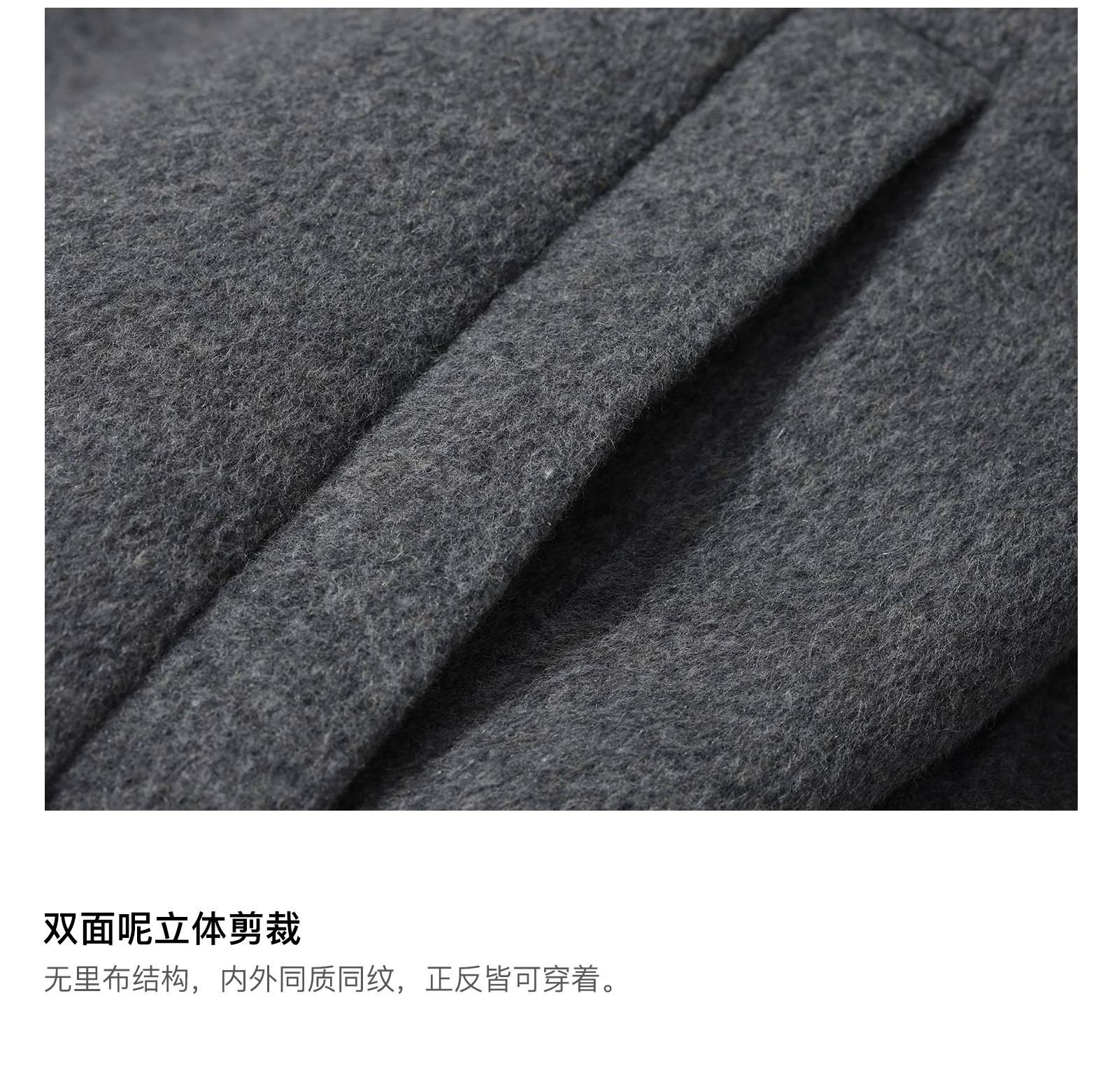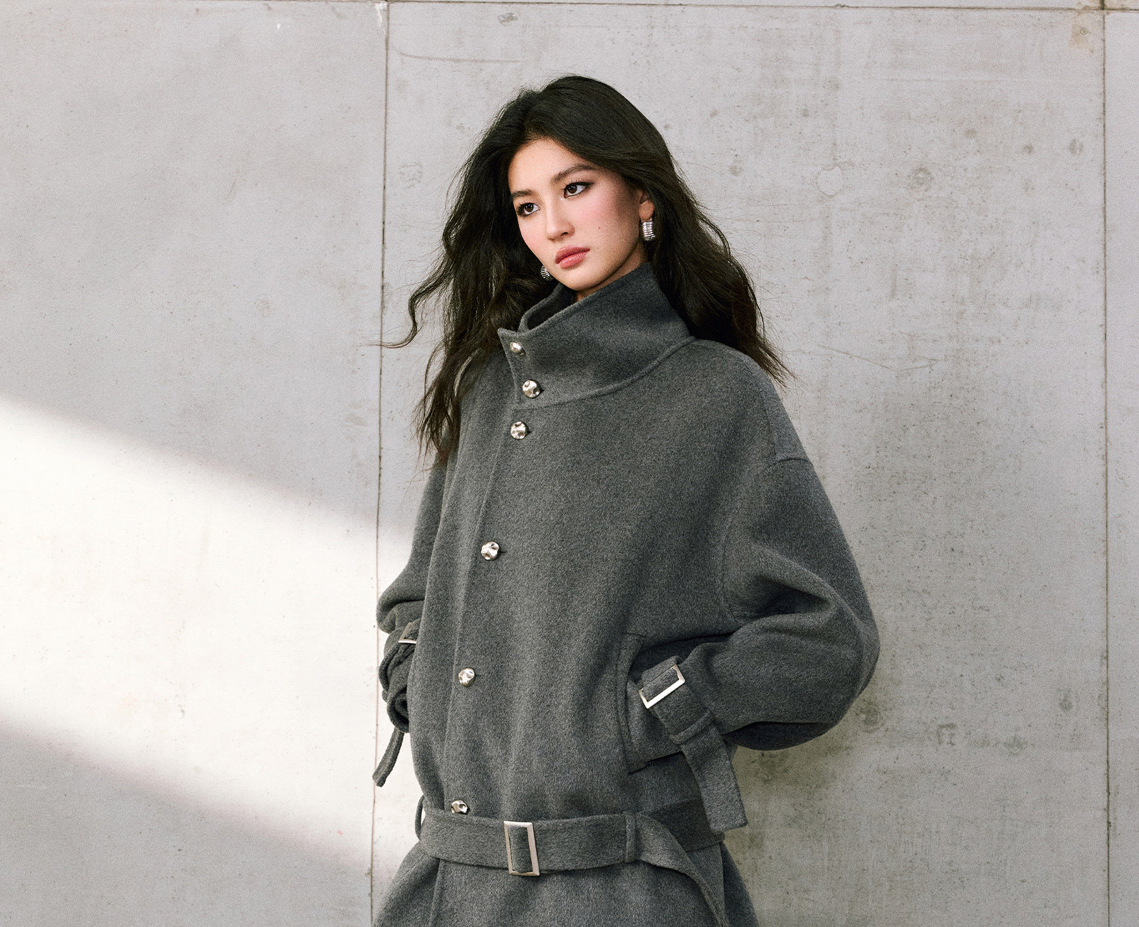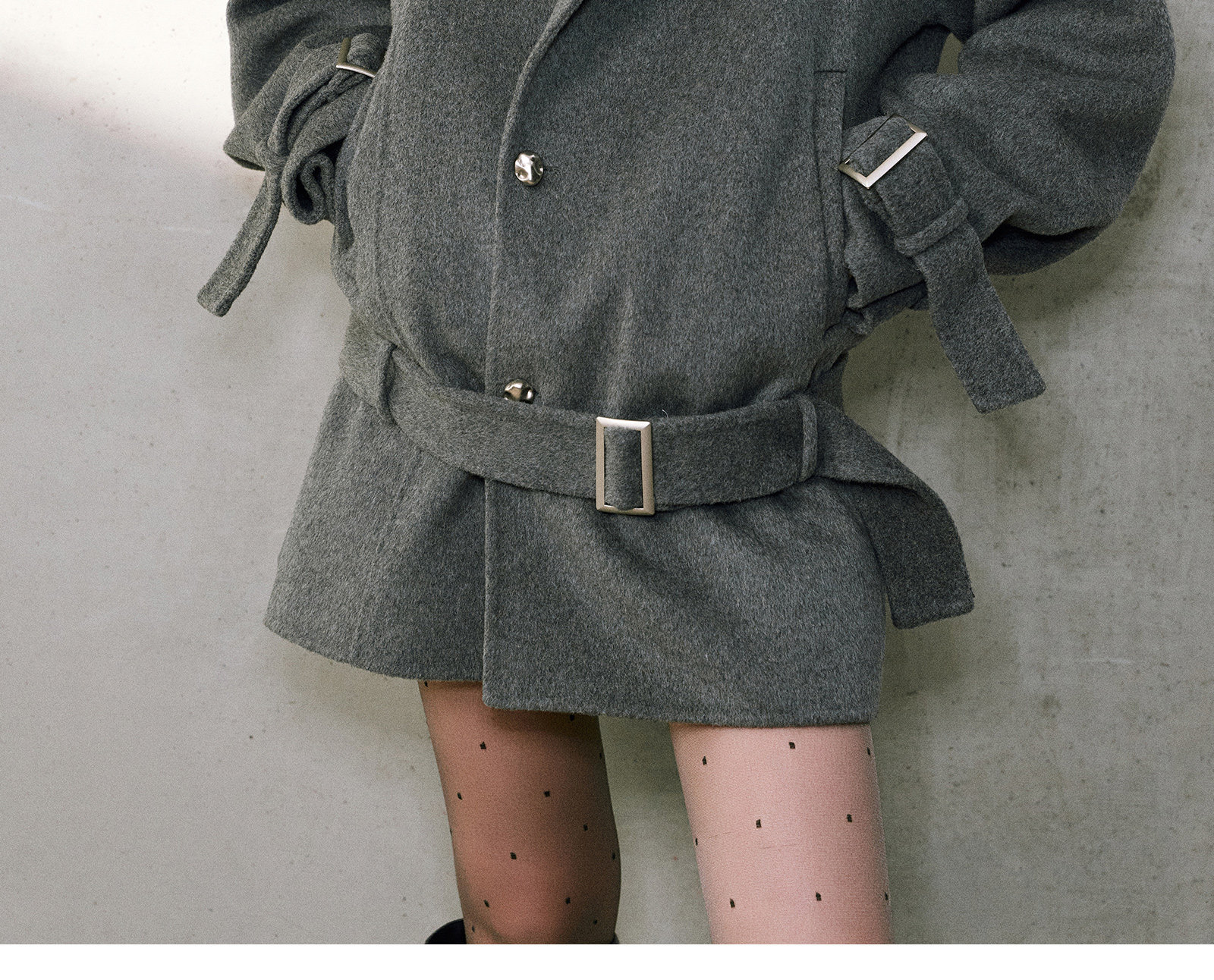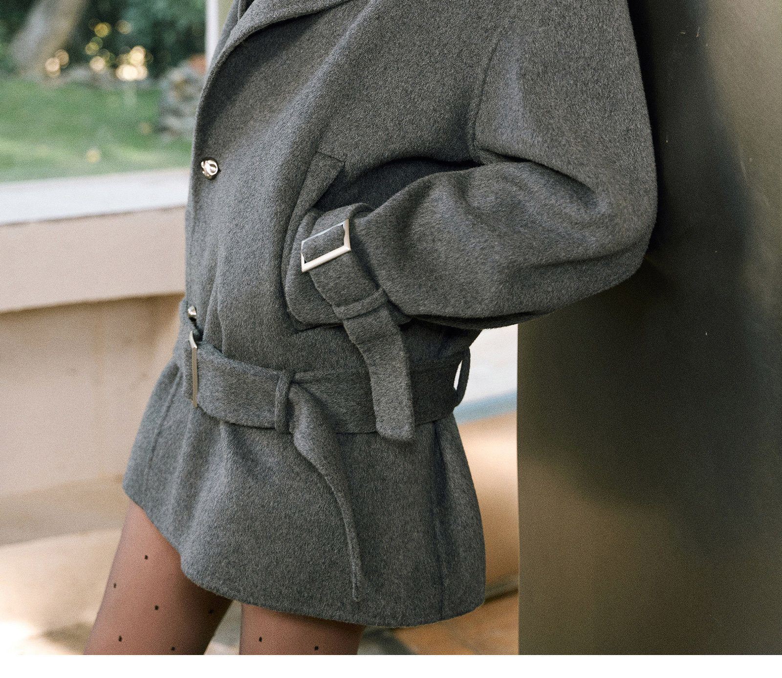 Wangxo|Custom-Spun Wool and Cashmere in the Perfect Golden Ratio|Gray Double-Sided Wool Coat with Large Lapel and Waist-Cinching Belt