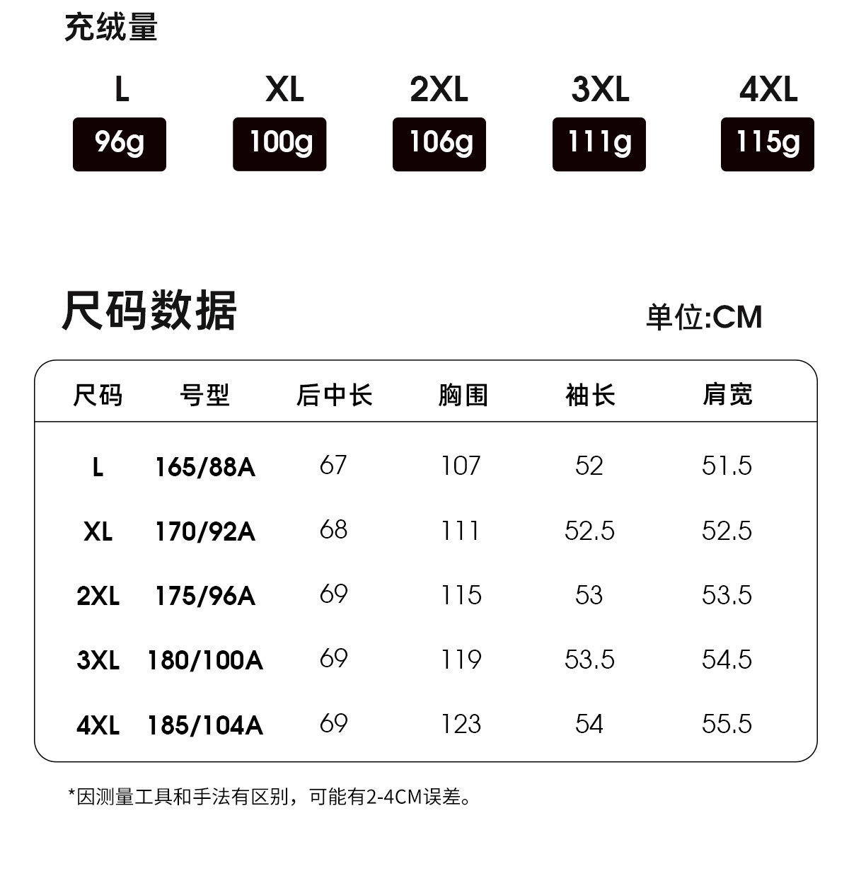 Fleece filling amount (g) 96-115g