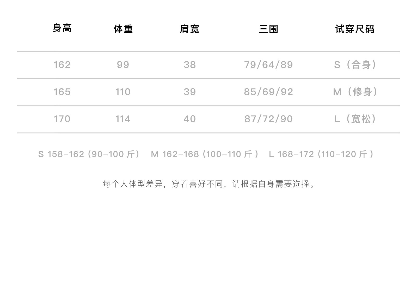 China (cm) 160-165/84-86 165-170 / 88-90 167-172 / 92-96 168-173 / 98-102 170-176 / 106-110