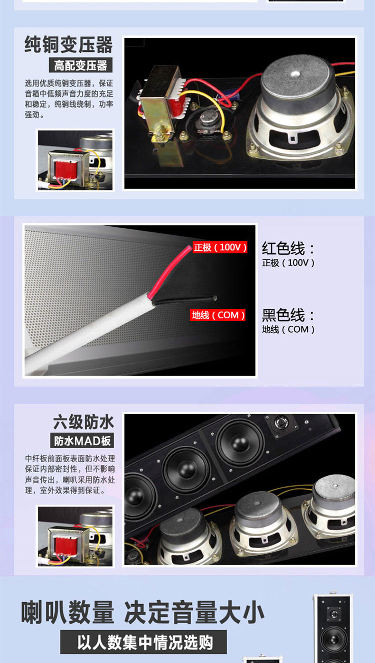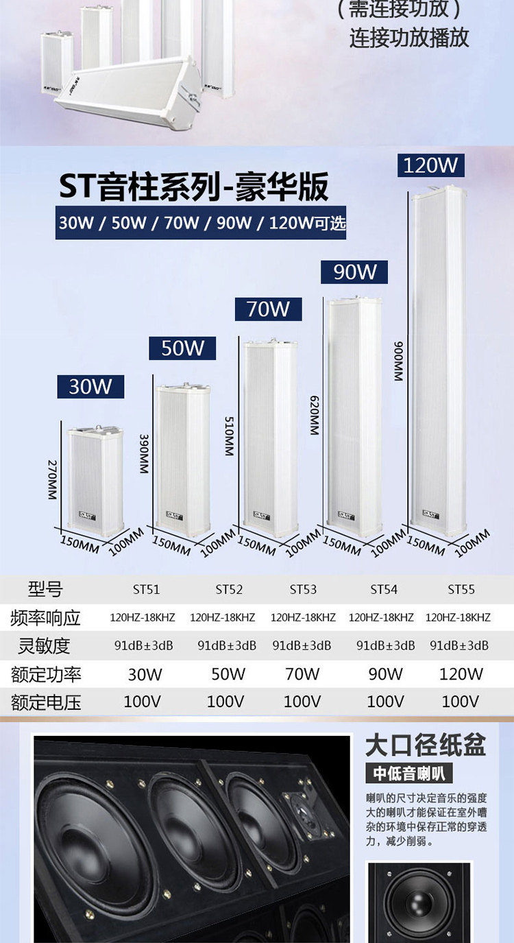 Sort by color 20W requires a power amplifier,30W requires a power amplifier,50W requires a power amplifier,70W requires a power amplifier,90W requires a power amplifier,120W requires a power amplifier,Black 30W requires a power amplifier,Black 50W requires a power amplifier,Black 70W requires a power amplifier,Black 90W requires a power amplifier,Black 120W requires a power amplifier,60W-ST301 requires a power amplifier,90W-ST302 requires a power amplifier,120W-ST303 requires a power amplifier,75W ST-702 requires a power amplifier,100W ST-703 requires a power amplifier,150W ST-704 requires a power amplifier,200W ST-705 requires a power amplifier,240W ST-706 requires a power amplifier,8-inch high-power sound column 70 watts, requires a power amplifier,8-inch high-power column speaker 120 watts, requires a power amplifier,8-inch high-power column speaker 180 watts, requires a power amplifier,8-inch high-power column speaker 260 watts, requires a power amplifier,80W power amplifier + 20W speaker X1,80W power amplifier + 20W speaker X2,120W power amplifier + 30W speaker X1,120W power amplifier + 30W speaker X2,180W power amplifier + 30W sound column X3,200W power amplifier + 30W speaker X4,300W power amplifier + 30W sound column X6,500W power amplifier + 30W speaker X8,180W power amplifier + 50W speaker X2,200W power amplifier + 50W speaker X3,300W power amplifier + 50W speaker X4,500W power amplifier + 50W sound column X6,700W power amplifier + 50W speaker X8,200W power amplifier + 70W speaker X2,300W power amplifier + 70W sound column X3,500W power amplifier + 70W speaker X4,700W power amplifier + 70W sound column X6,900W power amplifier + 70W speaker X8,300W power amplifier + 90W speaker X2,500W power amplifier + 90W speaker X3,700W power amplifier + 90W sound column X4,900W power amplifier + 90W sound column X6,1200W power amplifier + 90W speaker X8,300W power amplifier + 120W speaker X2,500W power amplifier + 120W speaker X3,900W power amplifier + 120W sound column X4,1200W power amplifier + 120W sound column X6