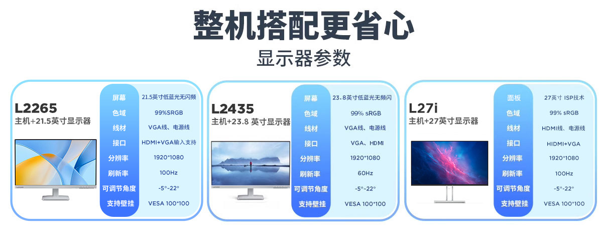 套餐类型 官方标配(单主机),主机+21.5英寸显示器(L2265),主机+23.8英寸显示器(L2435),主机+27英寸显示器(L27i),主机+1TB移动硬盘+主机1年延保(可上门)