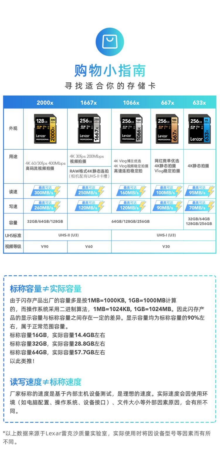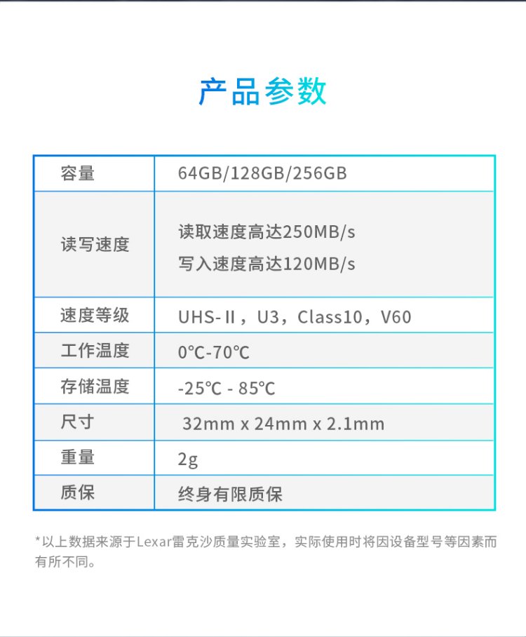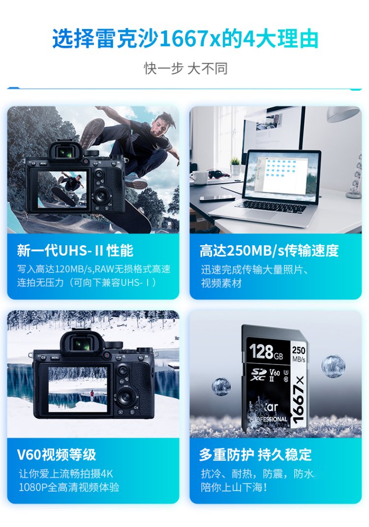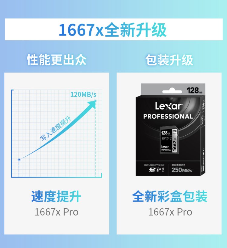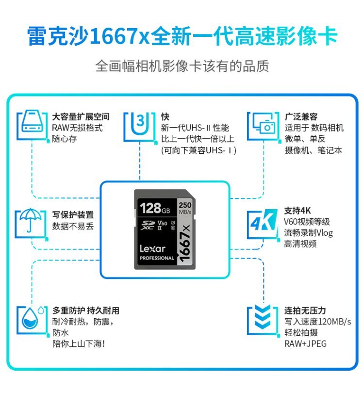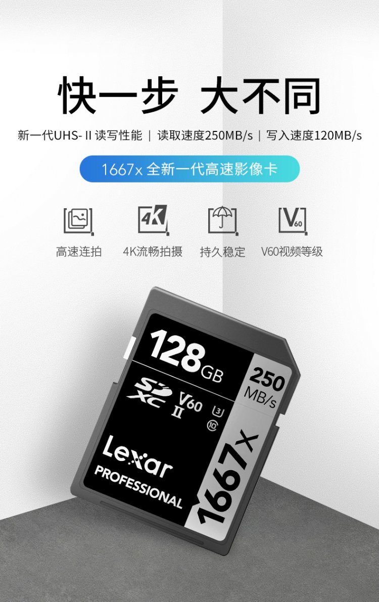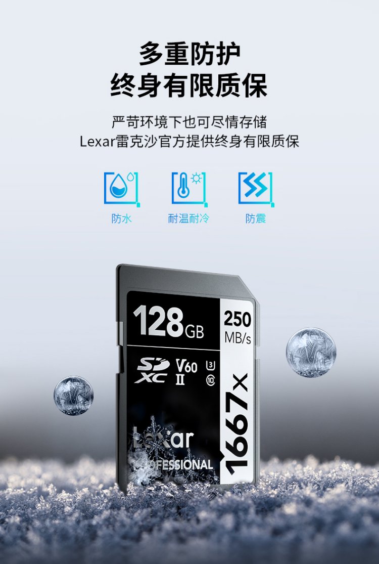 雷克沙(Lexar)128GB SD存储卡 U3 V60 4K数码相机内存卡 读250MB/s 写120MB/s 双排金手指(1667x Pro)