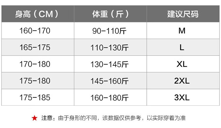 China (cm) 165 / 88-90 170 / 96-98 175 / 108-110 180 / 118-122 185 / 126-130