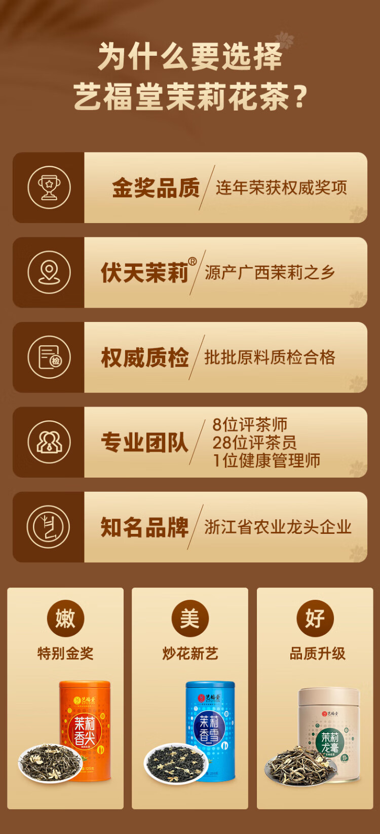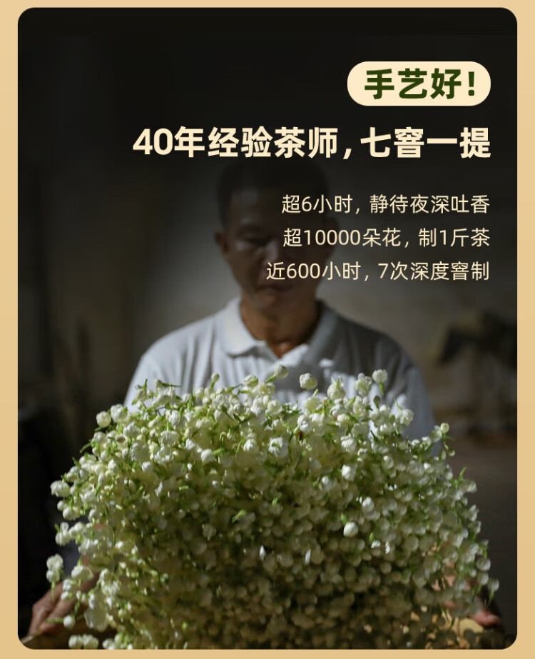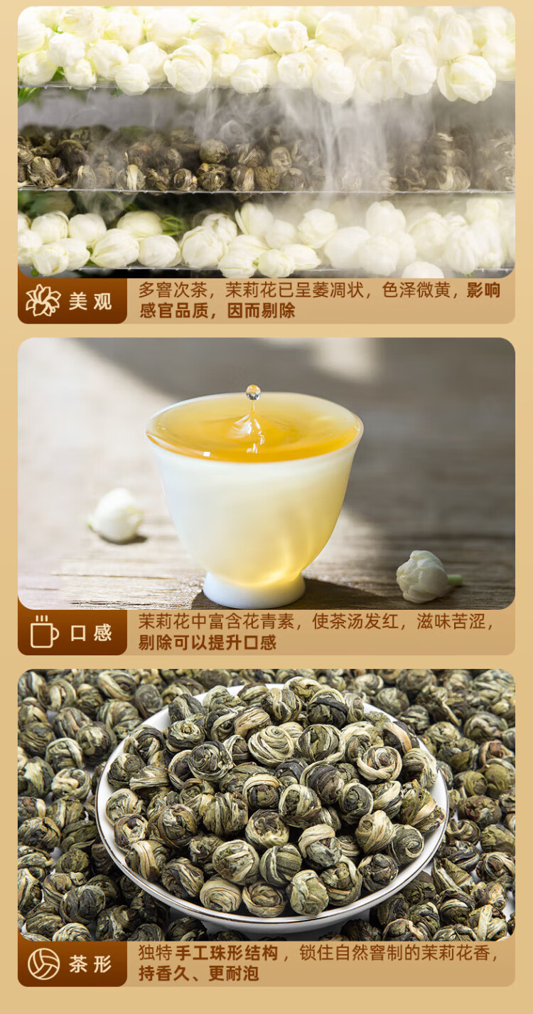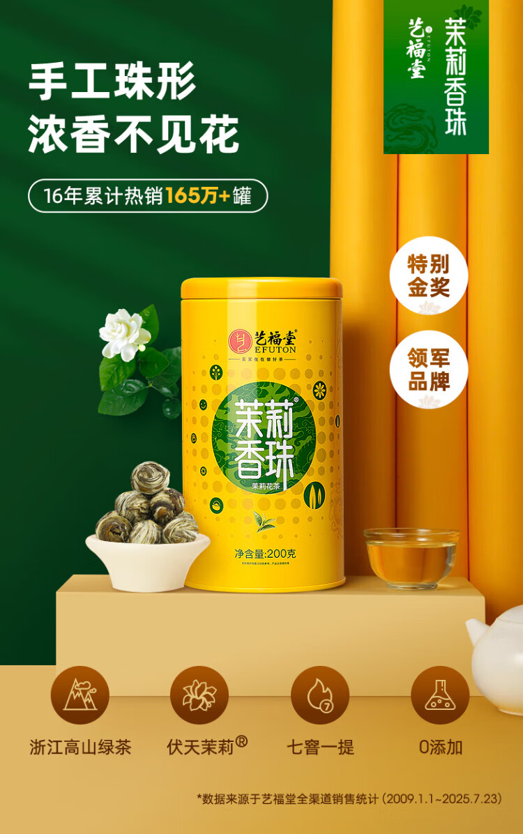 艺福堂茶叶 茉莉花茶 茉莉香珠龙珠新花特种级七窨浓香横县自己喝200g