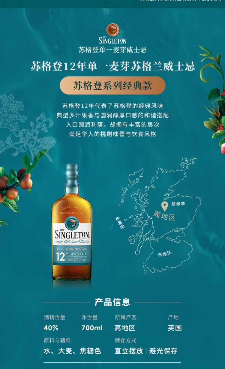 苏格登(Singleton)达夫镇12年 单一麦芽威士忌 700ml 进口洋酒