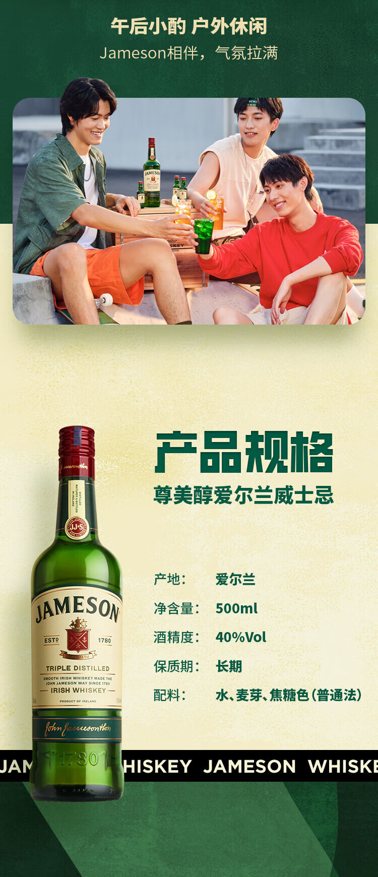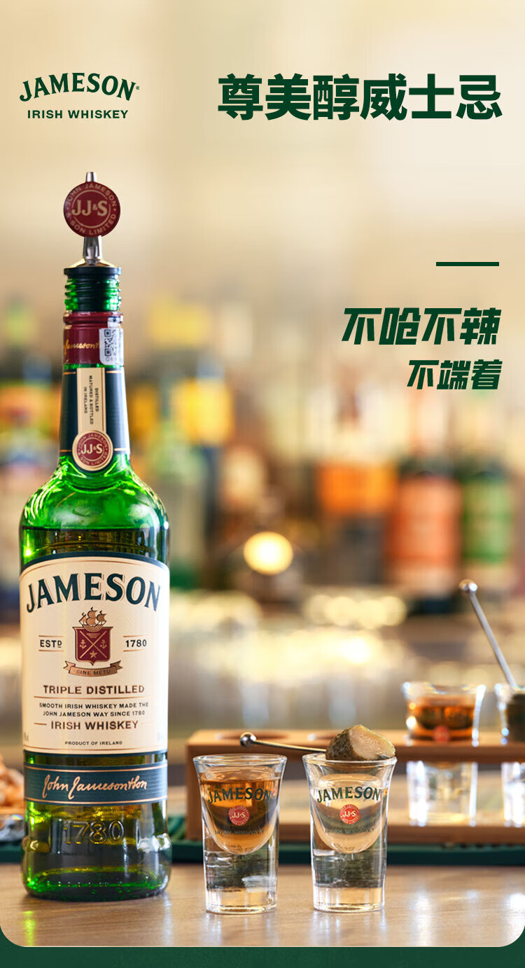尊美醇(Jameson)爱尔兰 调和型威士忌 洋酒 500ml 威士忌花果香 进口威士忌