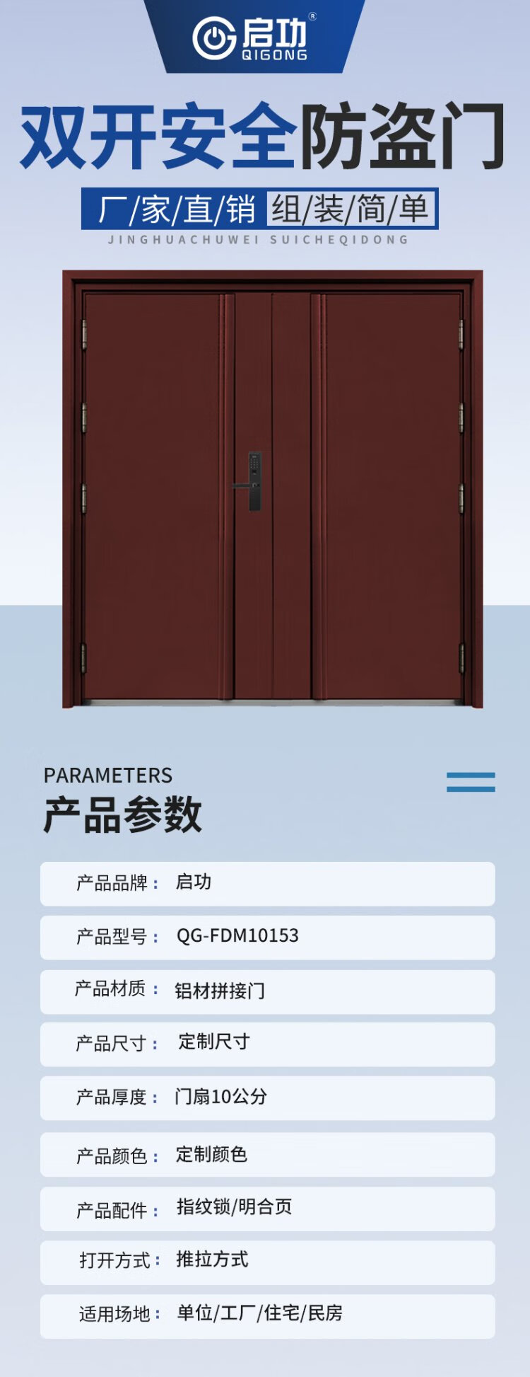 Qigong aluminum spliced door double-open security anti-theft door with smart lock QG-FDM10153