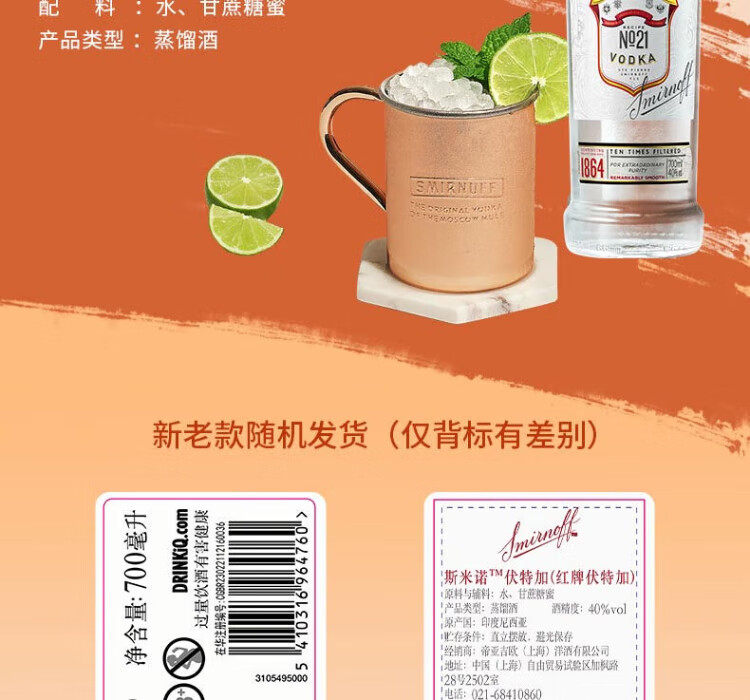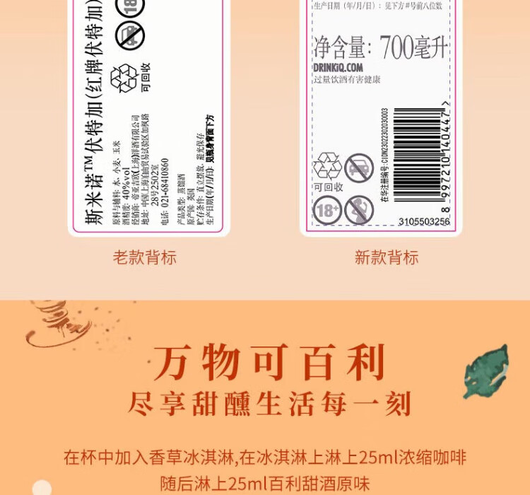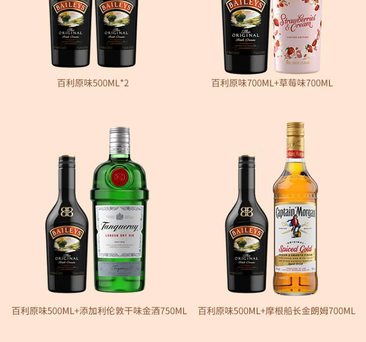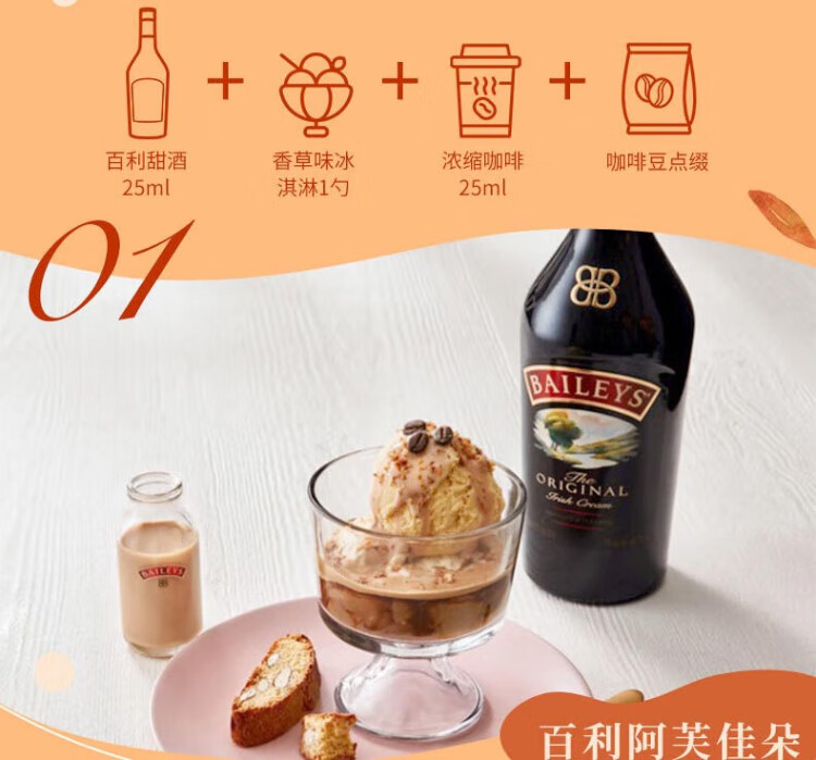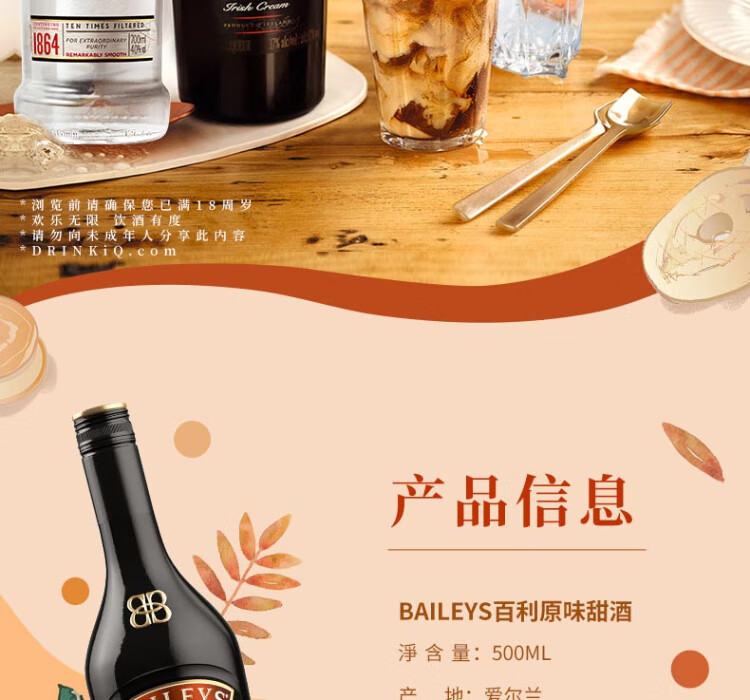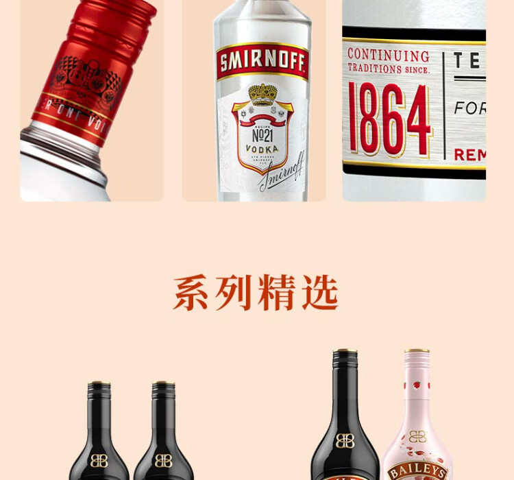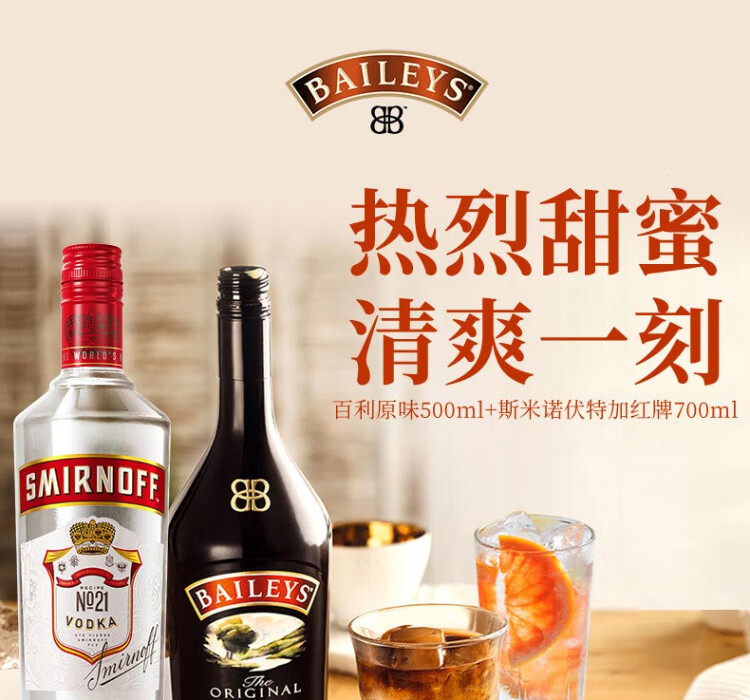 百利(Baileys)甜酒力娇酒原味500ml+斯米诺红牌伏特加700ml调酒基酒