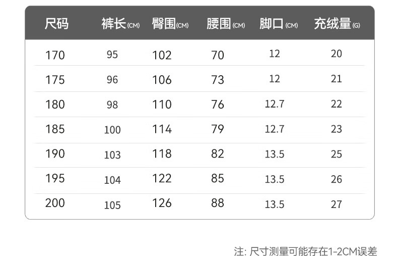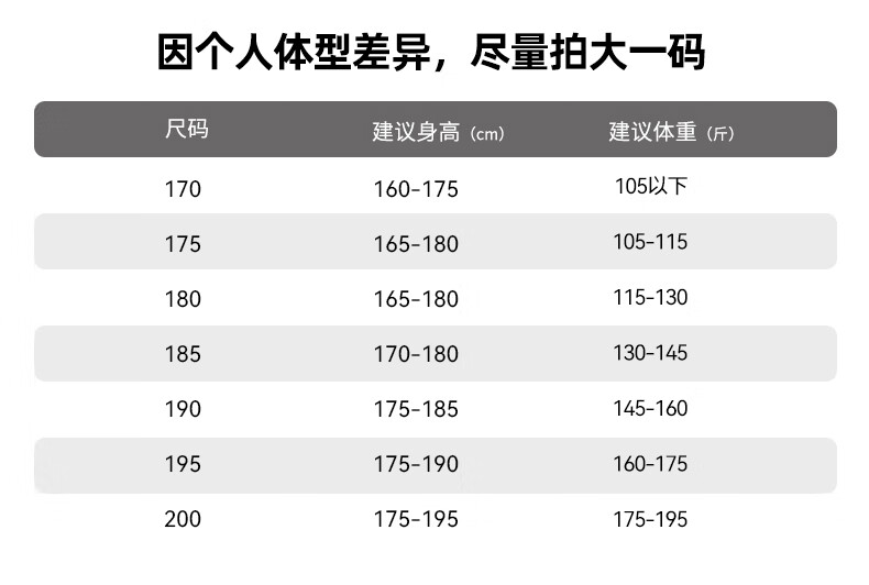 China (cm) 165 / 88-90 170 / 96-98 175 / 108-110 180 / 118-122 185 / 126-130