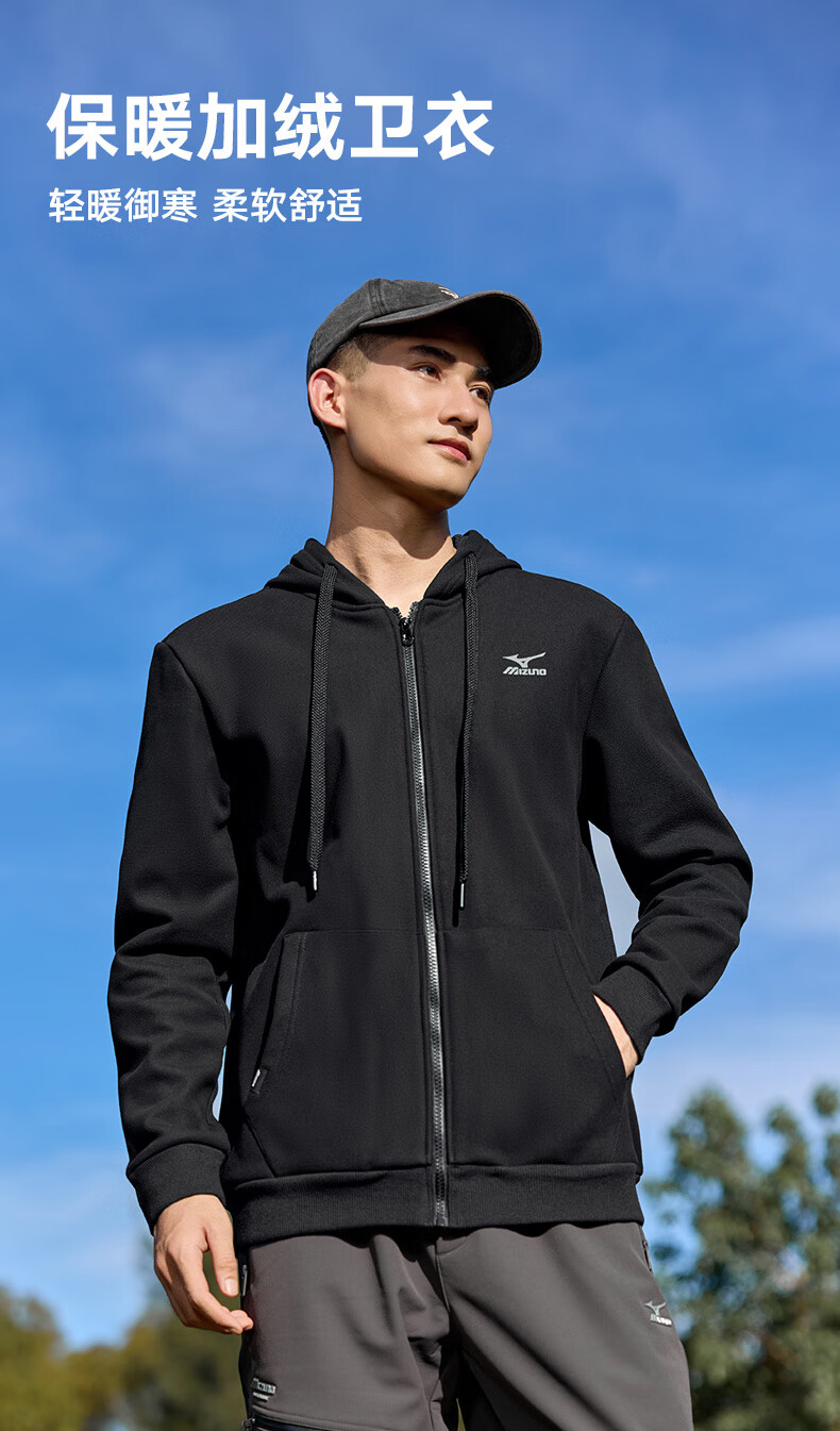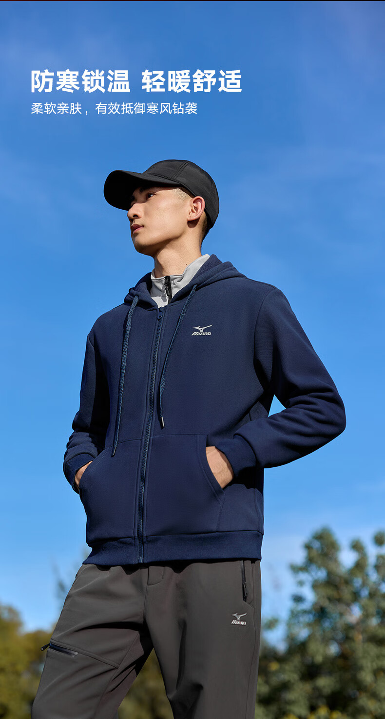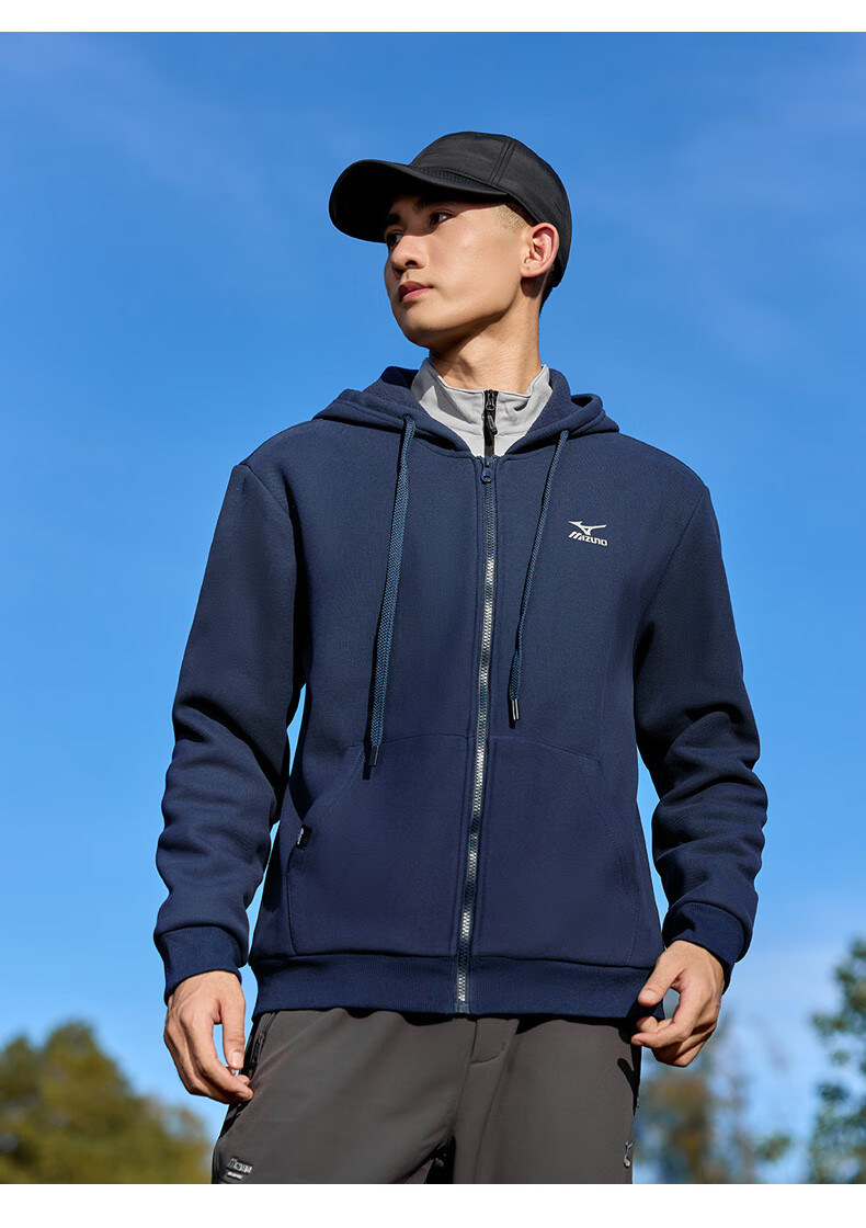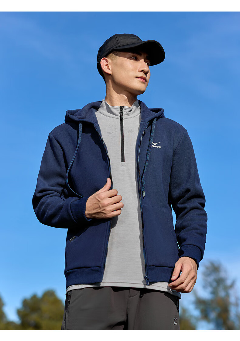 Mizuno MIZUNO outdoor casual sweatshirt men's spring, autumn and winter hooded cardigan plus velvet thickened jacket men's solid color loose