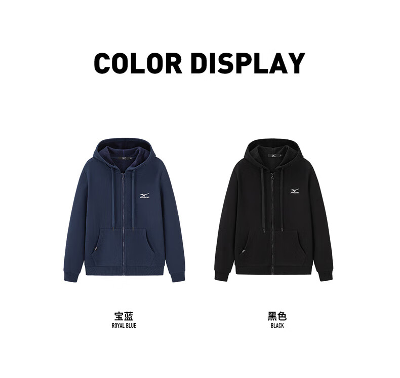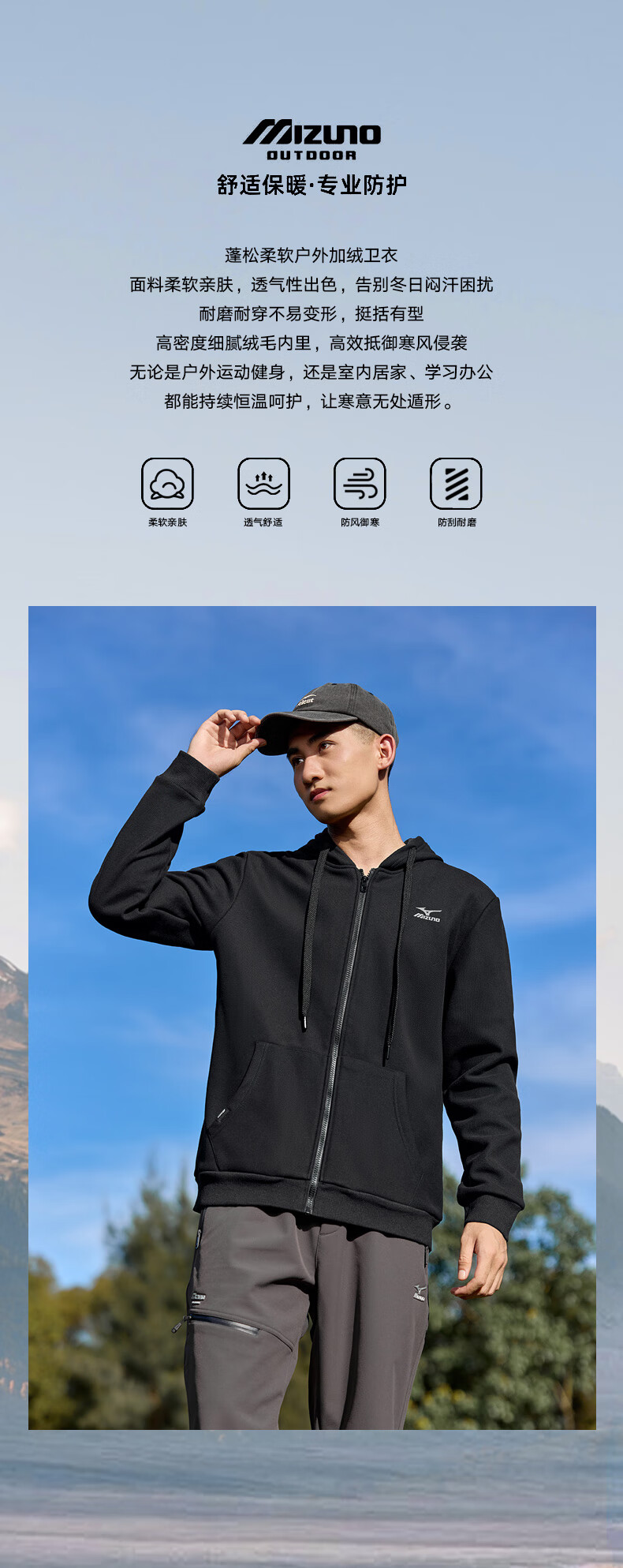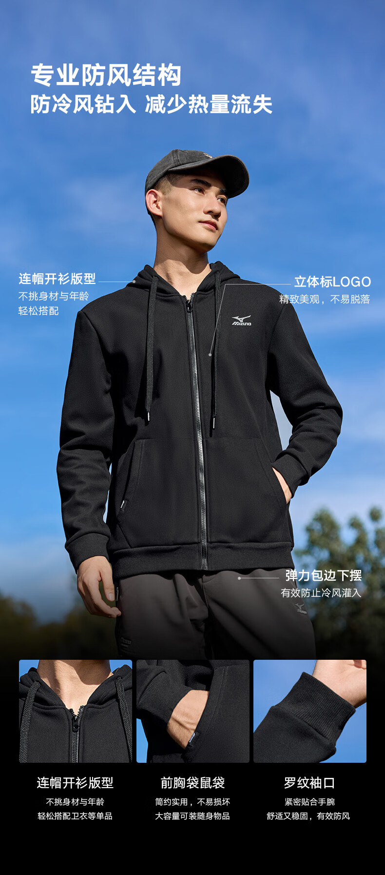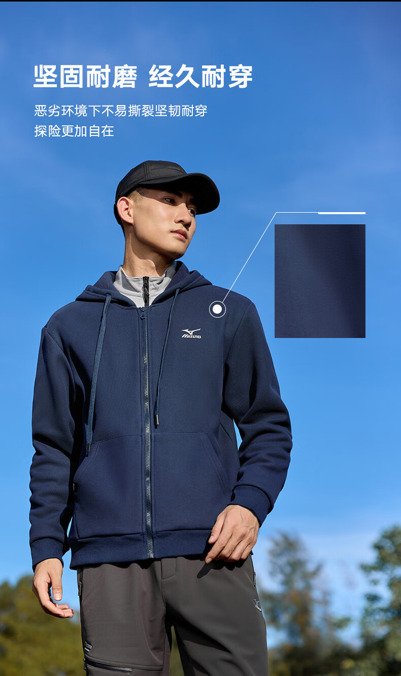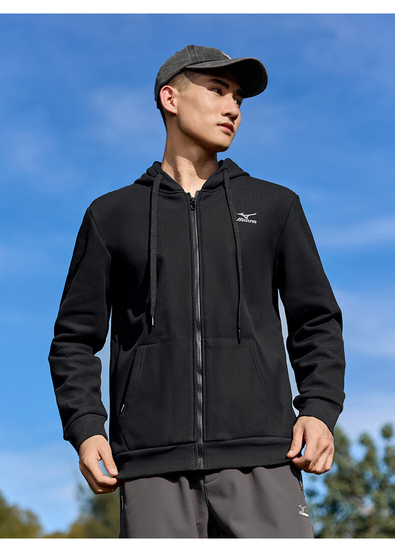 Mizuno MIZUNO outdoor casual sweatshirt men's spring, autumn and winter hooded cardigan plus velvet thickened jacket men's solid color loose