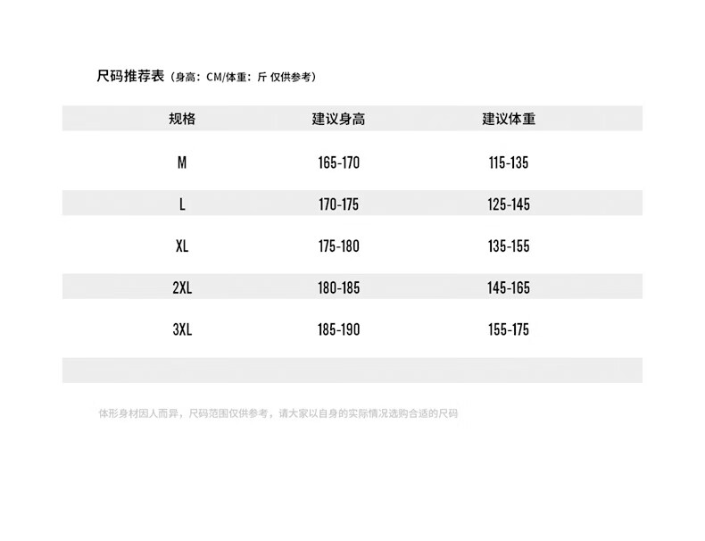 China (cm) 165 / 88-90 170 / 96-98 175 / 108-110 180 / 118-122 185 / 126-130