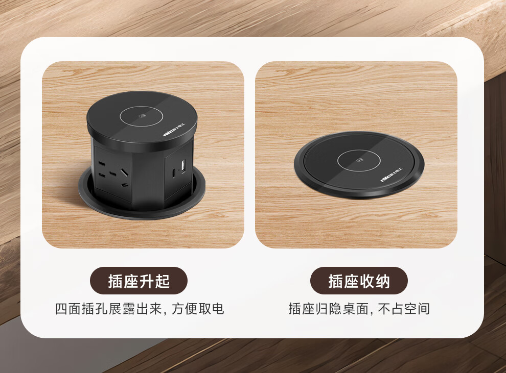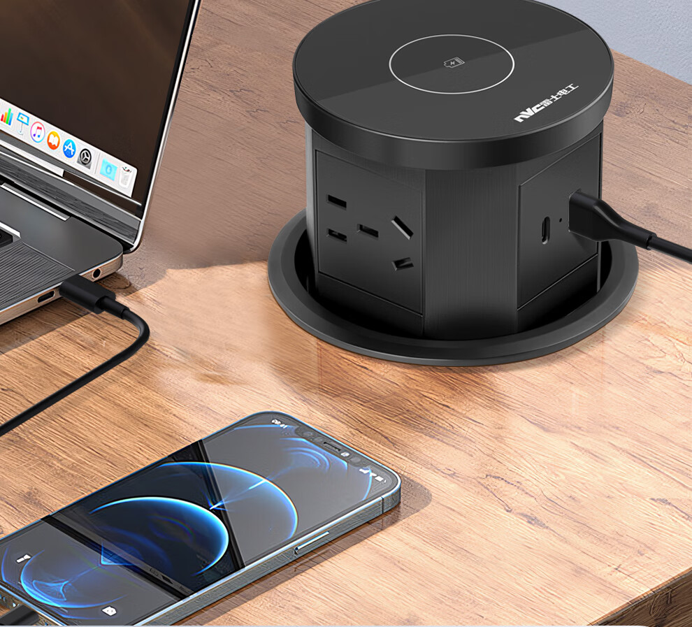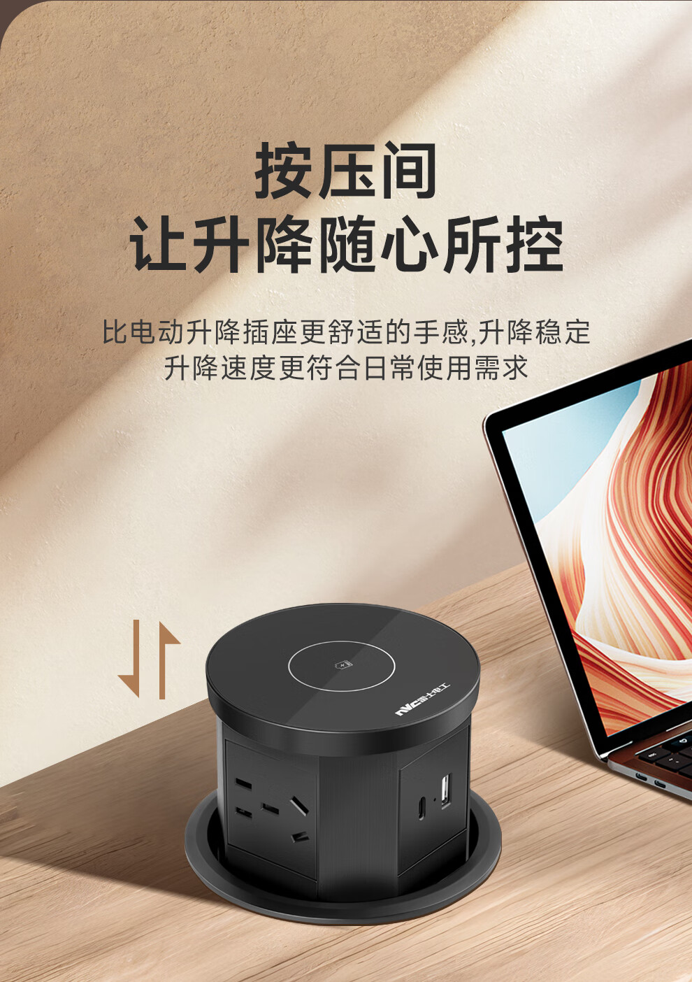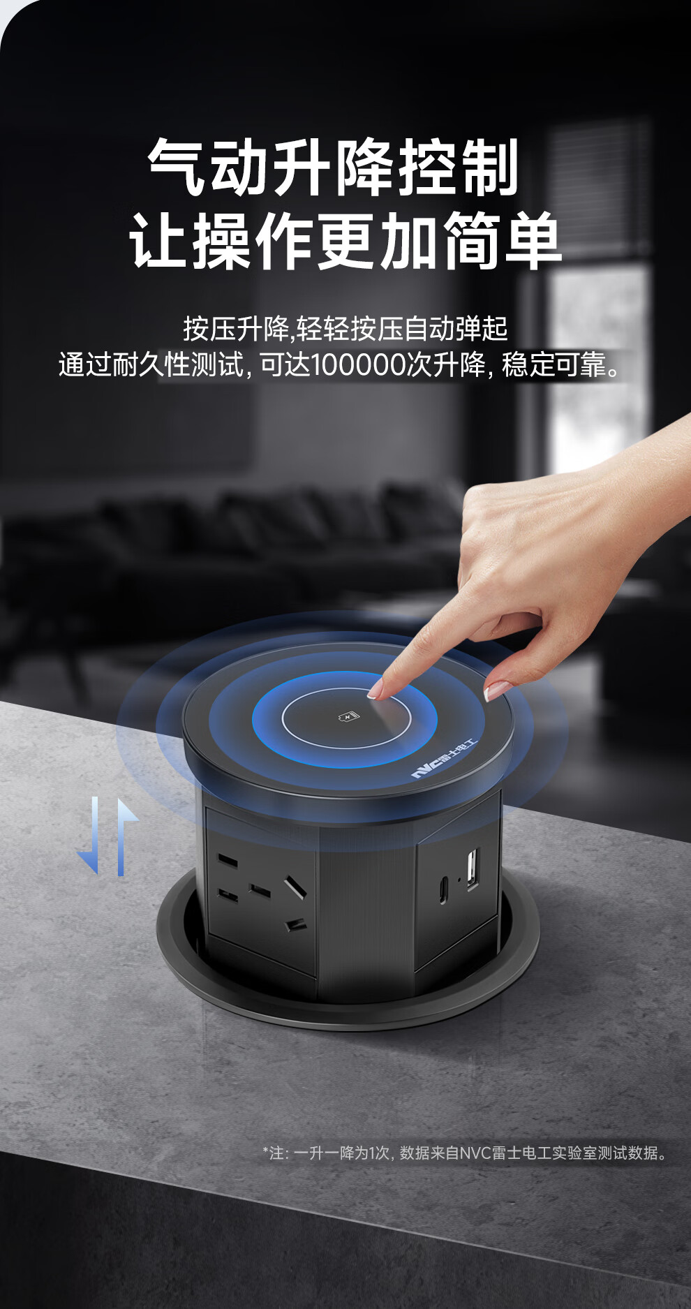 NVC雷士电工 升降插座 气动嵌入式无线充电插座 三位五孔带USB+TypeC 黑色
