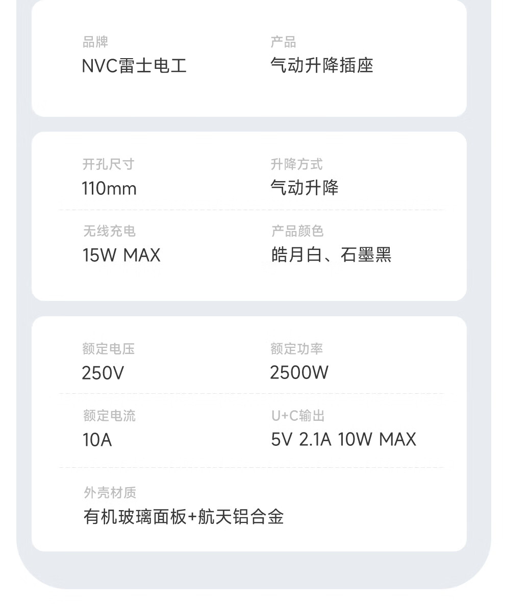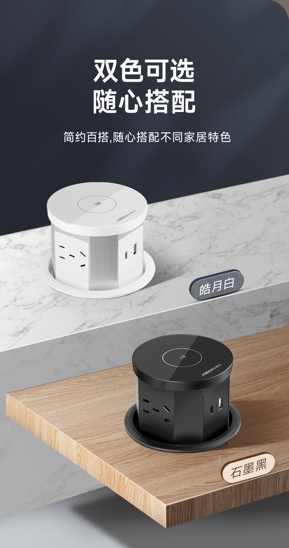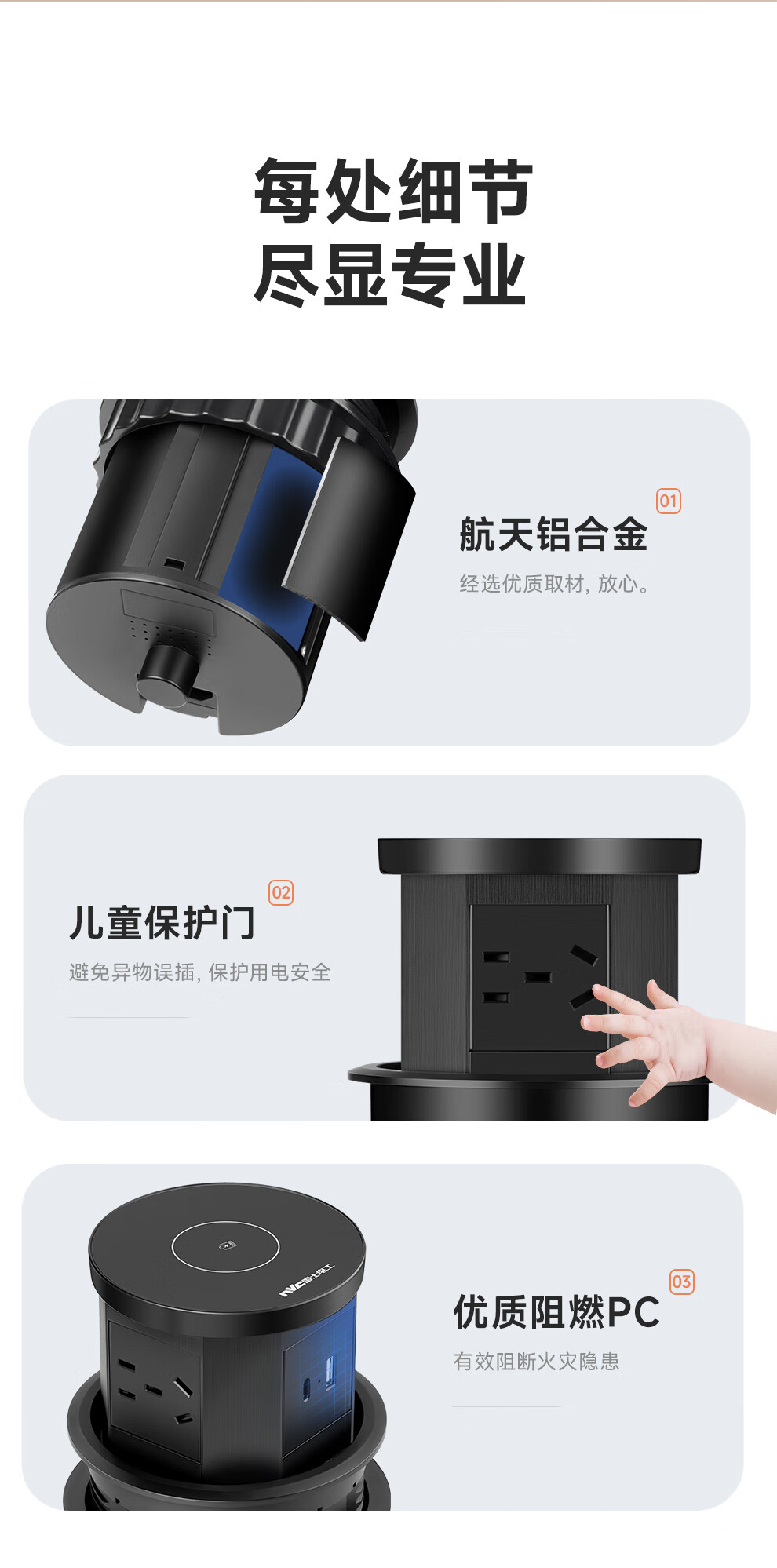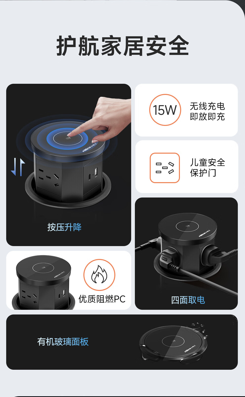 NVC雷士电工 升降插座 气动嵌入式无线充电插座 三位五孔带USB+TypeC 黑色